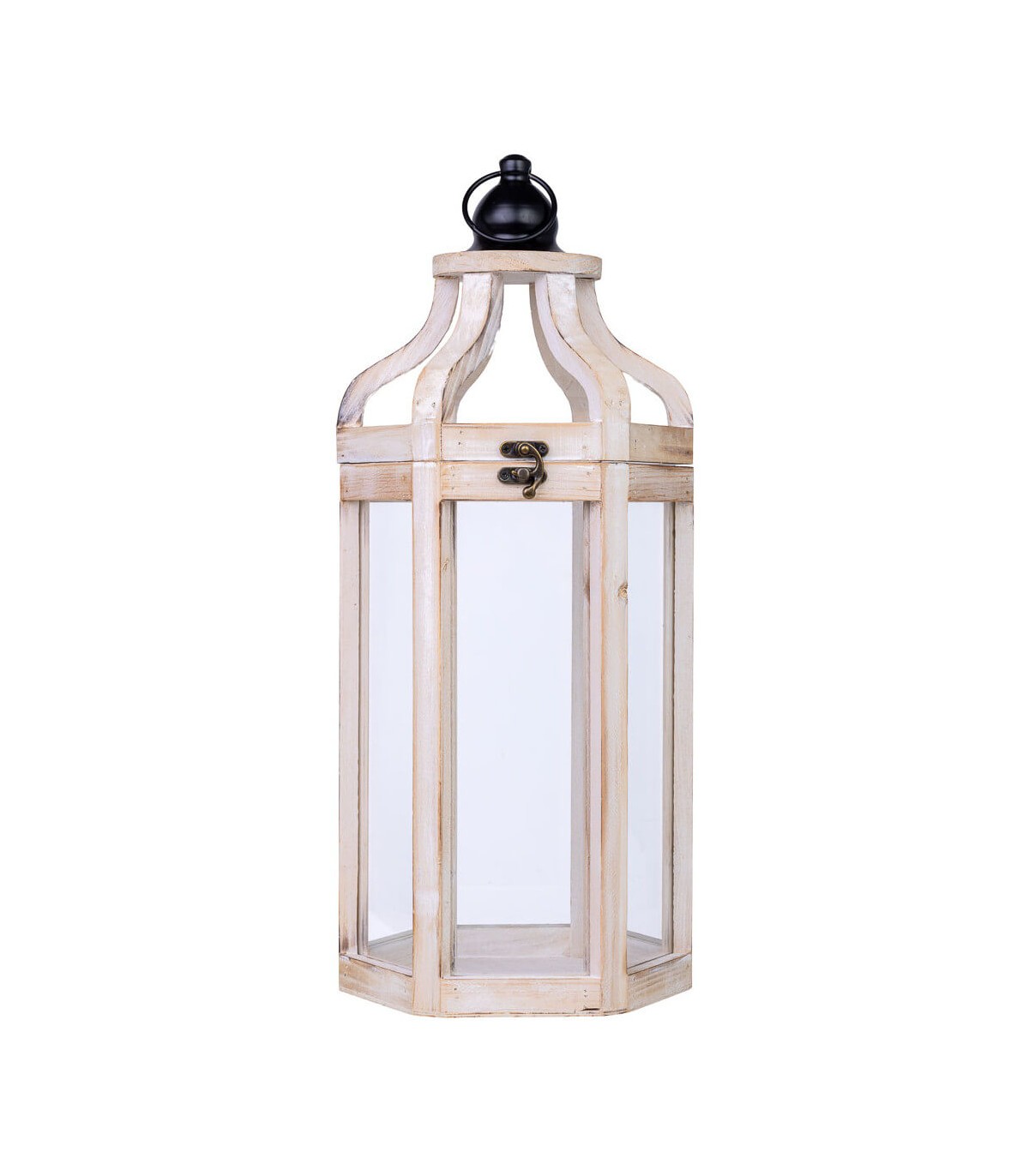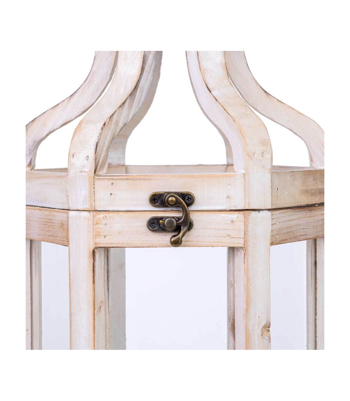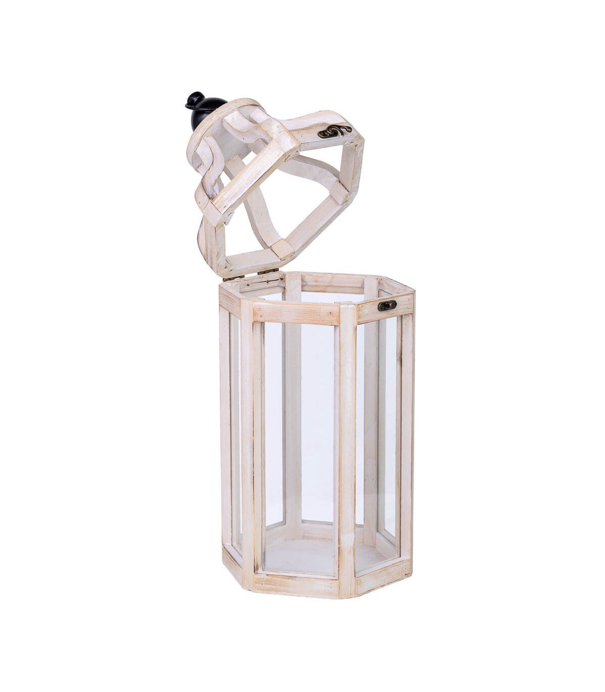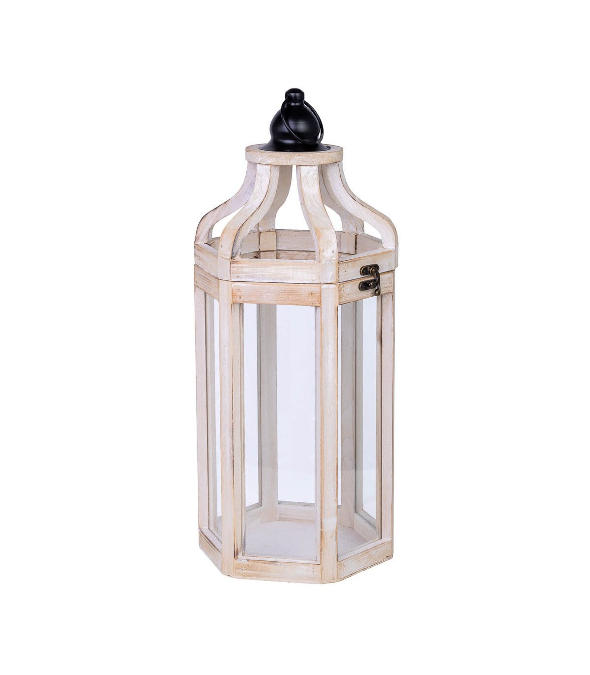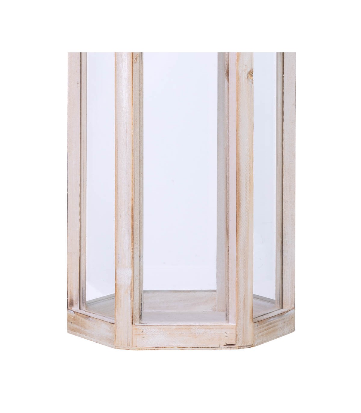 Farol alto con estructura facetada de inspiración clásica, ideal para iluminar con calidez interiores o terrazas cubiertas. La base de madera en blanco rozado aporta ligereza visual, mientras el cristal transparente enmarca la luz con elegancia.