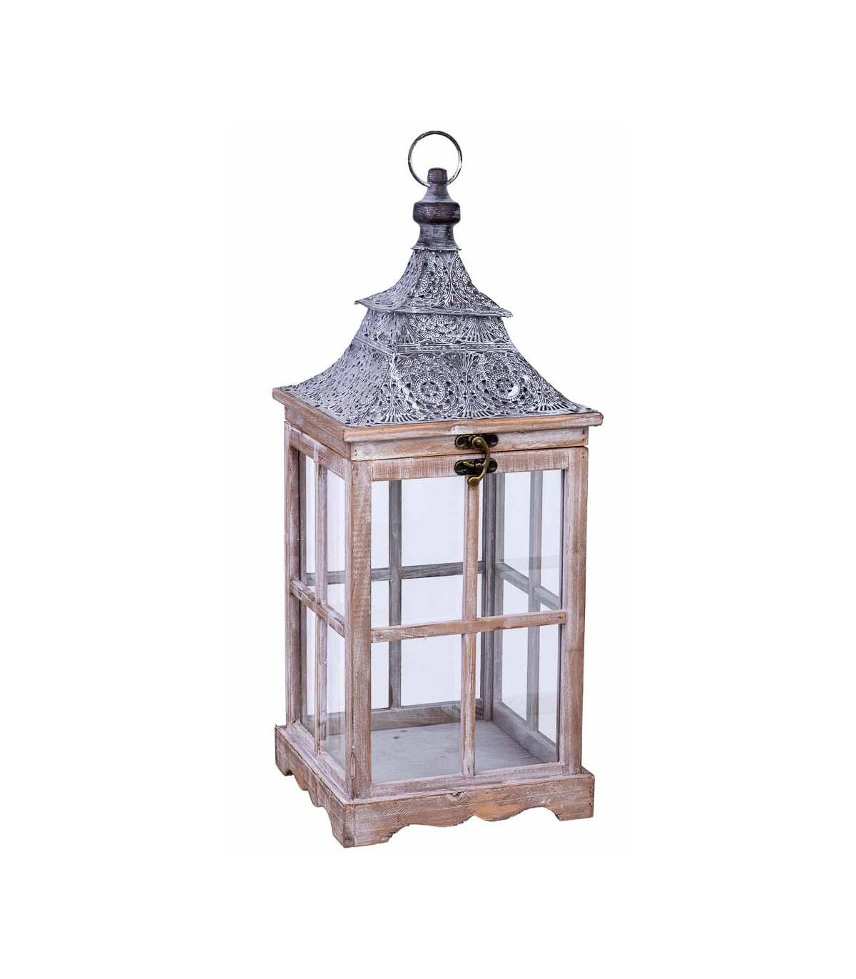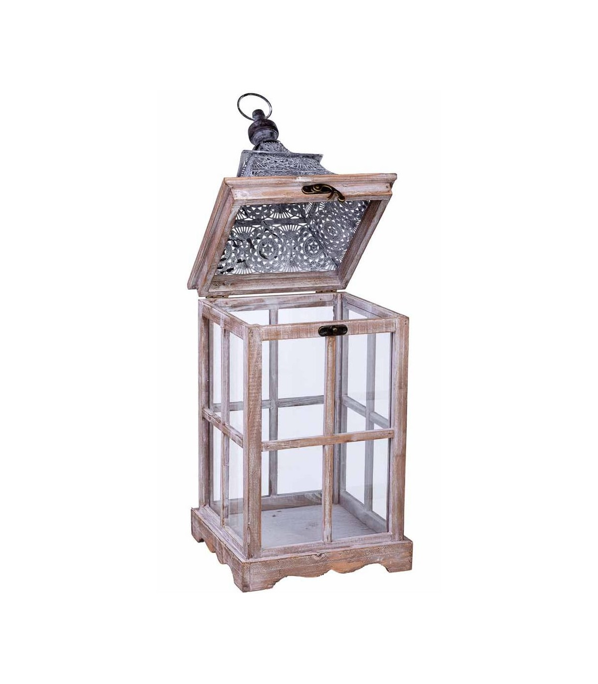 Este elegante farol decorativo es una pieza con alma, ideal para crear ambientes cálidos con un toque romántico. Su estructura en madera natural patinada en blanco combina a la perfección con el remate superior en metal repujado gris, de diseño ornamental minuciosamente trabajado.