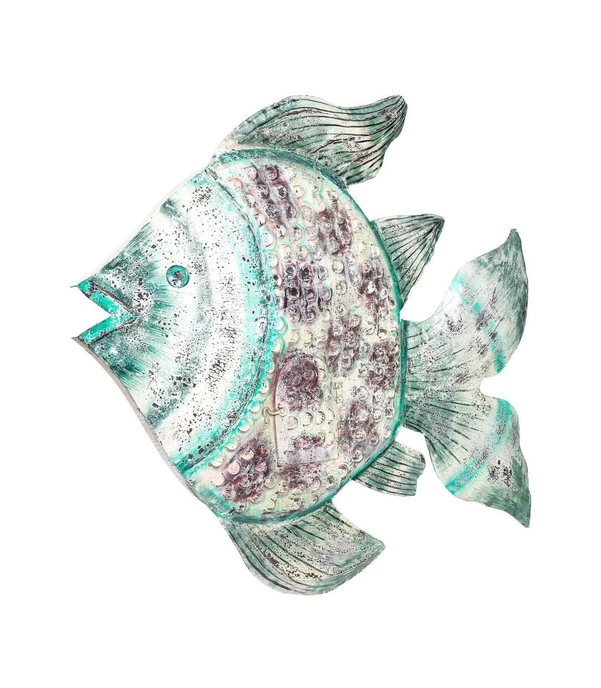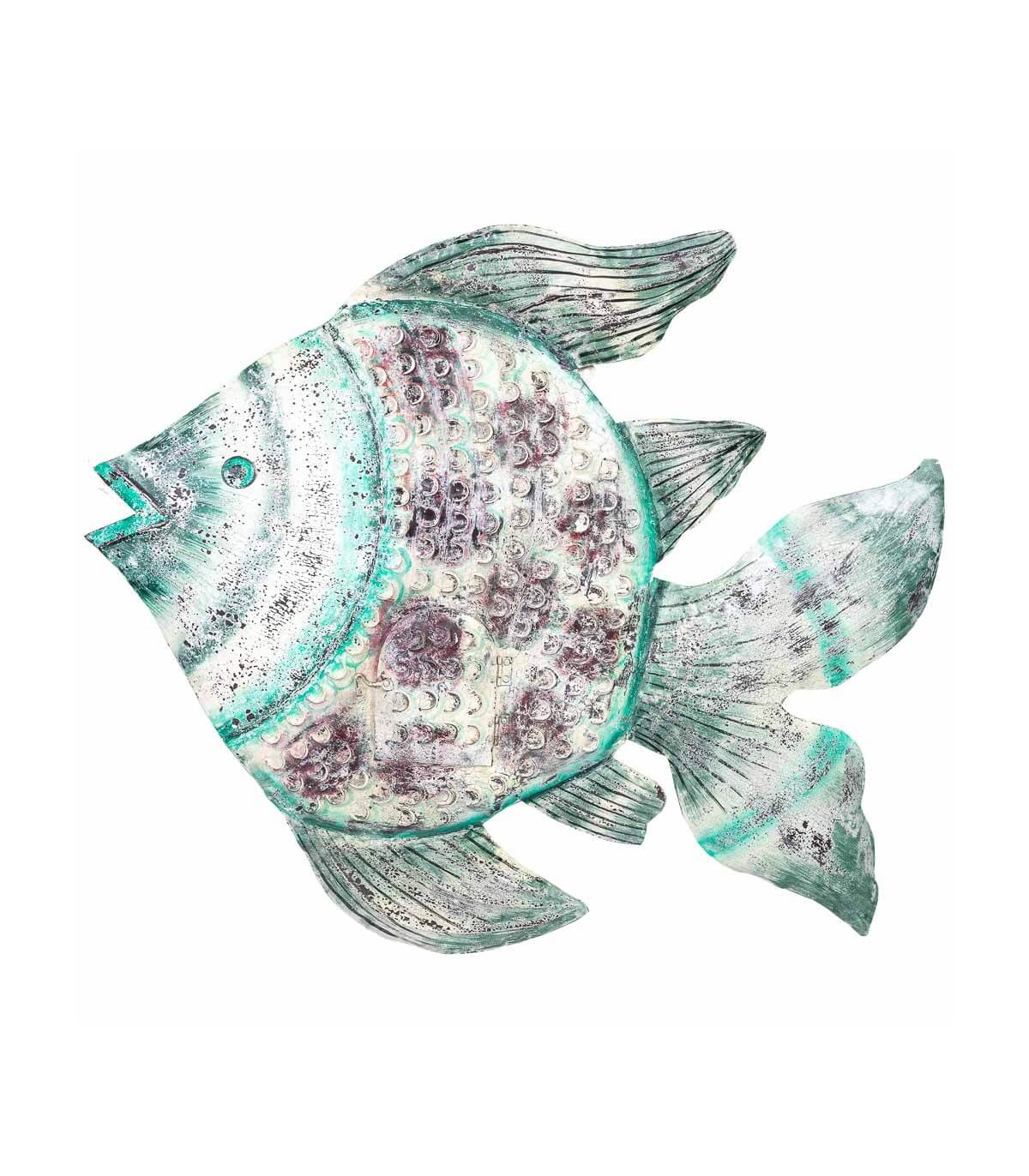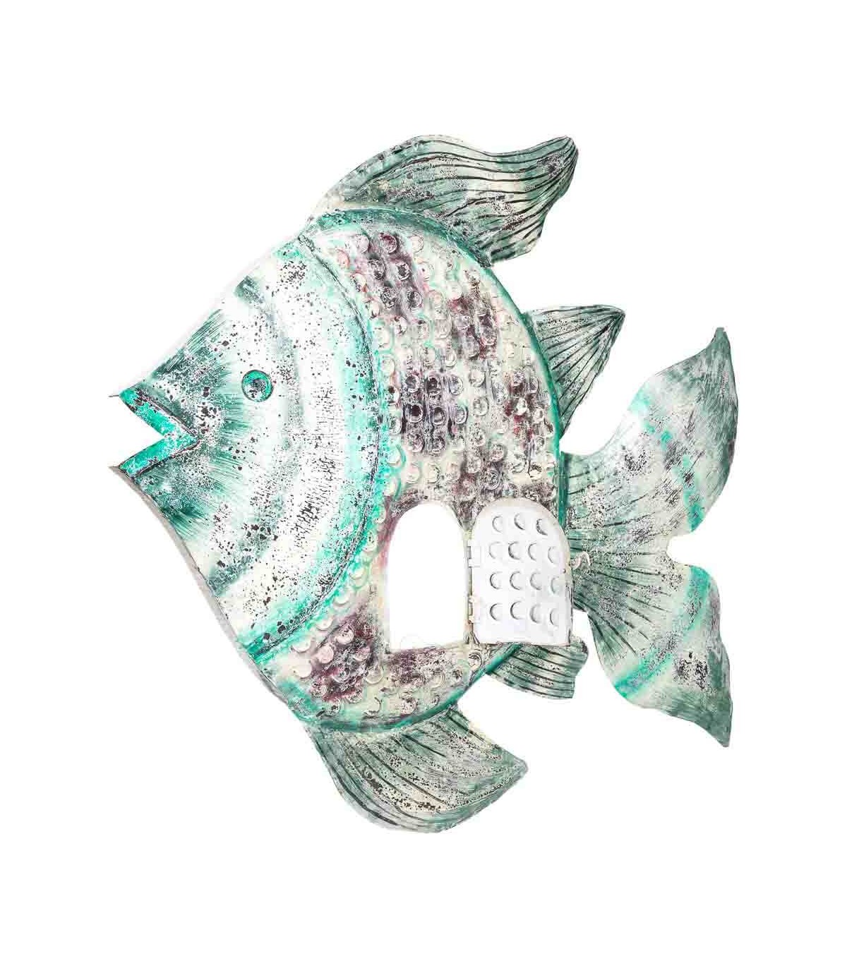 Aporta un toque exótico y vibrante con este original porta velas XXL en forma de pez, realizado íntegramente en metal y decorado a mano. Su estética artesanal combina detalles repujados, una pequeña puerta abatible y una paleta de colores envejecidos en beige, turquesa y morado que le dan personalidad propia. Ideal para crear composiciones en terrazas cubiertas, salones boho o recibidores con alma viajera. Perfecto como pieza de acento que fusiona función y arte decorativo.