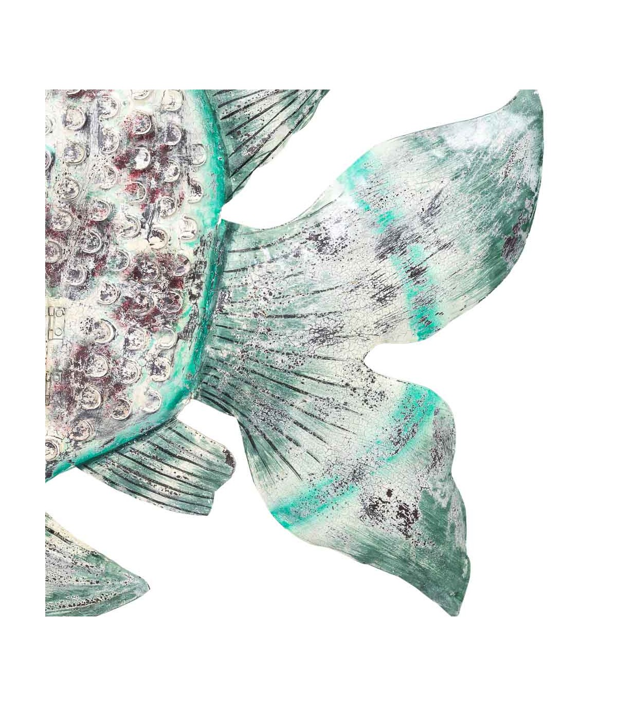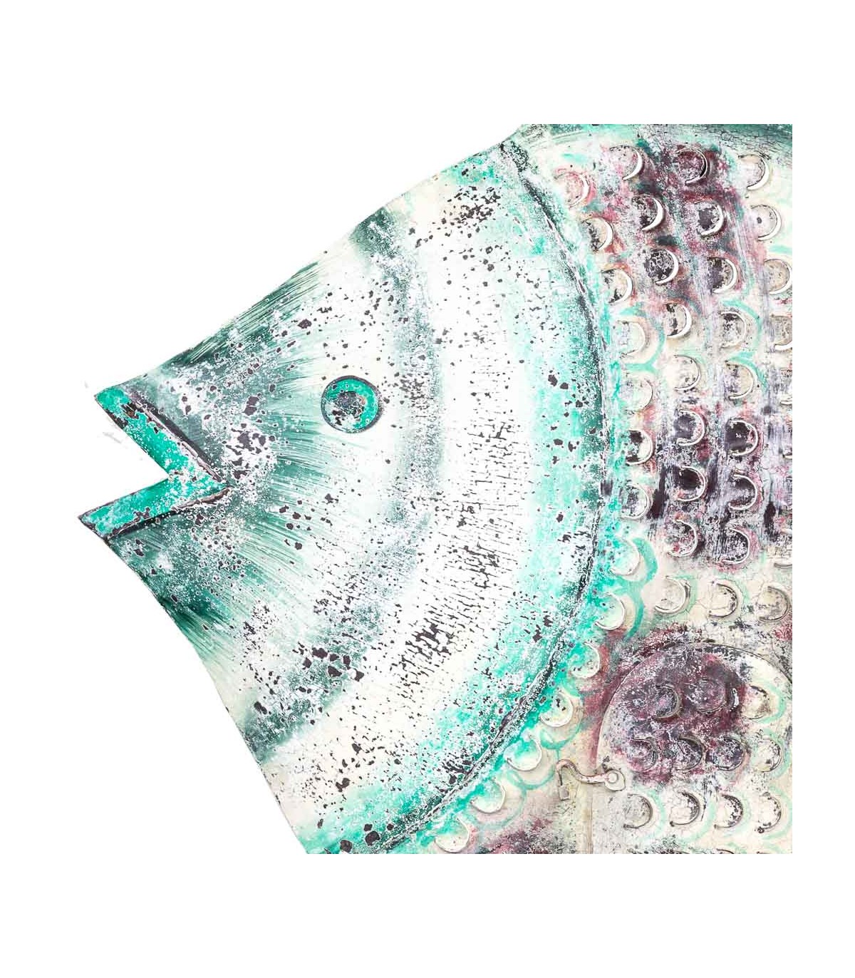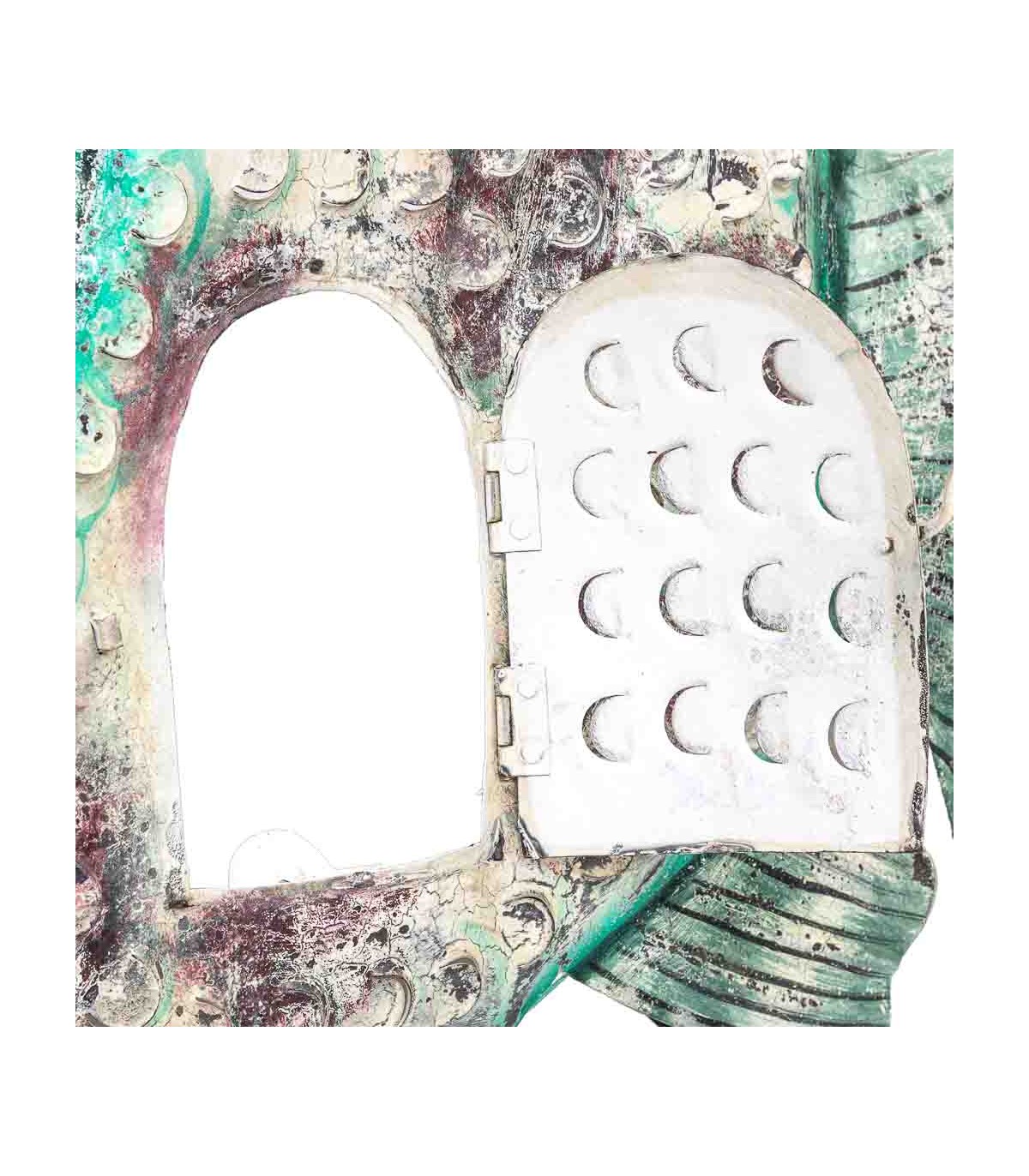 Aporta un toque exótico y vibrante con este original porta velas XXL en forma de pez, realizado íntegramente en metal y decorado a mano. Su estética artesanal combina detalles repujados, una pequeña puerta abatible y una paleta de colores envejecidos en beige, turquesa y morado que le dan personalidad propia. Ideal para crear composiciones en terrazas cubiertas, salones boho o recibidores con alma viajera. Perfecto como pieza de acento que fusiona función y arte decorativo.