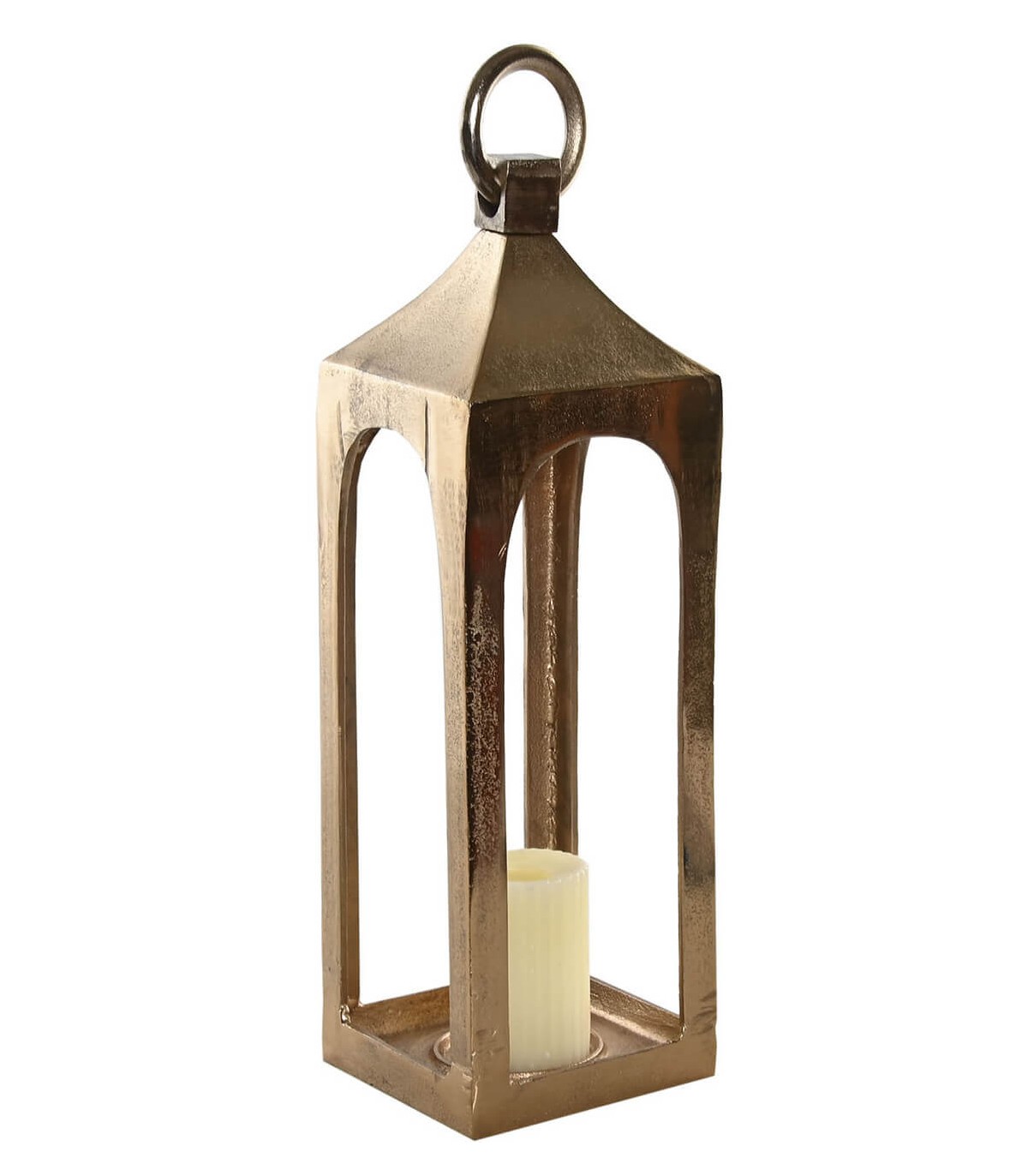 Este portavelas alto con cuerpo metálico y acabado dorado texturizado es ideal para aportar un toque sofisticado y cálido a cualquier ambiente. Su diseño clásico, con líneas arqueadas y estructura abierta, permite jugar con la luz de una vela real o LED, creando atmósferas íntimas y elegantes.