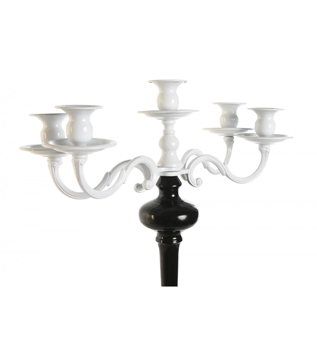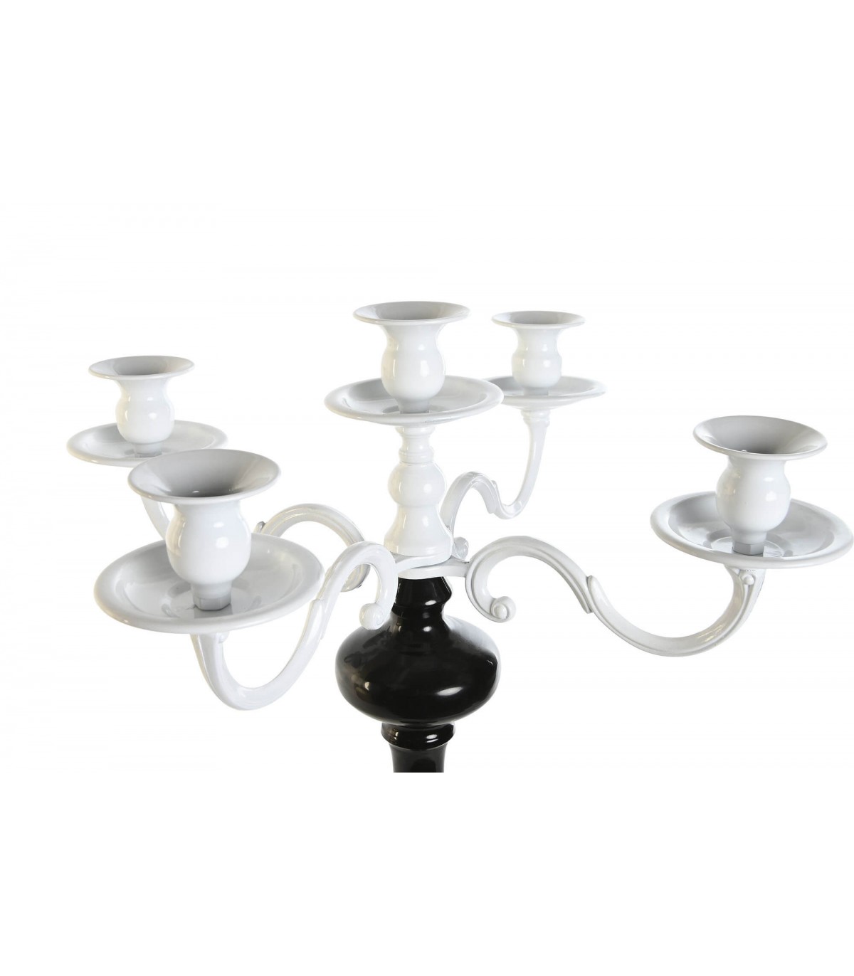 Este sofisticado portavelas de cinco brazos presenta una silueta clásica con un atractivo contraste entre el negro y el blanco, aportando equilibrio, elegancia y un aire majestuoso a cualquier espacio.