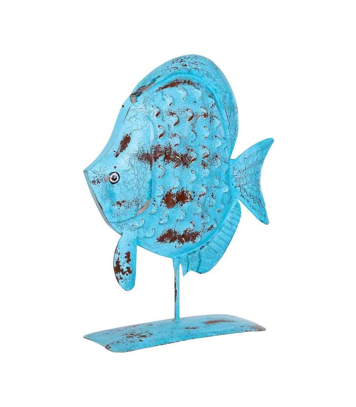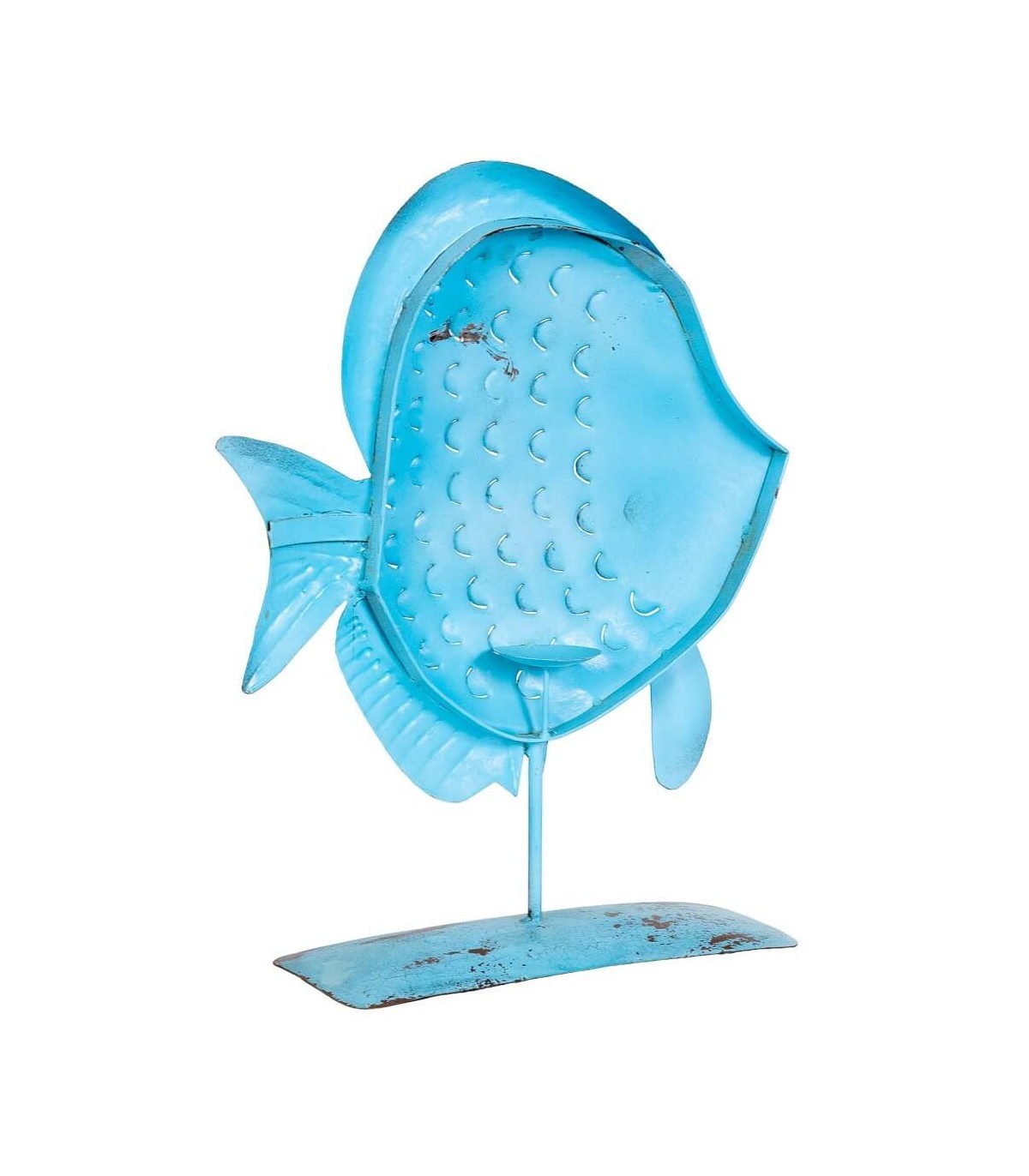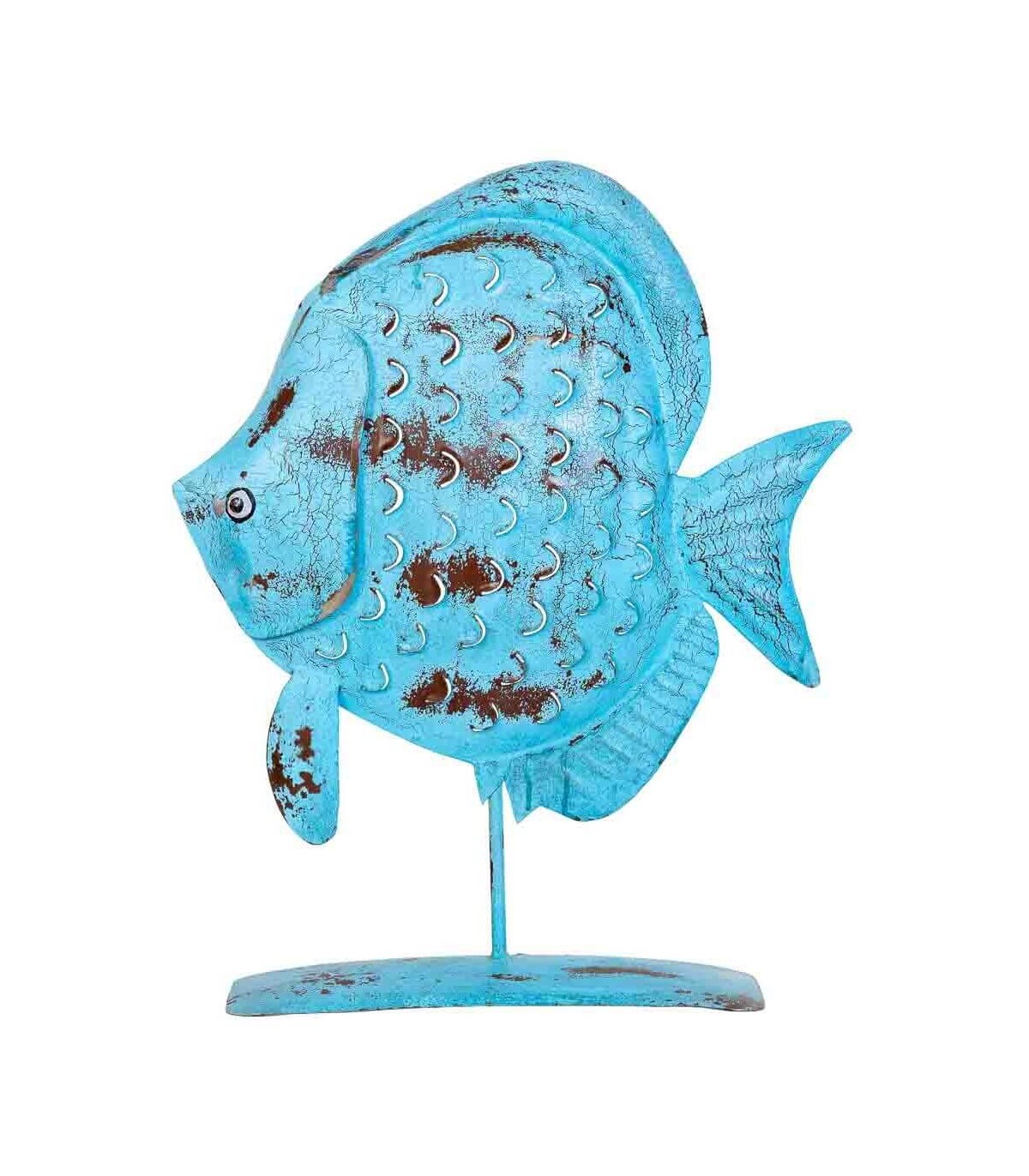 Figura decorativa porta velas en forma de pez tropical, realizada en metal y decorada a mano con pintura azul de efecto envejecido. Su estética exótica y color vibrante lo convierten en una pieza perfecta para añadir un toque de frescura marina y carácter artesanal a salones, terrazas o entradas.