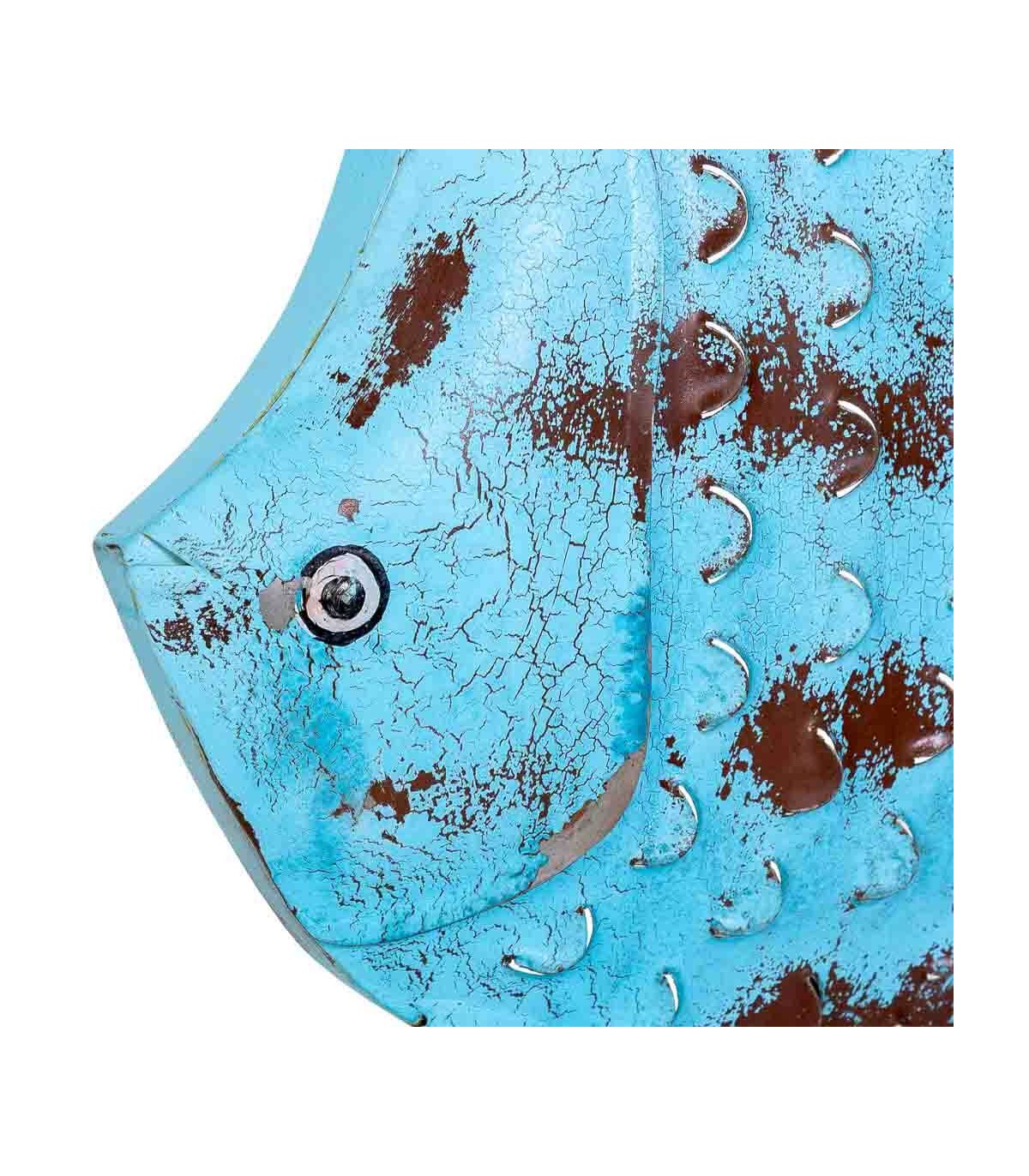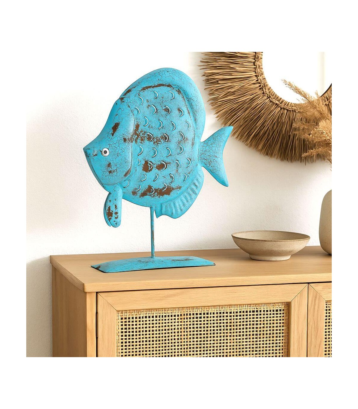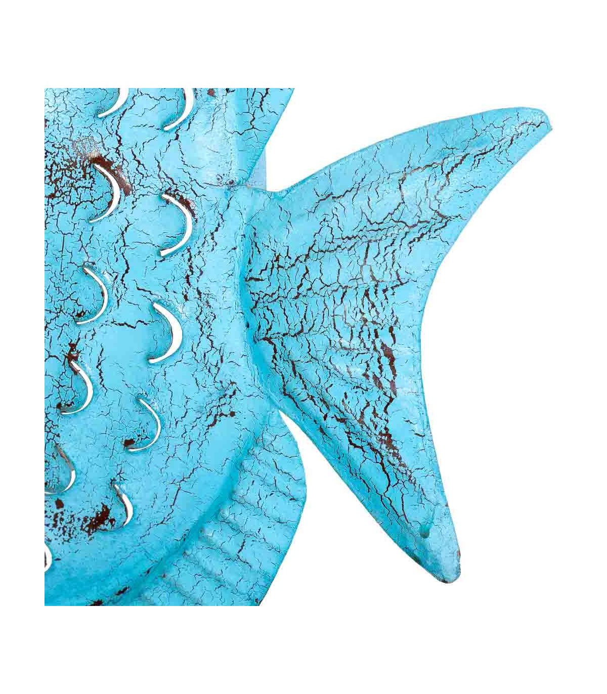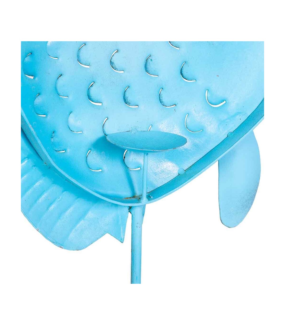 Figura decorativa porta velas en forma de pez tropical, realizada en metal y decorada a mano con pintura azul de efecto envejecido. Su estética exótica y color vibrante lo convierten en una pieza perfecta para añadir un toque de frescura marina y carácter artesanal a salones, terrazas o entradas.