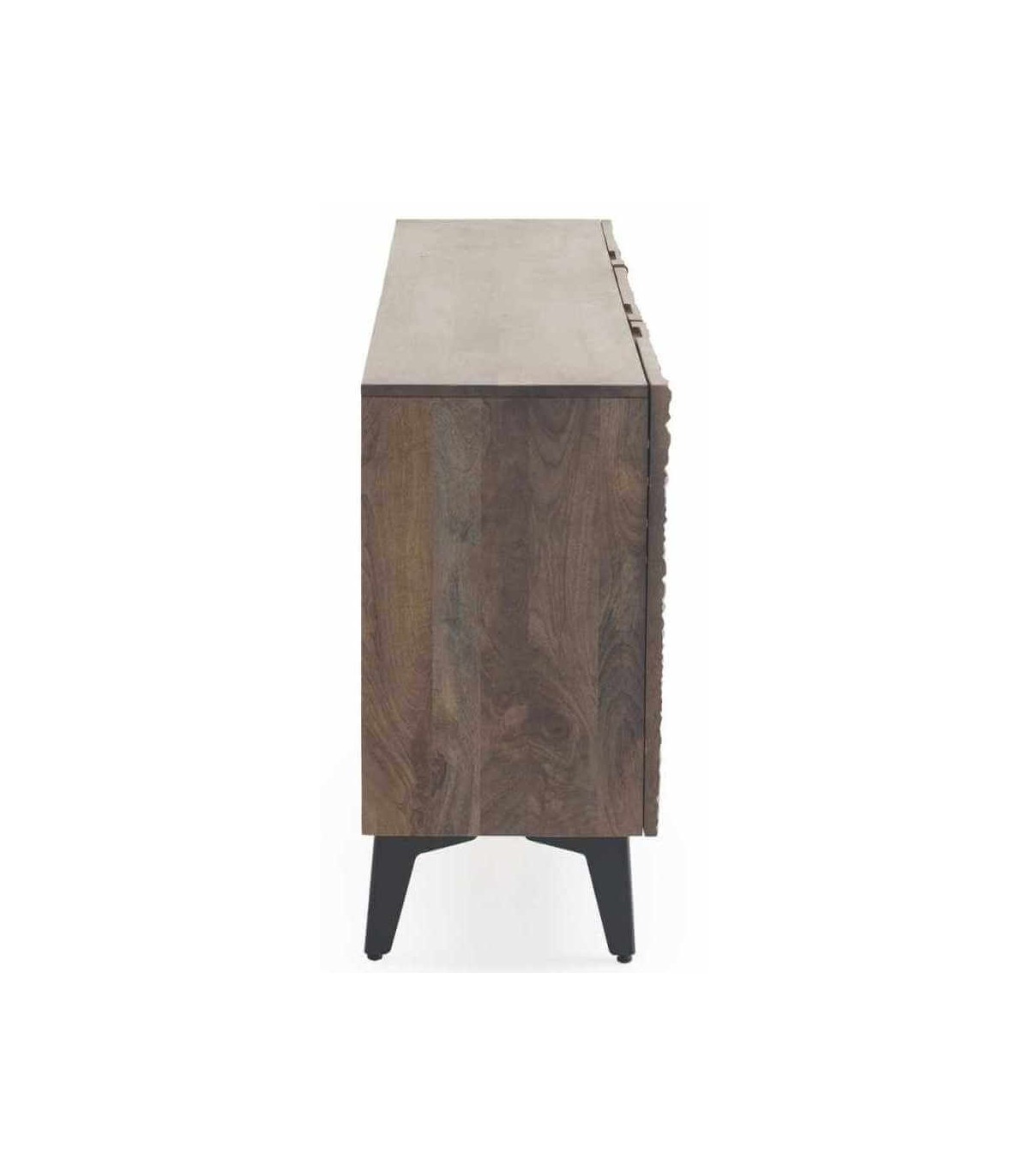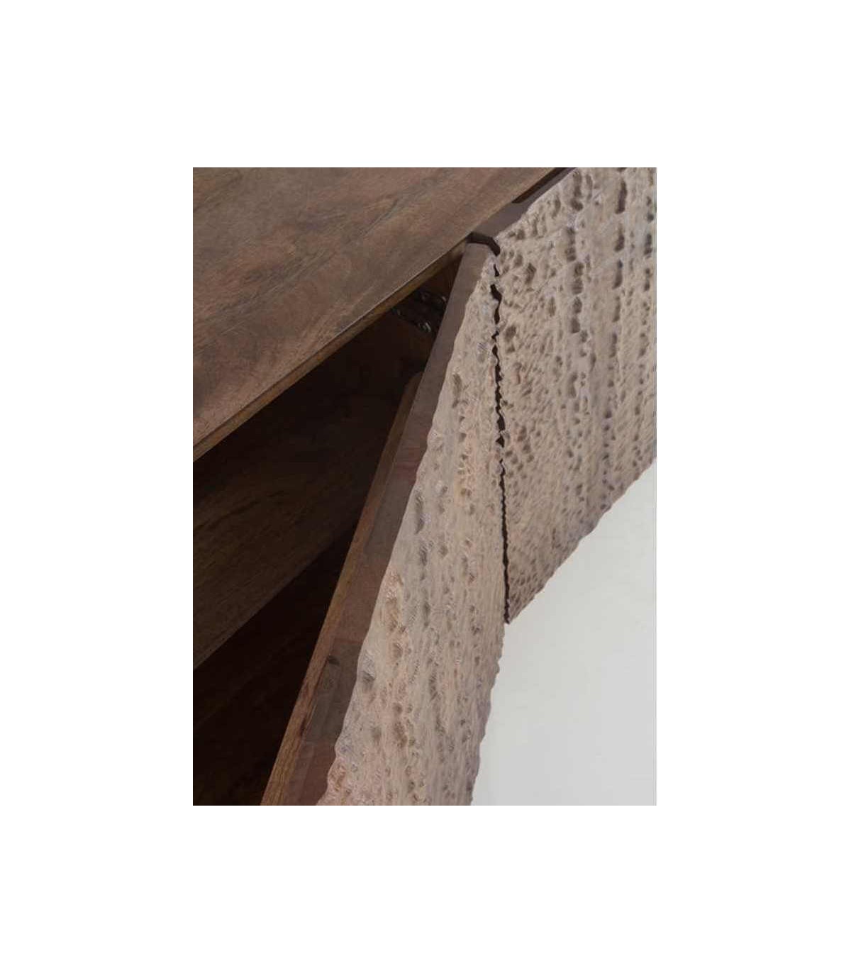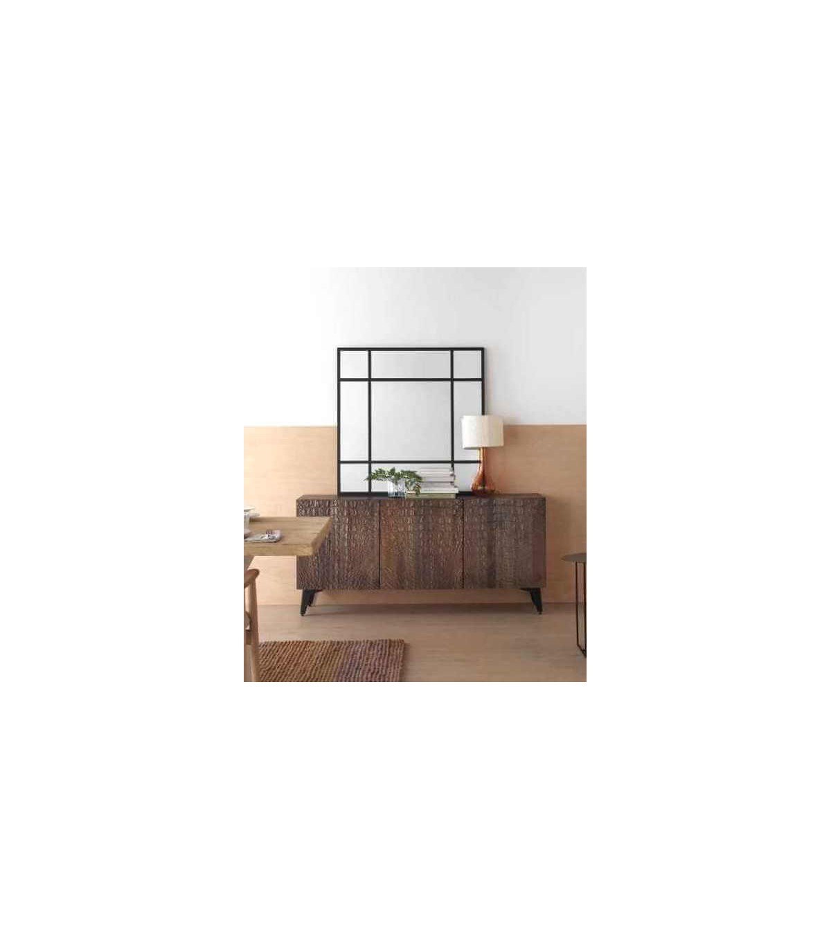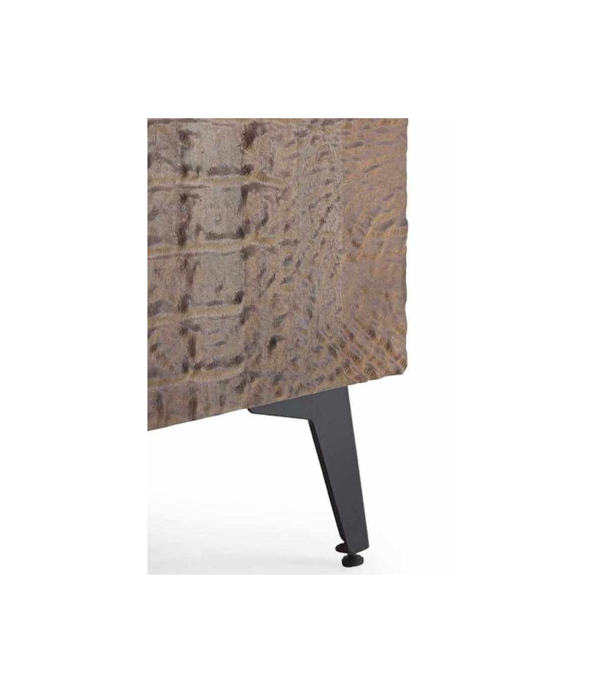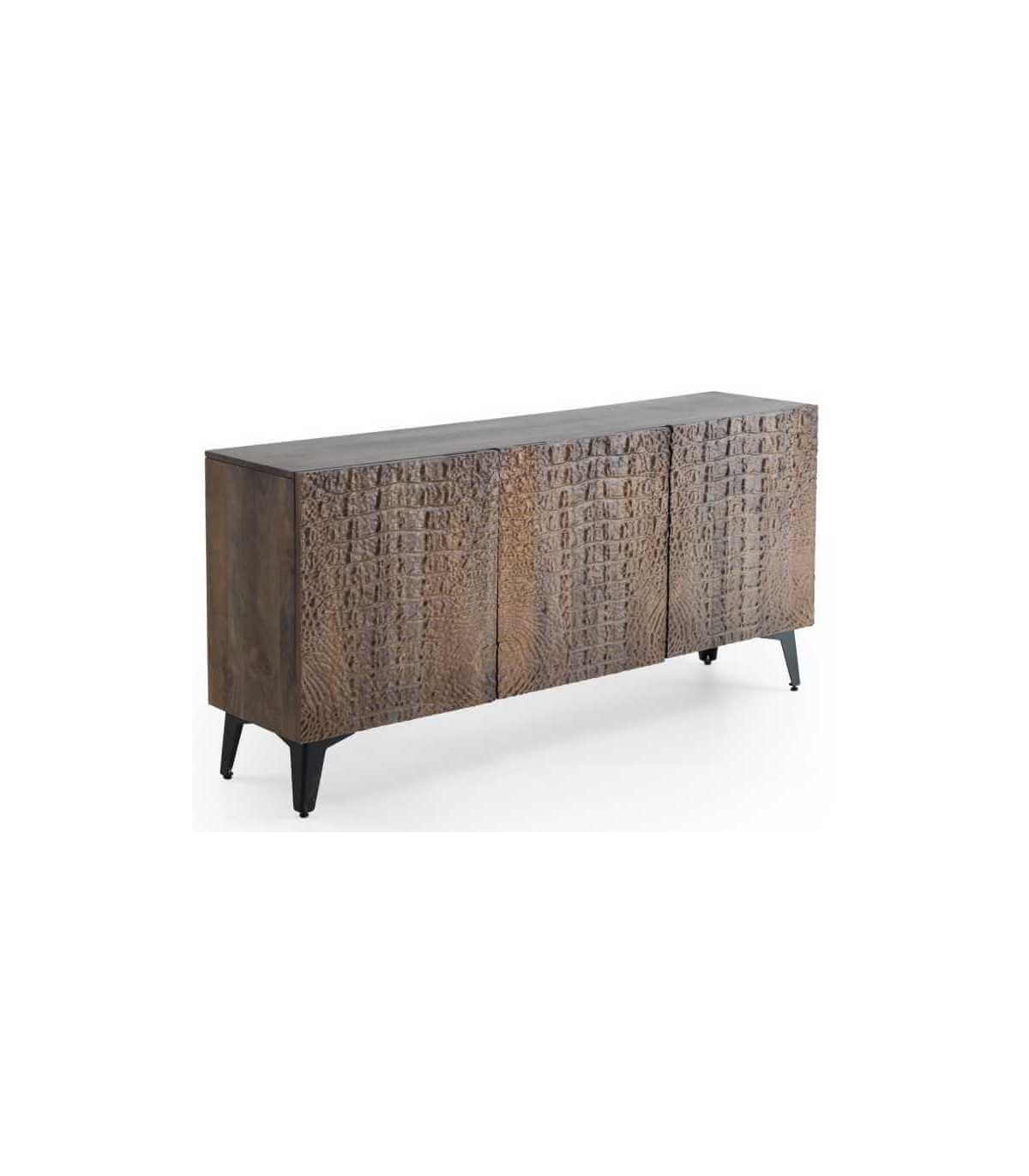 Aparador muy original, realizado en madera de mango con los frentes de la puertas imitando la piel del caimán con relieve y las patas en metal negro, un mueble hecho para ser el centro de atención.