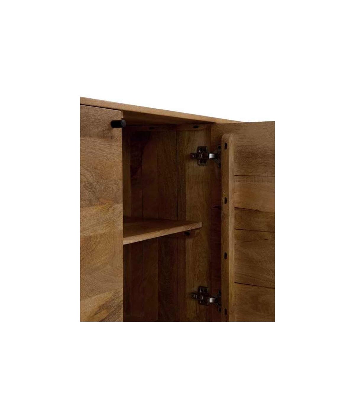 Este aparador de estilo industrial combina a la perfección la calidez de la madera maciza de mango con la solidez del metal negro en sus patas y tiradores. Sus 4 puertas ofrecen un amplio espacio de almacenamiento, ideal para mantener tu hogar organizado.