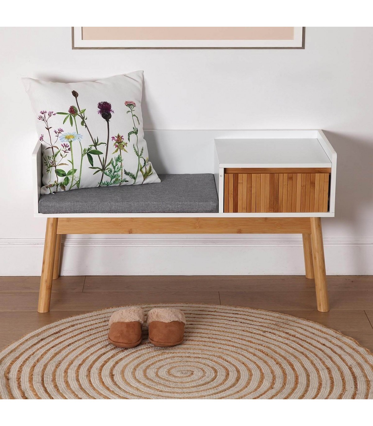 Banco descalzador de estilo nórdico acabado blanco, bambú natural y un cómodo cojín de asiento tapizado en color gris, perfecto para tu habitación o tu hall de entrada.