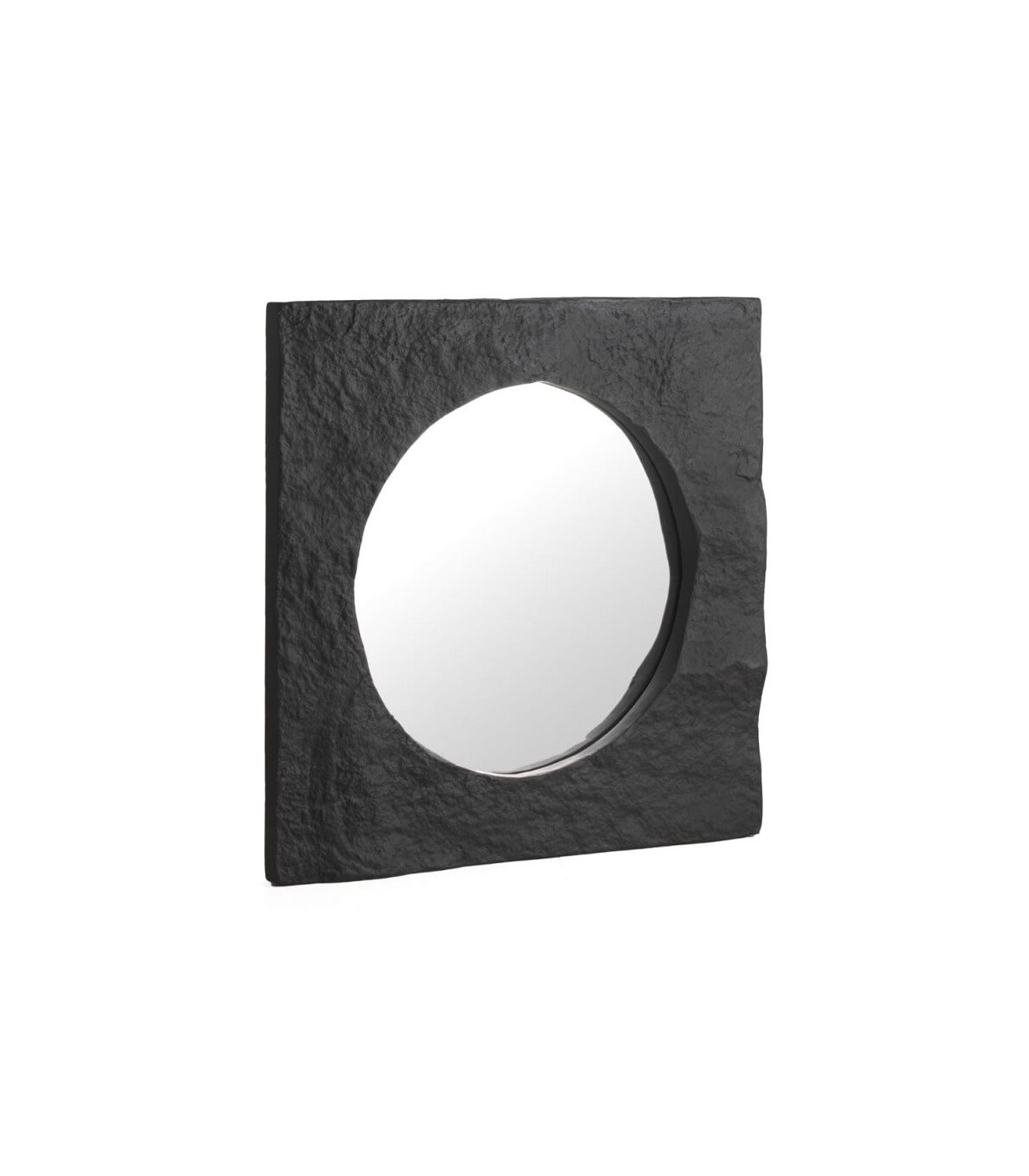 Espejo cuadrado realizado en poli resina imitación roca negra. Un espejo que tiene la consola a juego, creando un conjunto con mucho caráter, para espacios con personalidad.