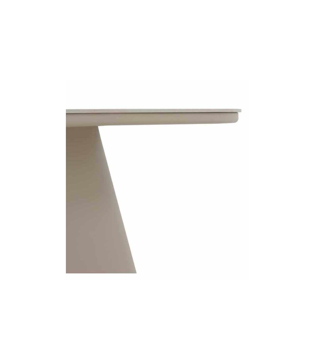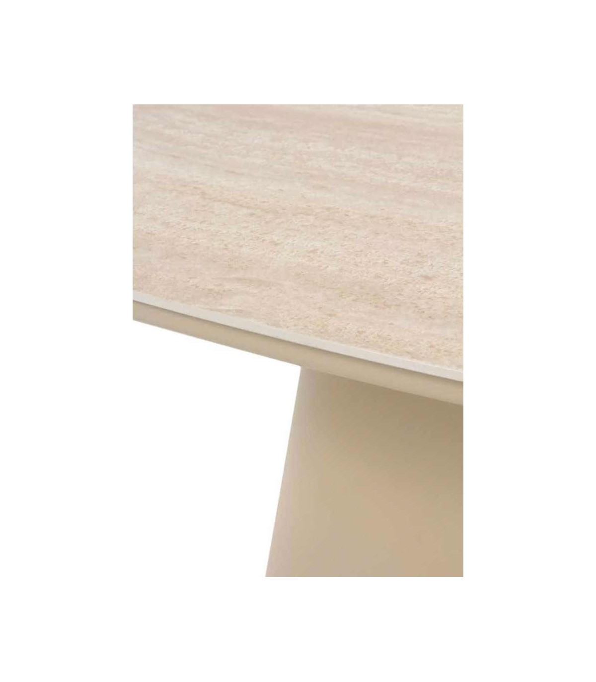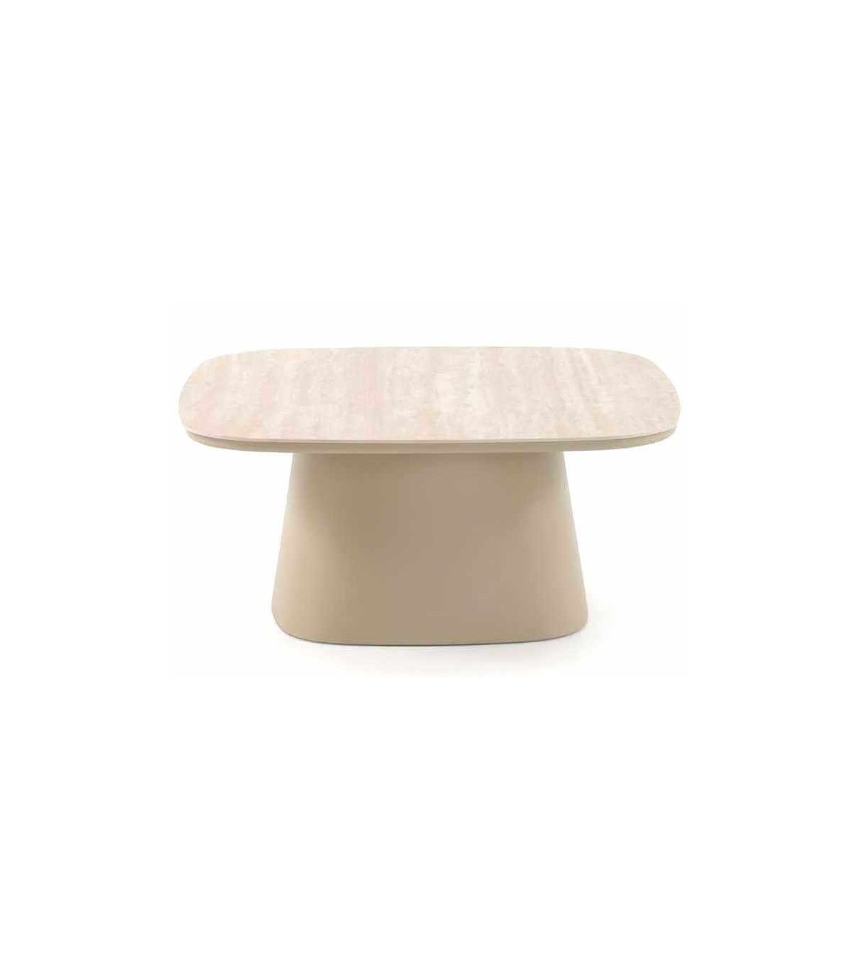 Mesa de centro cuadrada fabricada en aluminio color crema con la tapa en cerámica imitación travertino a poro cerrado.