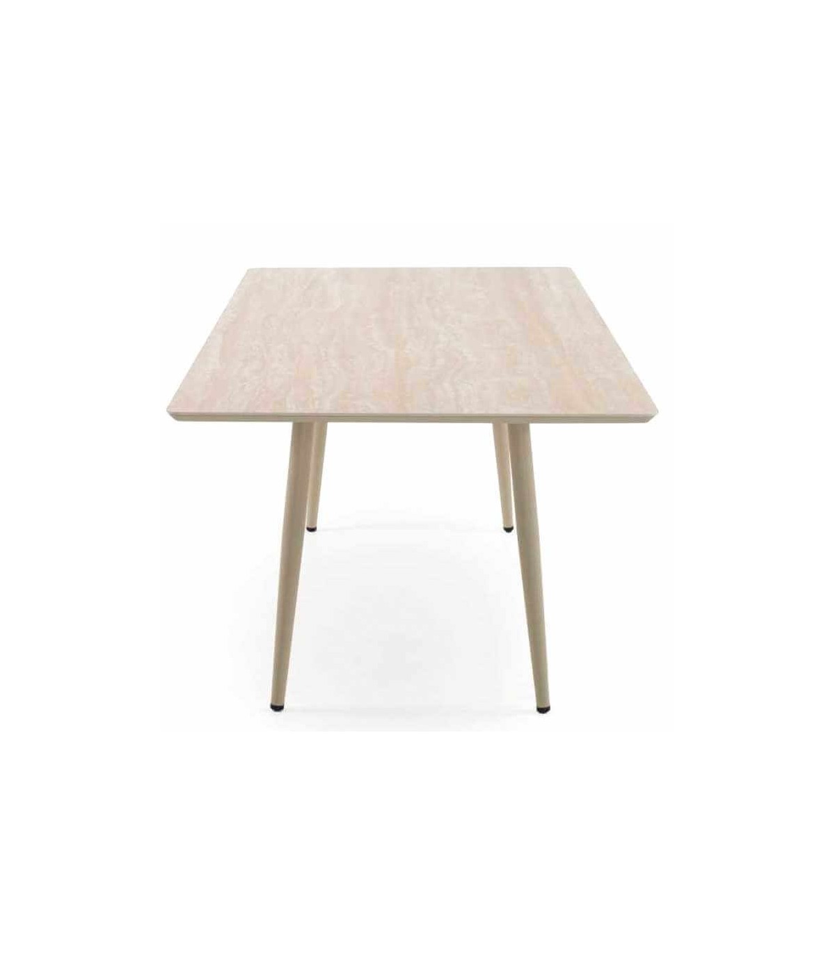 Transforma tu terraza o jardín con esta mesa de comedor rectangular grande para exterior, perfecta para reuniones al aire libre. Su resistente estructura de metal en color crema garantiza estabilidad y durabilidad, mientras que su tapa de cerámica de alta calidad con acabado imitación travertino añade un toque de sofisticación natural.