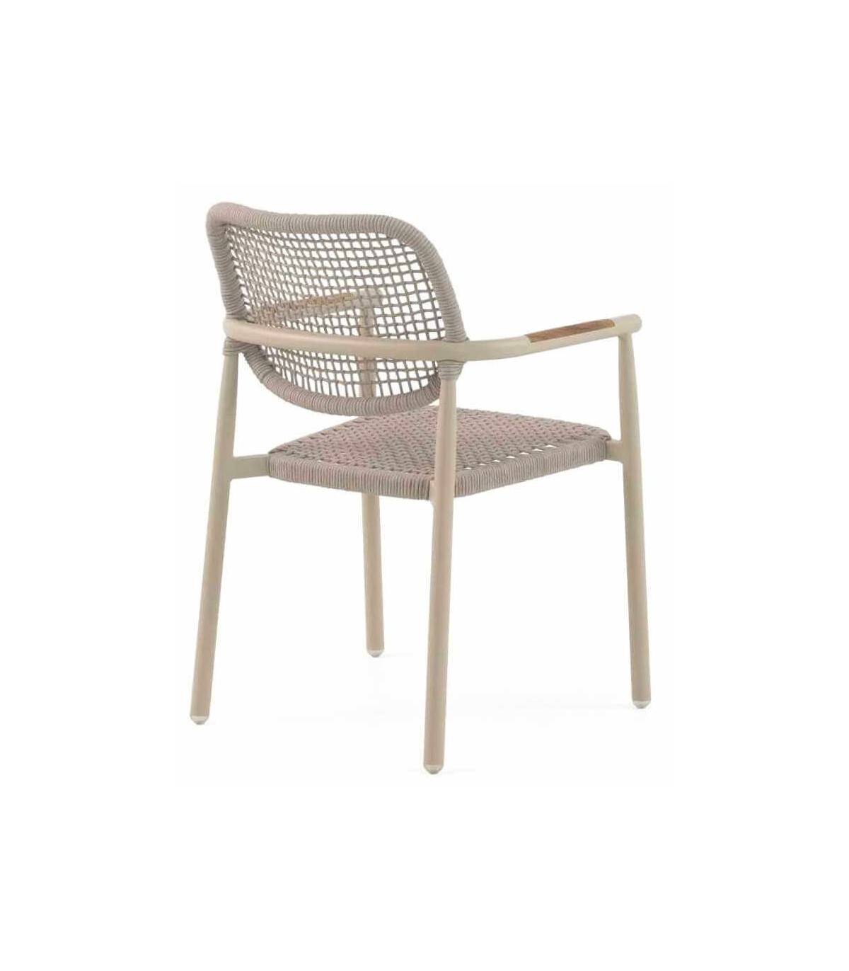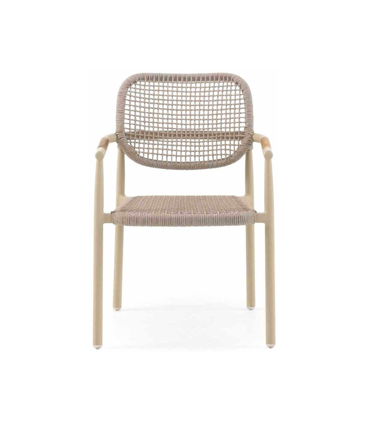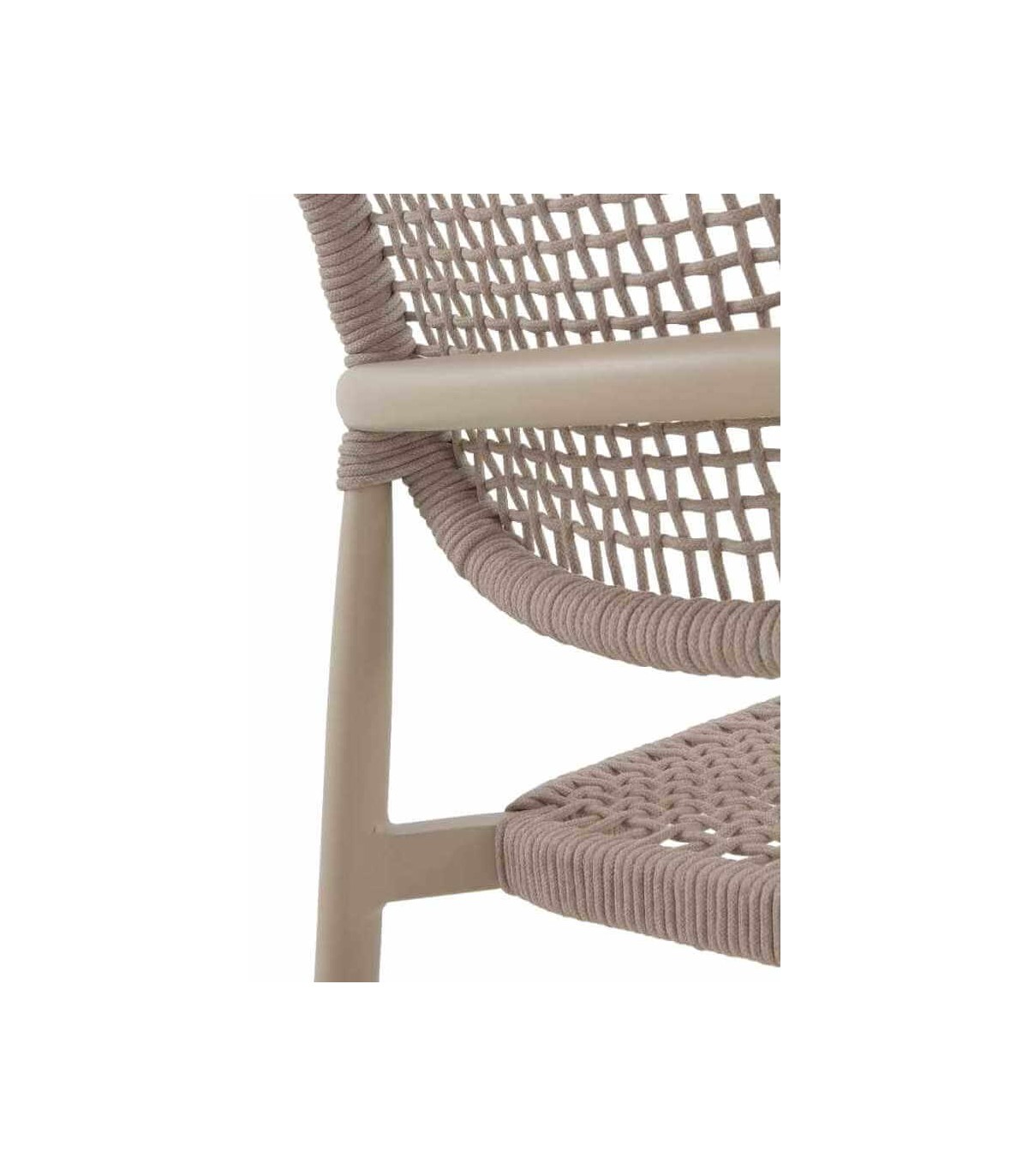 El respaldo y el asiento están realizados con cuerda sintética en color arena, un material resistente a la humedad y a los rayos UV, que además proporciona un diseño moderno y envolvente. Gracias a su ergonomía y confort, este sillón es perfecto para jardines, terrazas, patios y espacios de hostelería como restaurantes y cafeterías.