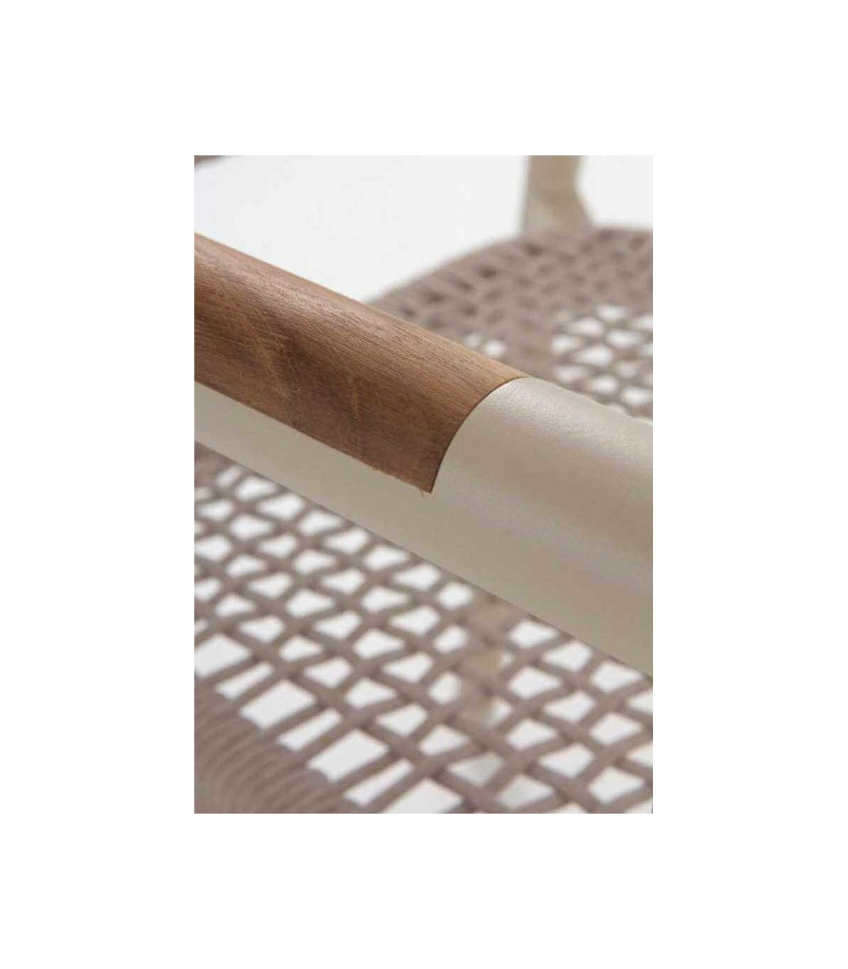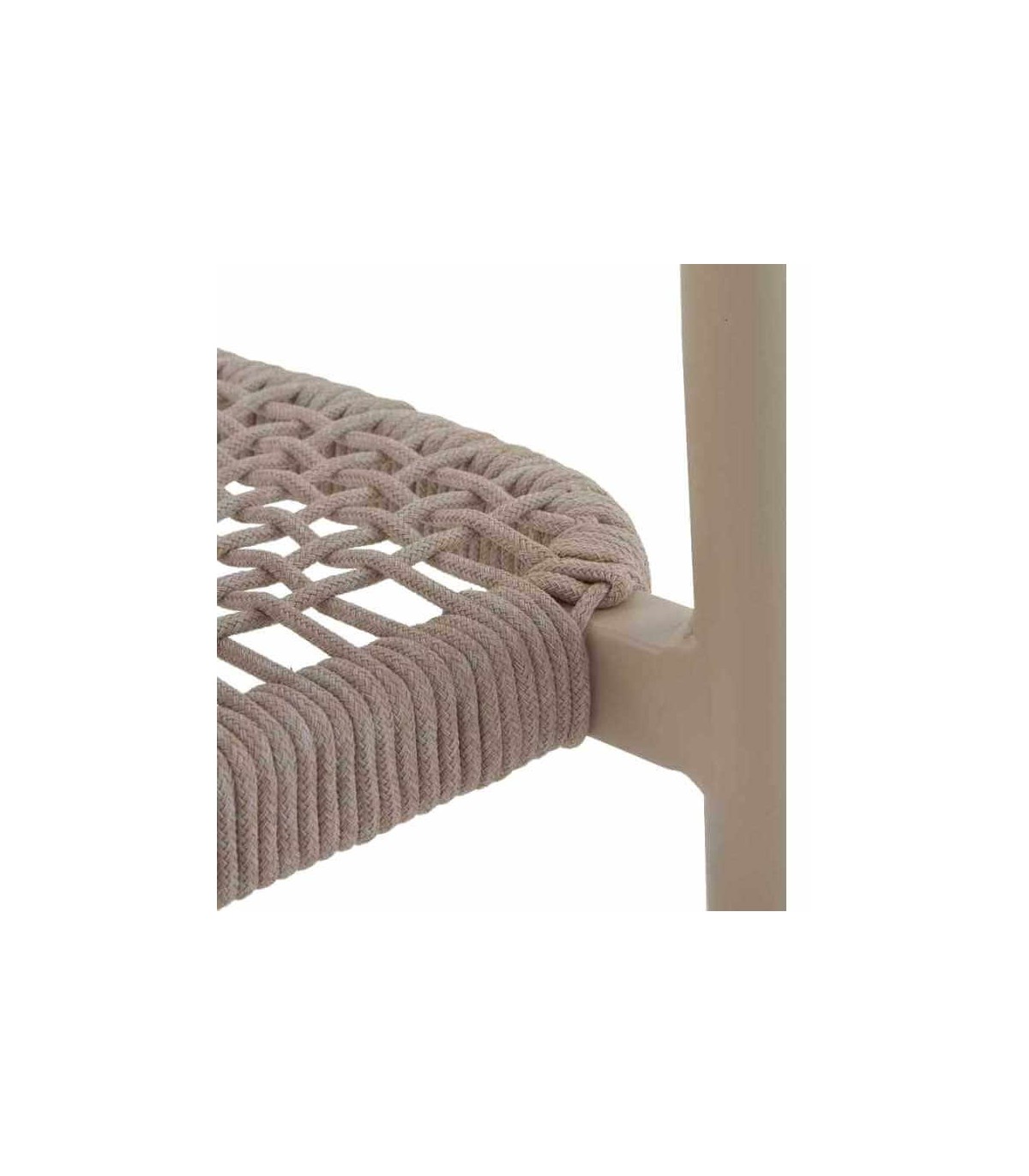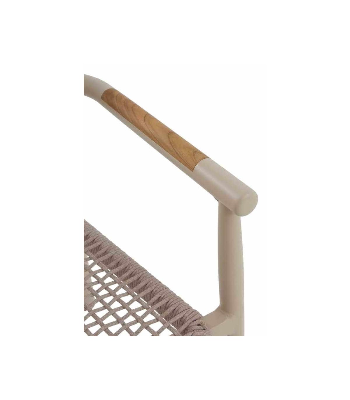 - Acabado, aluminio lacado en color crema con aplicaciones en madera natural y cuerda sintética en color arena.