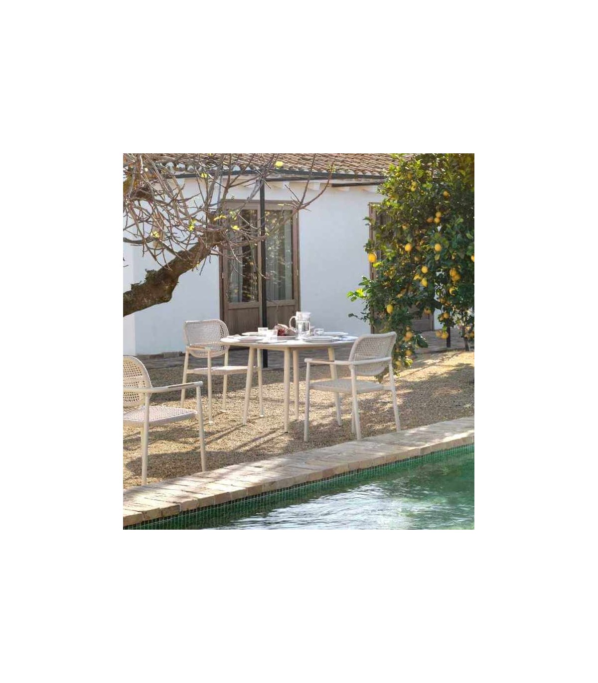 Este sillón de comedor para exterior combina diseño, confort y materiales de alta calidad, ideal para disfrutar de espacios al aire libre con estilo y comodidad. Su estructura de aluminio lacado en color crema lo hace resistente a la intemperie y ligero, mientras que las aplicaciones en madera natural aportan un toque cálido y sofisticado.