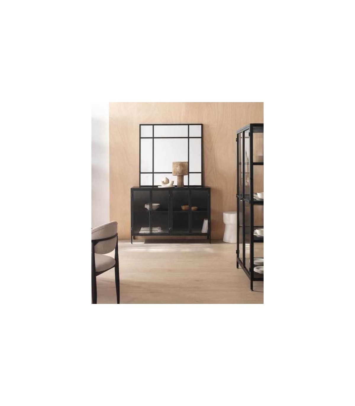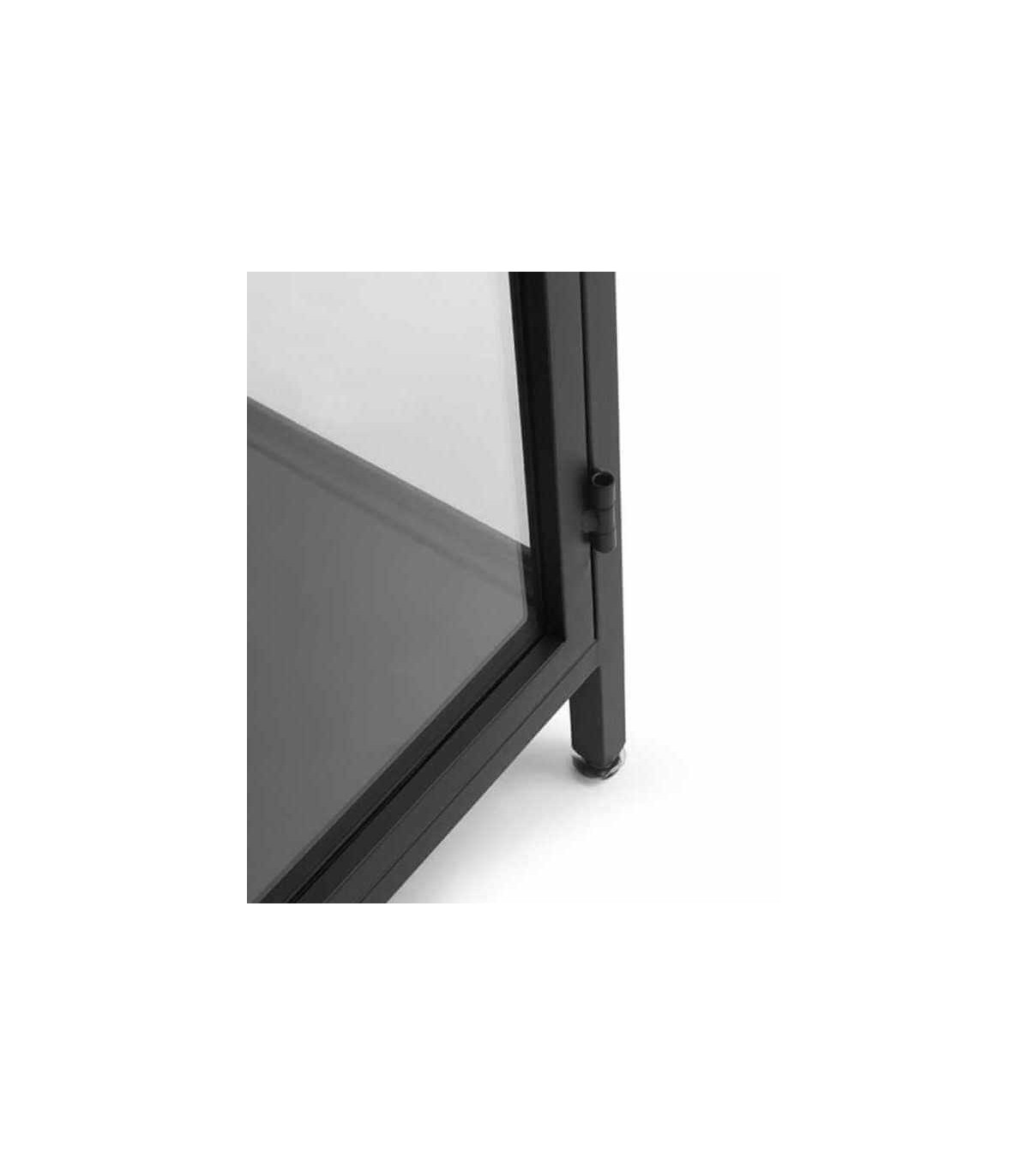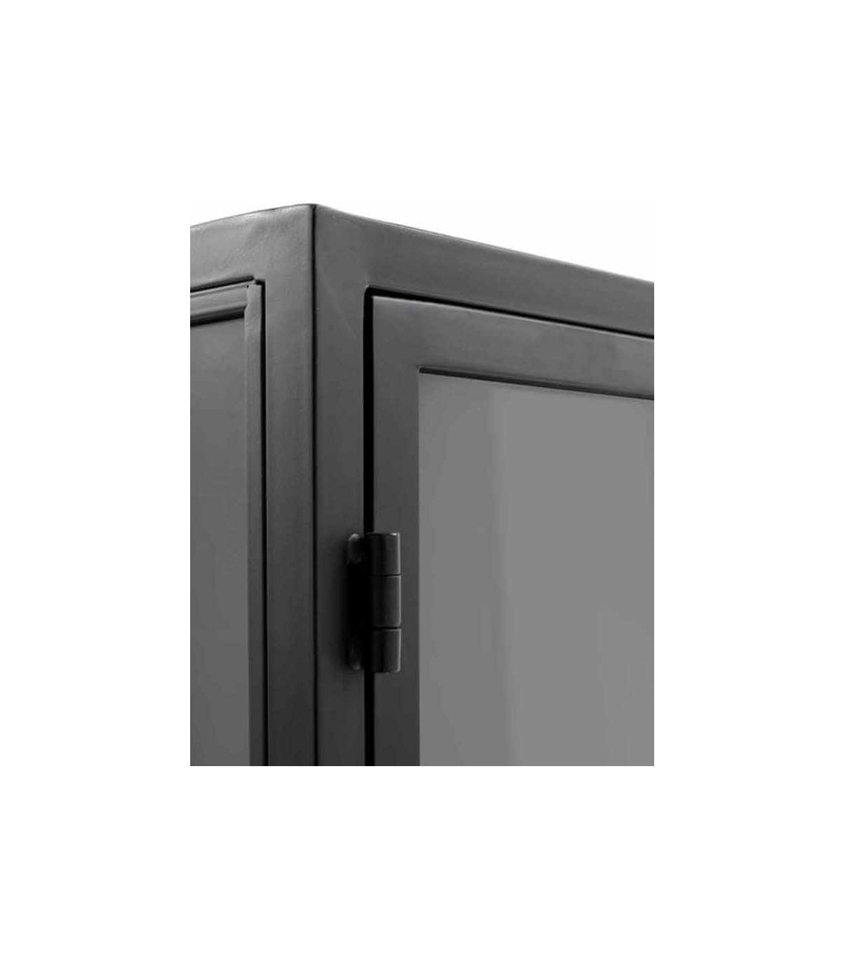 Vitrina baja de estilo industrial, realizada en metal negro, robusta y de gran capacidad con los costados en cristal, una vitrina ideal para colecciones, perfecta para tu salón comedor o tu cocina americana.