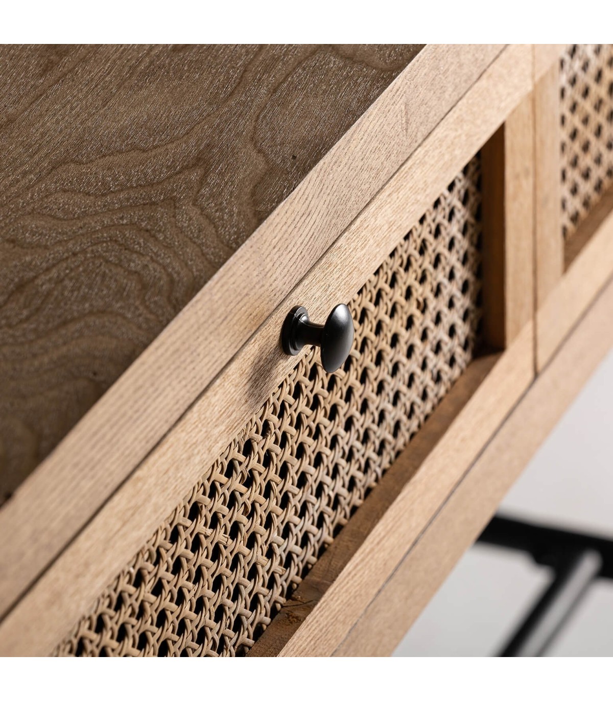 Consola de entrada de nuestra colección Tezel, una colección que se caracteriza por sus frentes en ratán y sus patas en color negro, una colección de muebles a caballo entre el estilo colonial y el industrial que aporta muchas posibilidades a la hora de combinarlos.