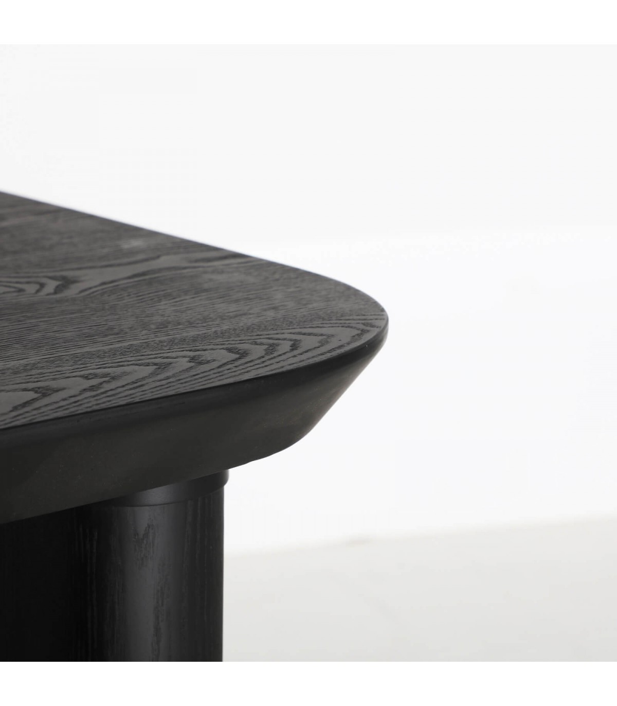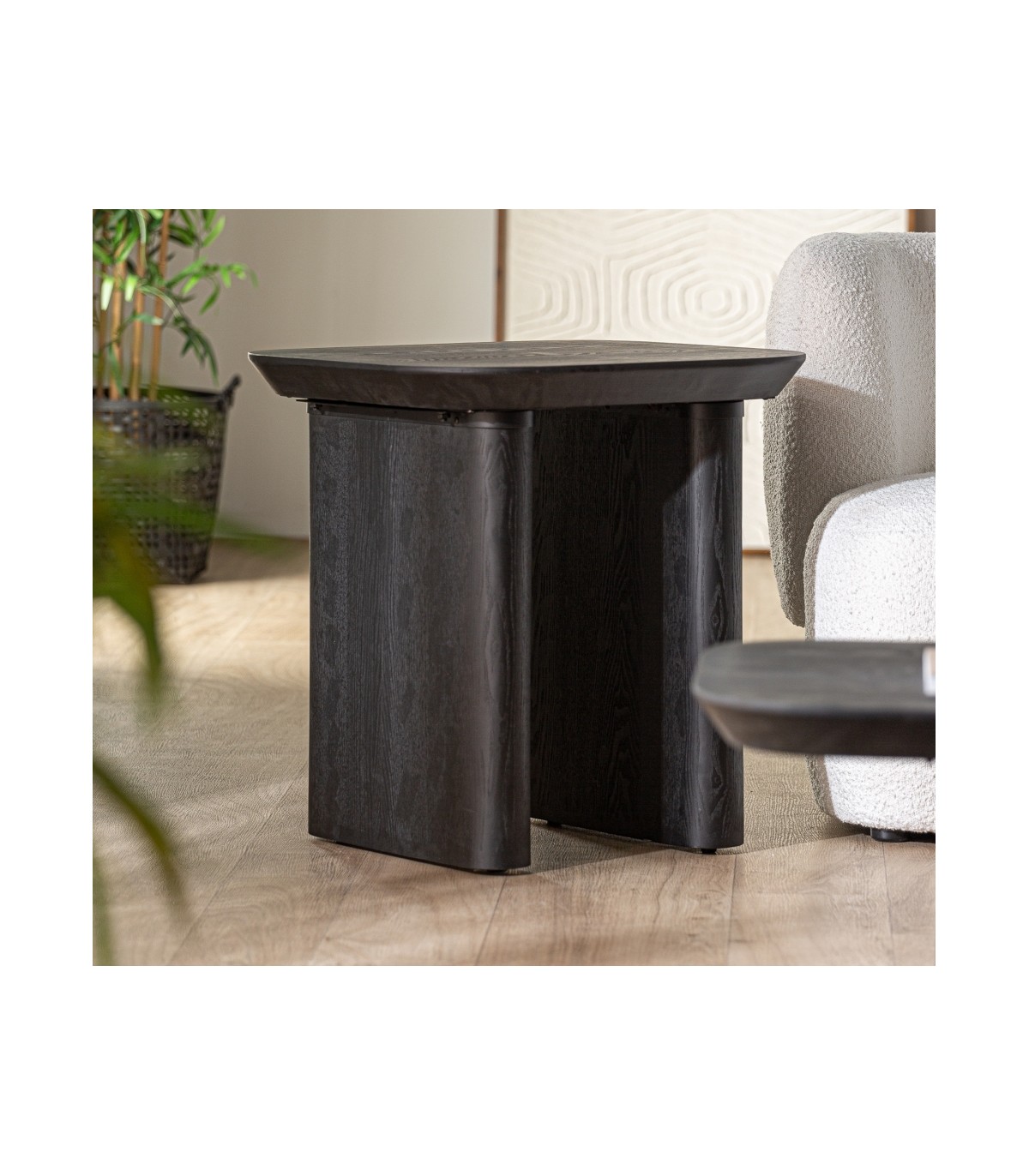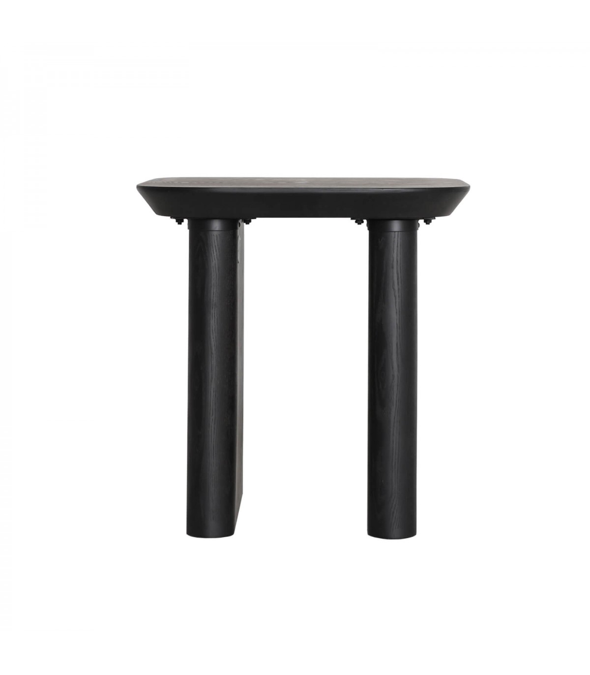 Mesita auxiliar pequeña realizada en madera de abeto teñida en color negro dejando ver el poro de la madera, ideal para salones desenfadados, una mesa para cualquier rincón muy original.