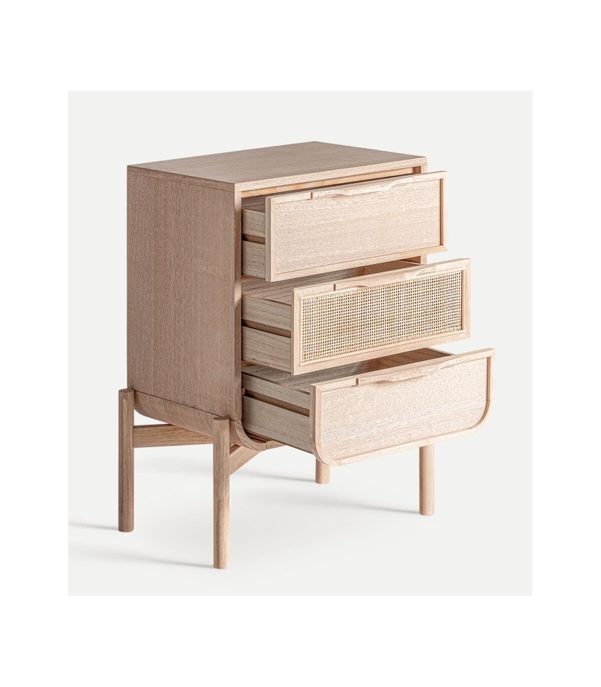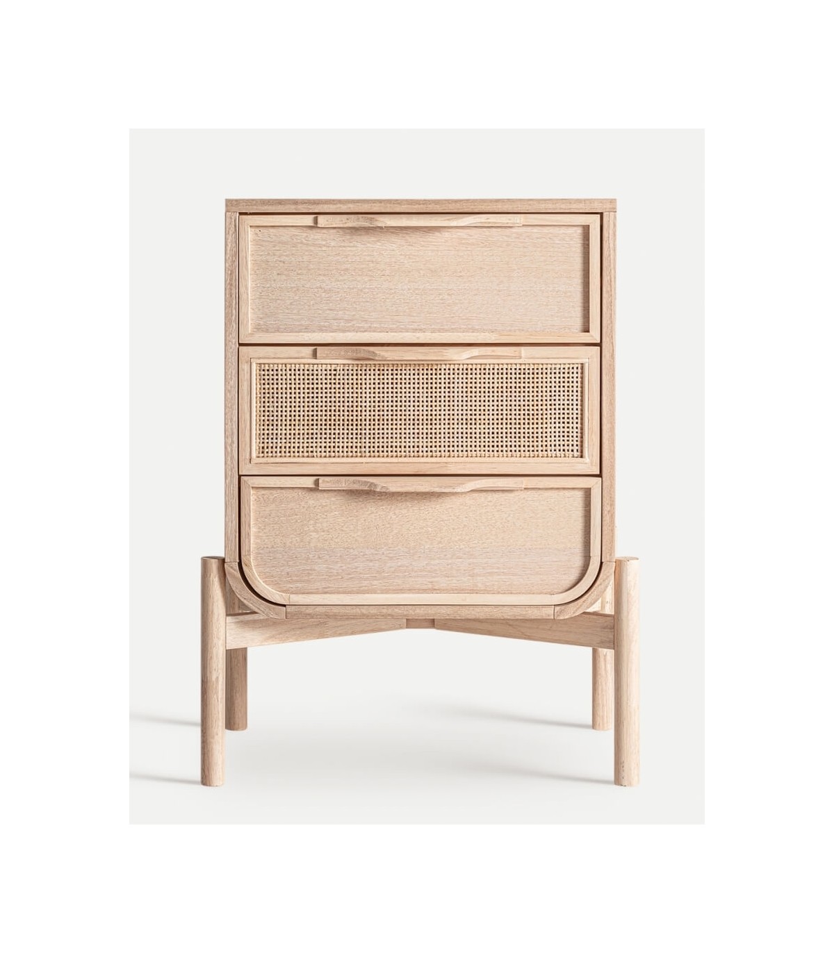 Con tres cajones espaciosos, es ideal para mantener todo en orden sin renunciar al estilo. Su acabado natural realza la textura de la madera, aportando un toque acogedor y sofisticado.