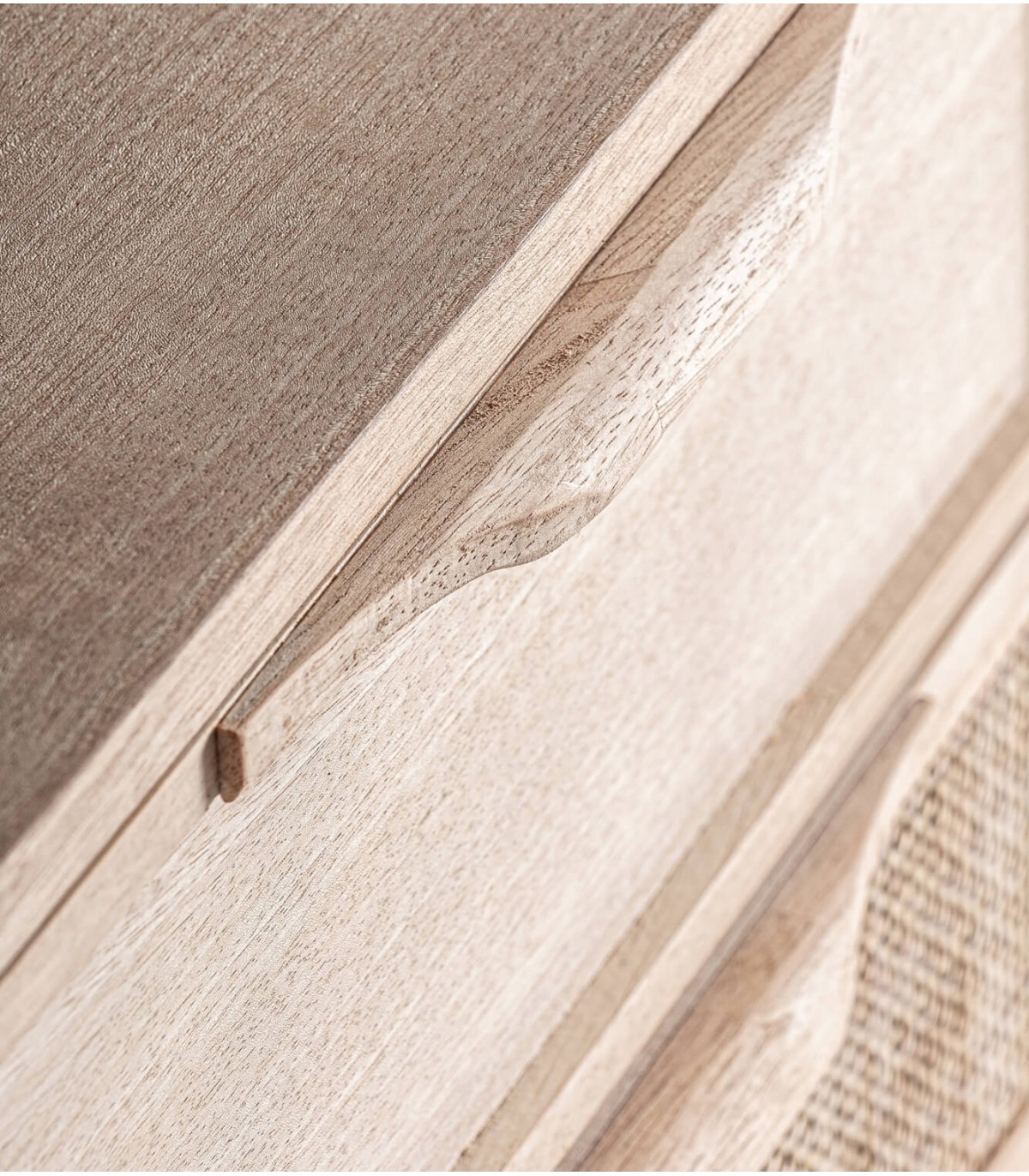 🎨 Acabado: Madera y ratán en tono natural, resaltando sus vetas y textura.