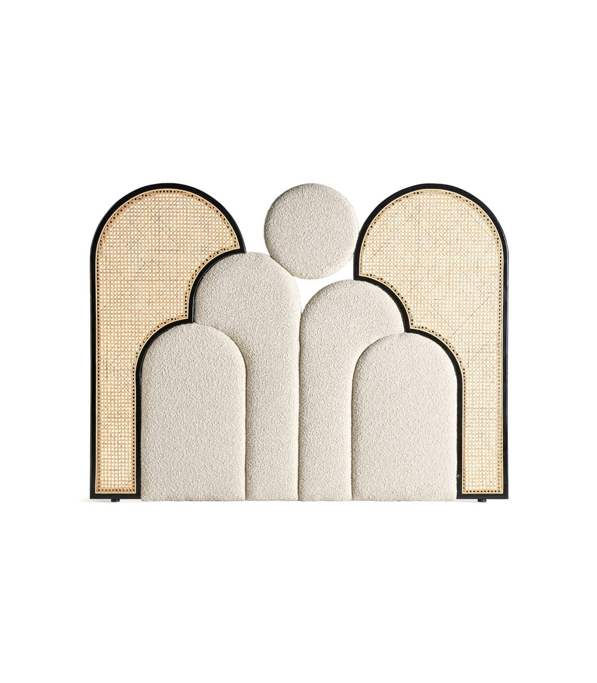 Cabecero para cama de matrimonio, una auténtica pieza de diseño que combina la sofisticación del estilo Art Decó con materiales naturales y texturas envolventes. Elaborado en madera de pino teñida en negro, presenta un exquisito panel central de ratán natural que aporta calidez y ligereza al diseño. Además, su marco curvado está tapizado en tela bouclé color blanco roto, una textura suave y elegante que realza su estética refinada.