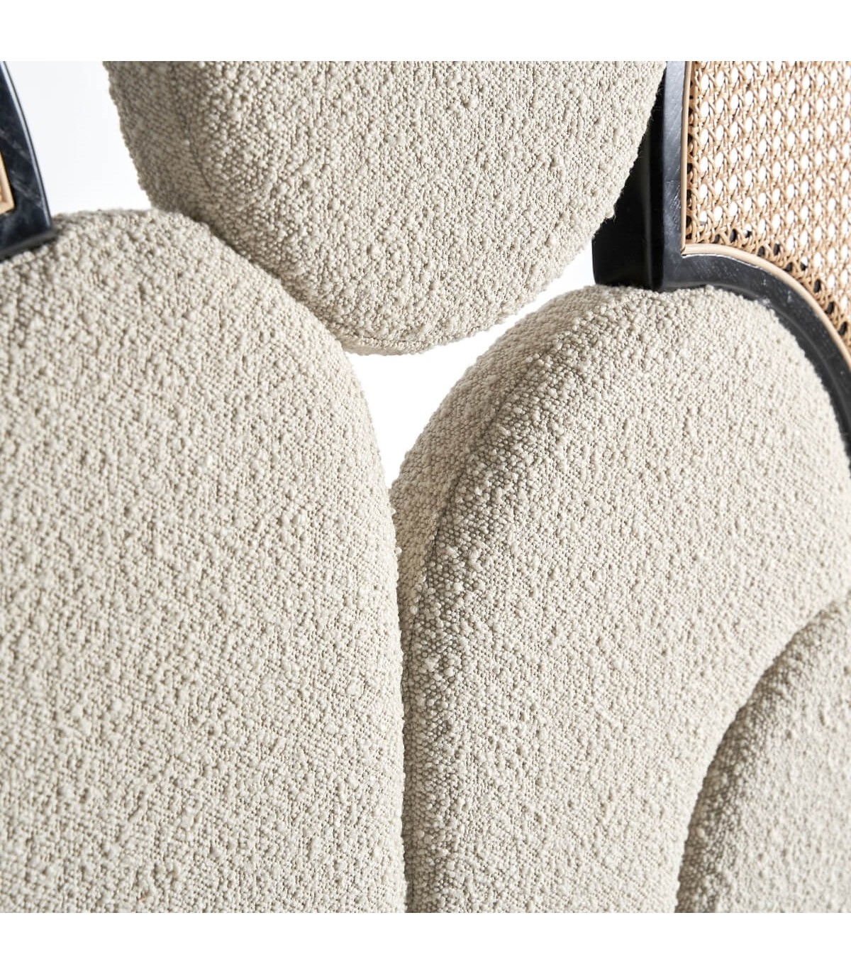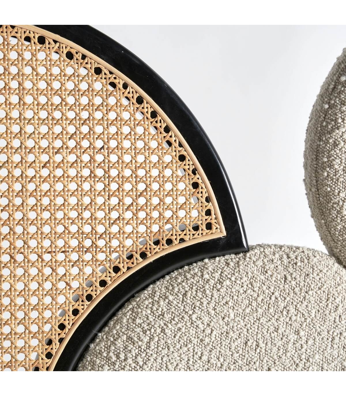Su combinación de materiales crea un contraste armónico entre la solidez de la madera, la naturalidad del ratán y la suavidad del tejido bouclé, convirtiéndolo en el punto focal perfecto para dormitorios de estilo elegante y contemporáneo