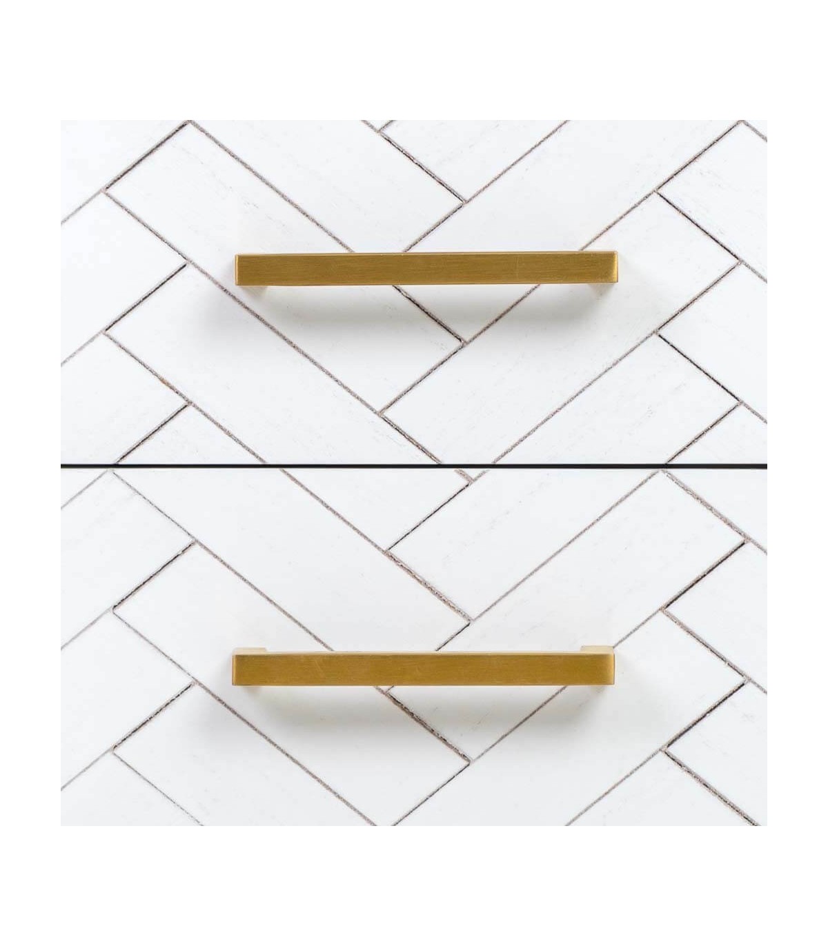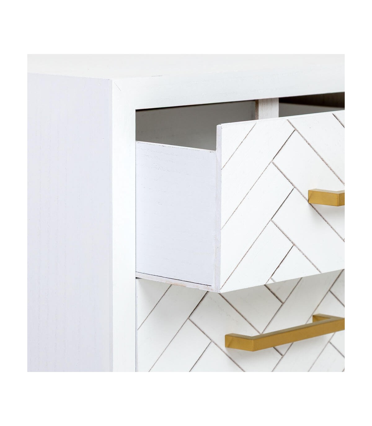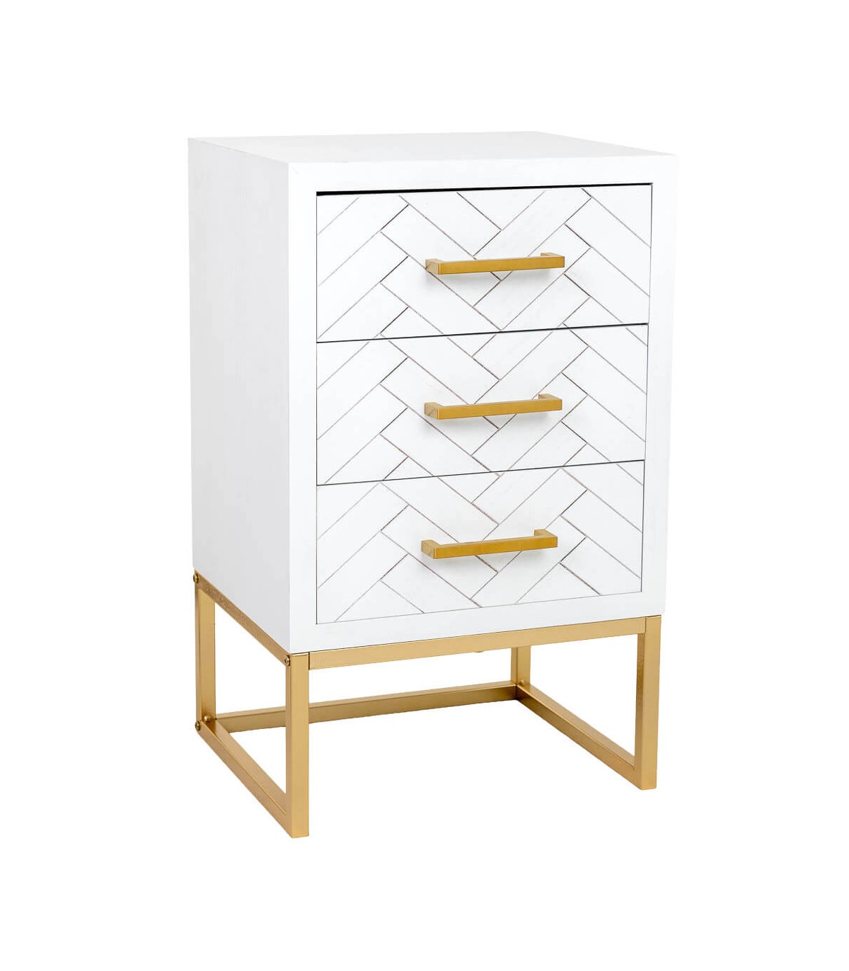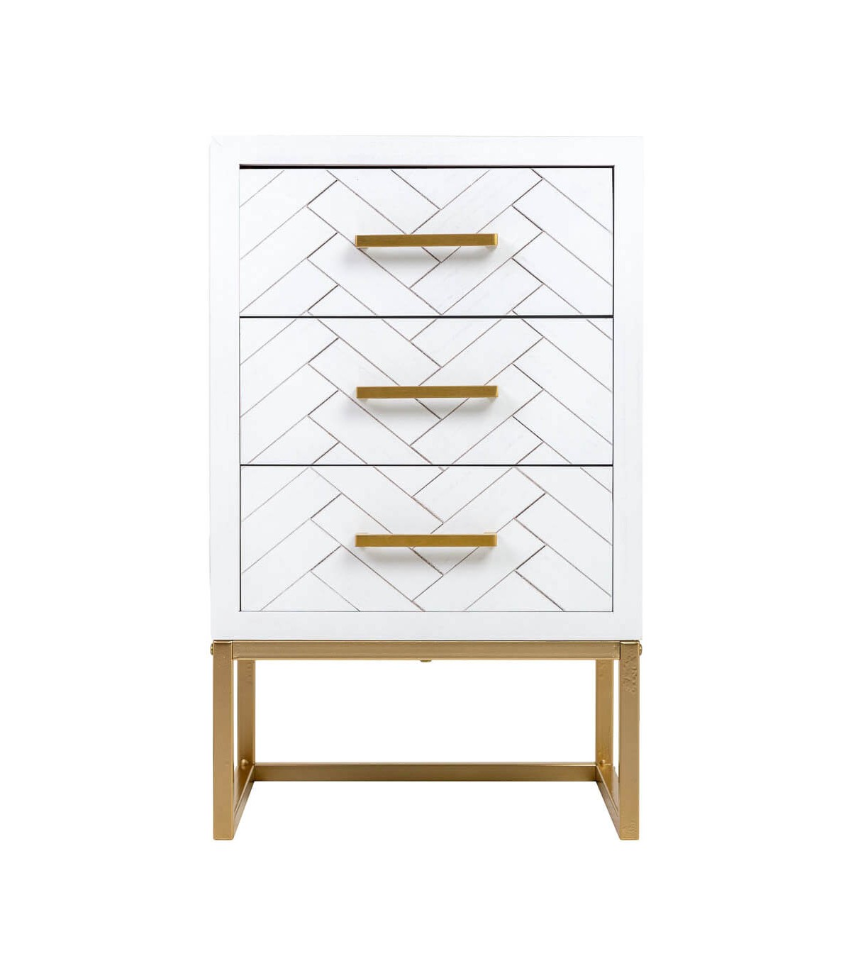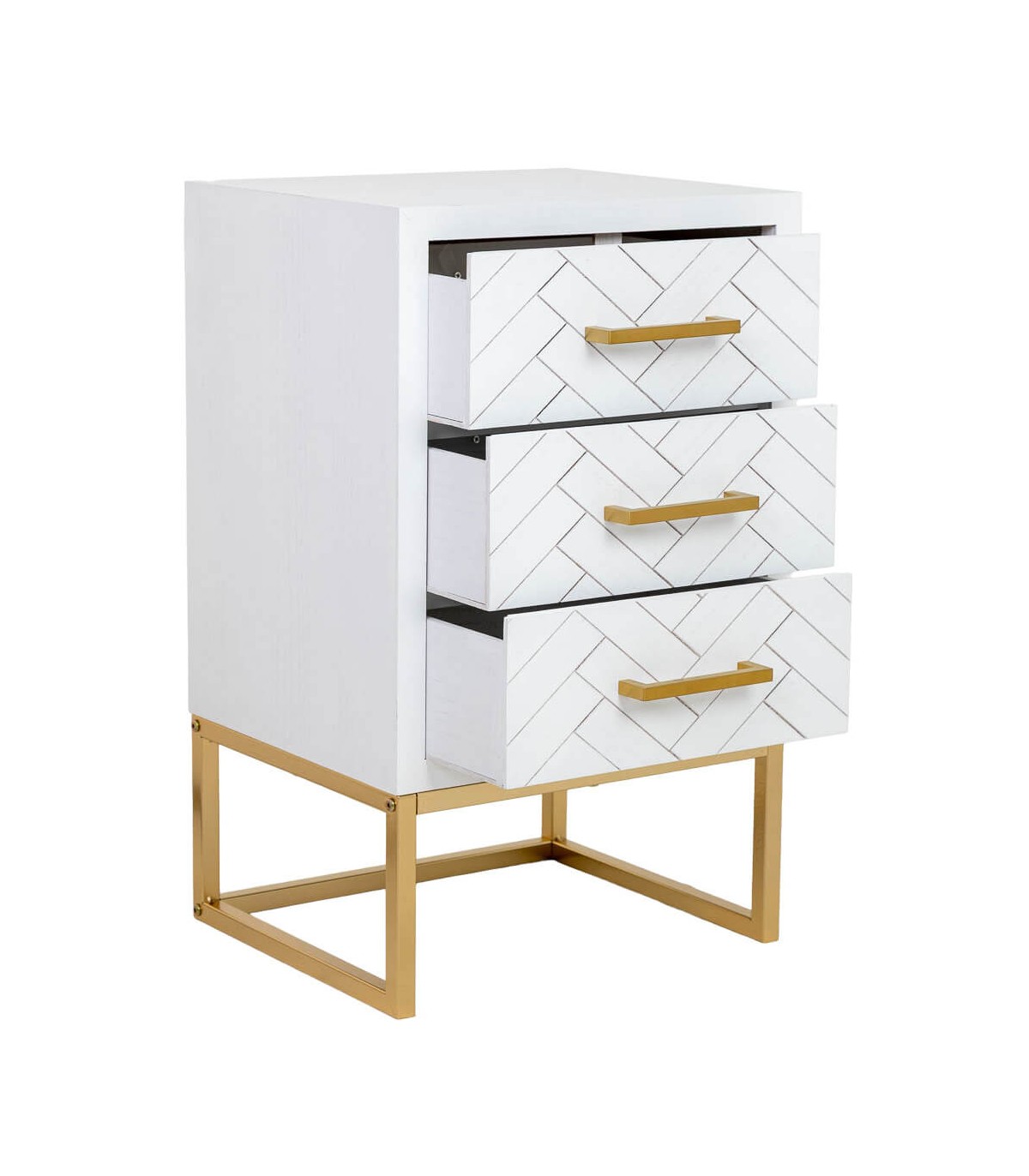 Mesita de noche elegante con estructura blanca y tres cajones decorados con diseño geométrico en espiga. Sus tiradores dorados y patas metálicas aportan un aire sofisticado y glamuroso, ideal para dormitorios modernos con personalidad.