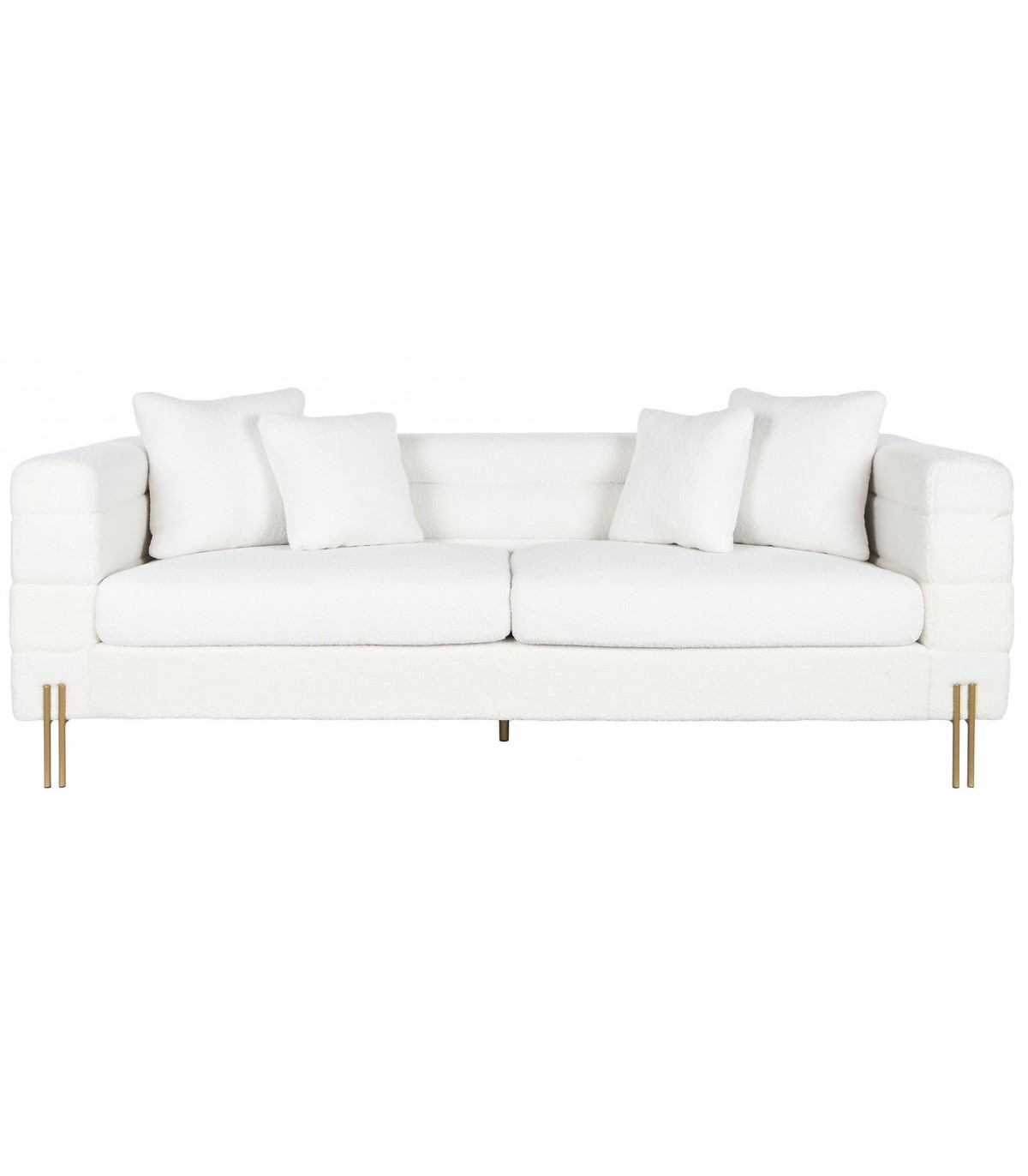 Sofá de 3 plazas de diseño, estilo art decó tapizado en tela bouclé color blanco con las patas en metal acabado dorado, con los dos cojines de asiento y los cuatro cojines auxiliares desenfundables, un sofá muy original y de calidad.