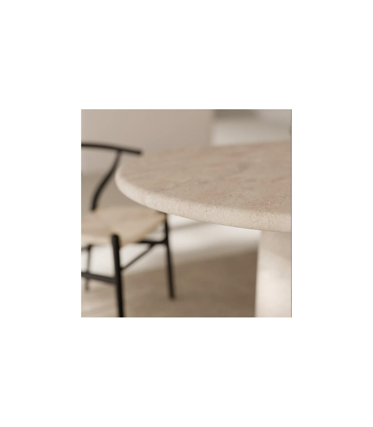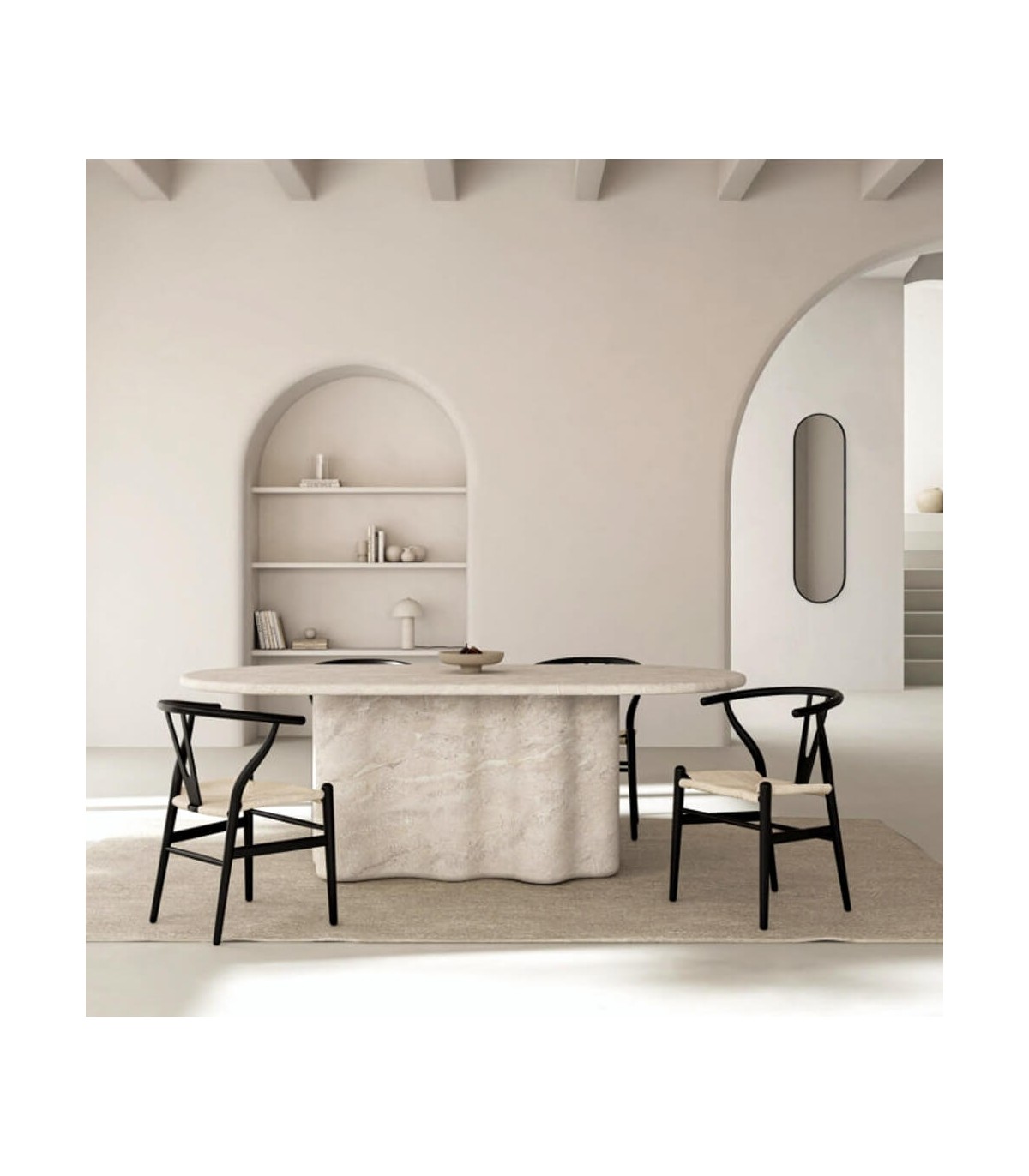 Esta mesa de comedor ovalada grande destaca por su elegancia escultórica y su presencia serena. Fabricada en microcemento con acabado imitación travertino natural, ofrece una textura suave y continua que imita la piedra con realismo y calidez.