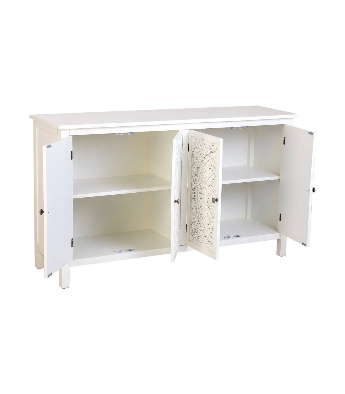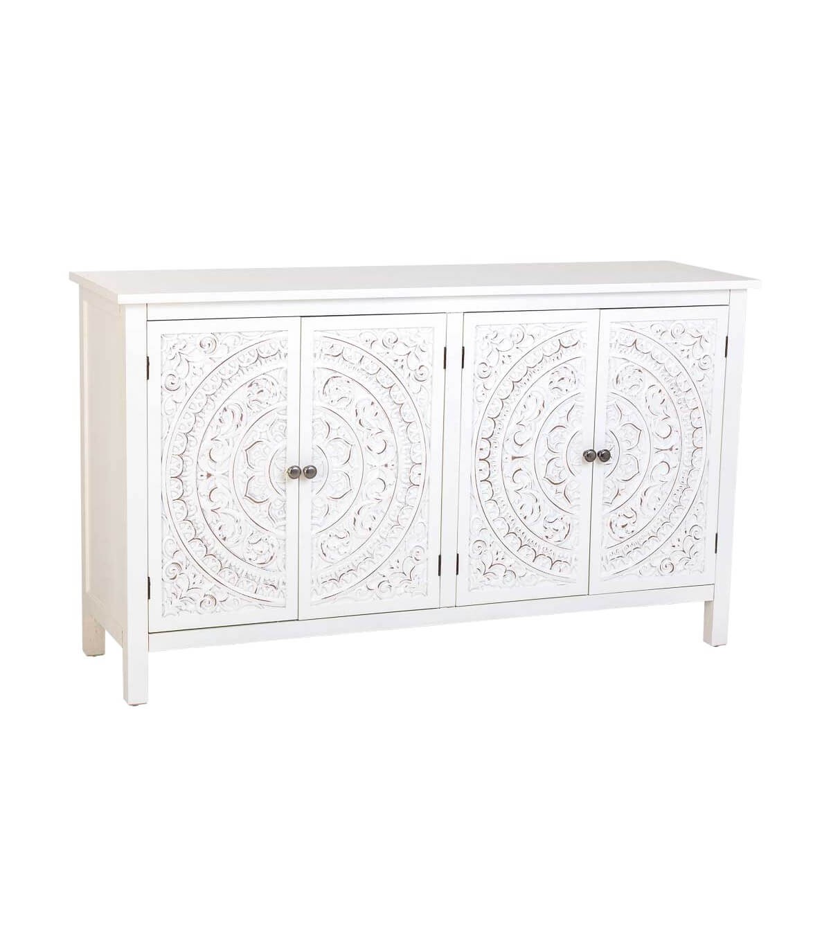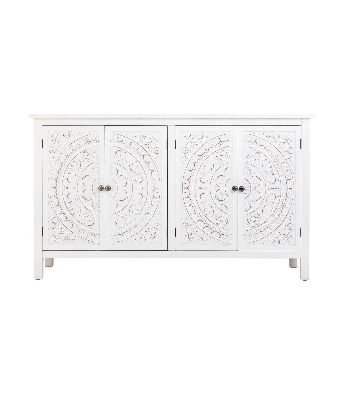 Este aparador pequeño destaca por su diseño único y encantador. Lacado en un elegante color blanco, cuenta con 4 puertas talladas y rozadas que evocan la delicadeza de los cuadros mandalas, aportando un toque artístico y relajante a cualquier espacio. Los tiradores en metal cromado completan su apariencia sofisticada con un contraste sutil y moderno.