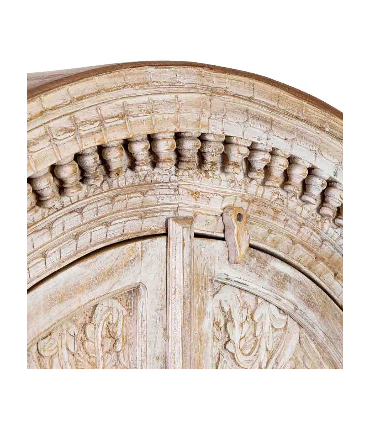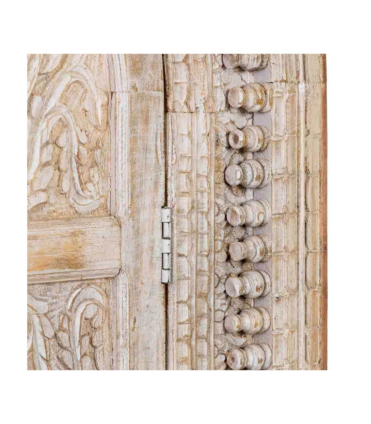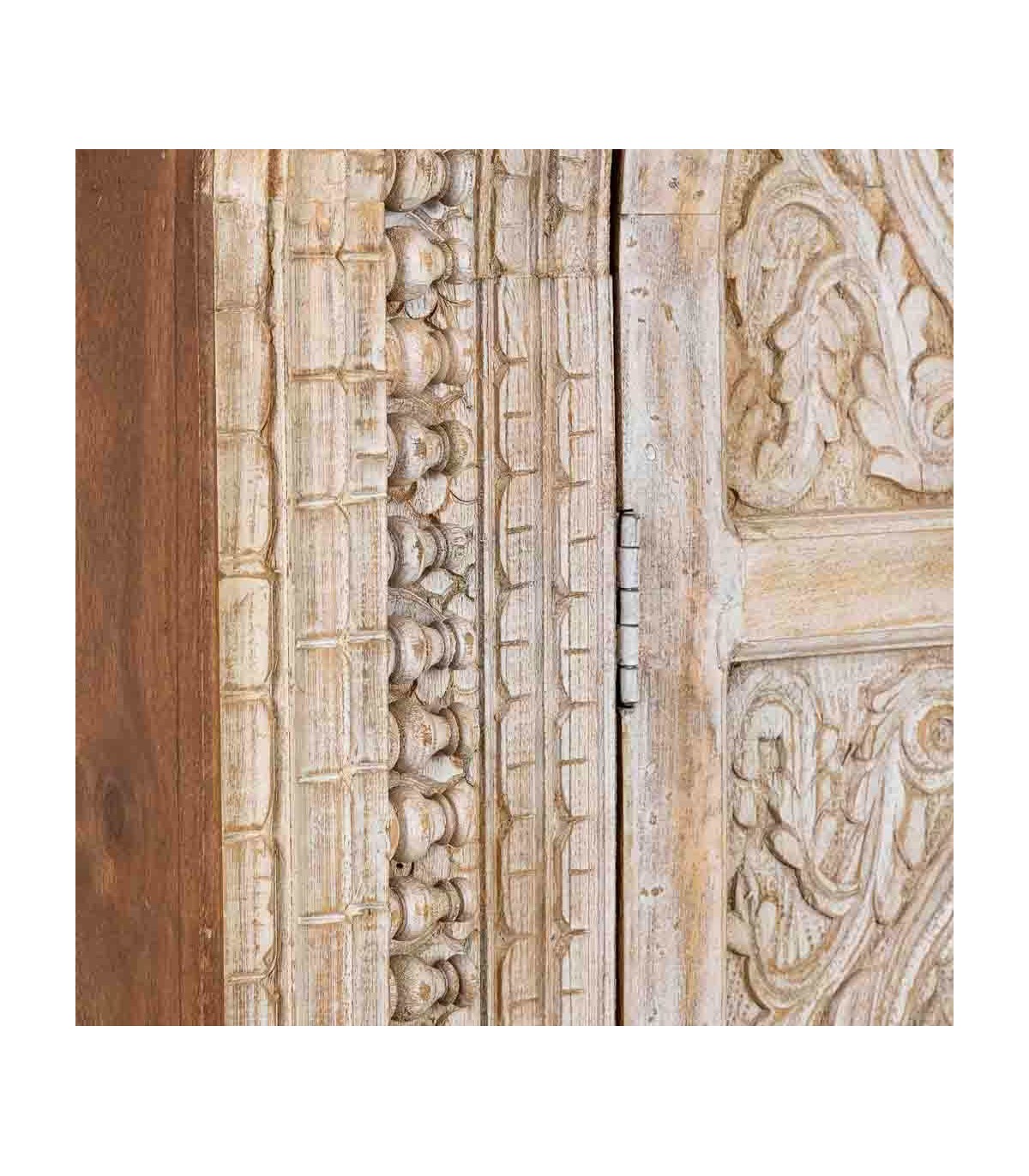 El armario alacena de dos puertas destaca por su imponente presencia y por el valor artesanal de sus tallas, aportando un aire exótico y singular al hogar. La estructura en madera maciza de mango combina acabados en blanco roto rozado y nogal, que realzan el contraste entre lo luminoso y lo cálido.