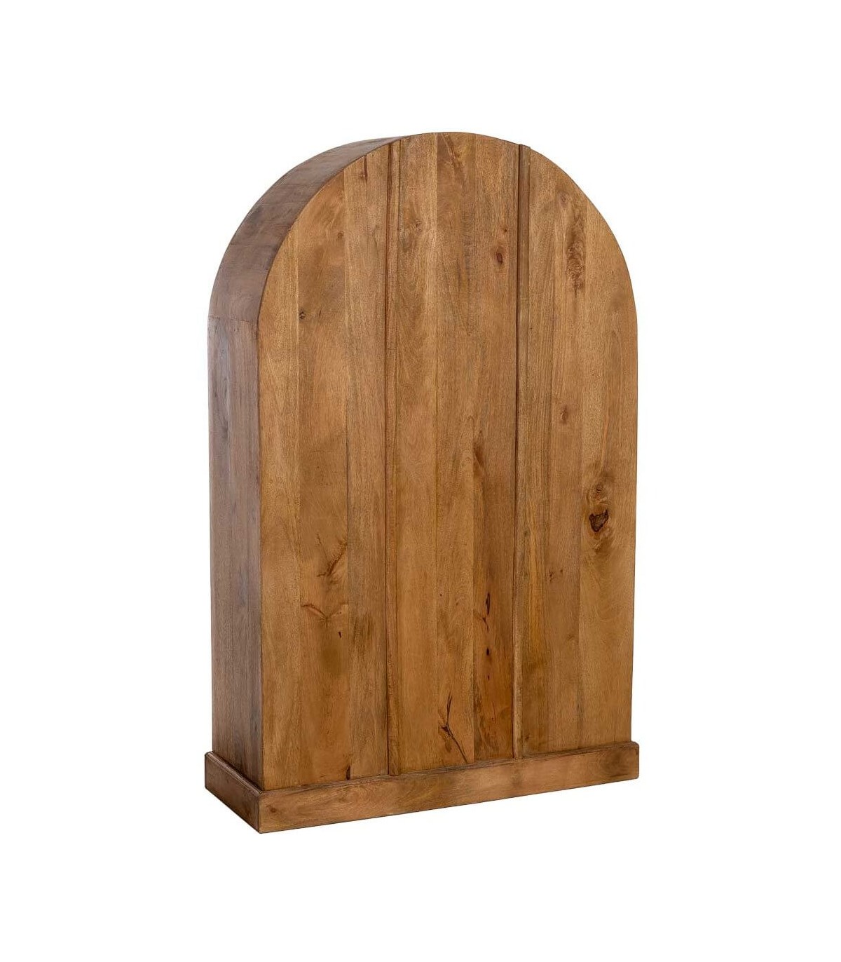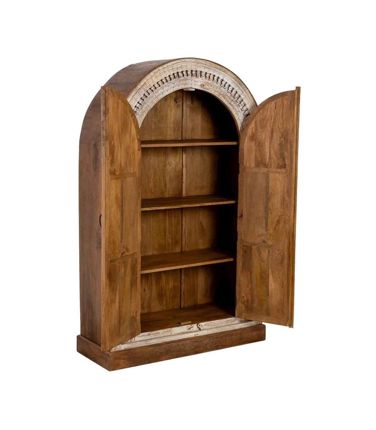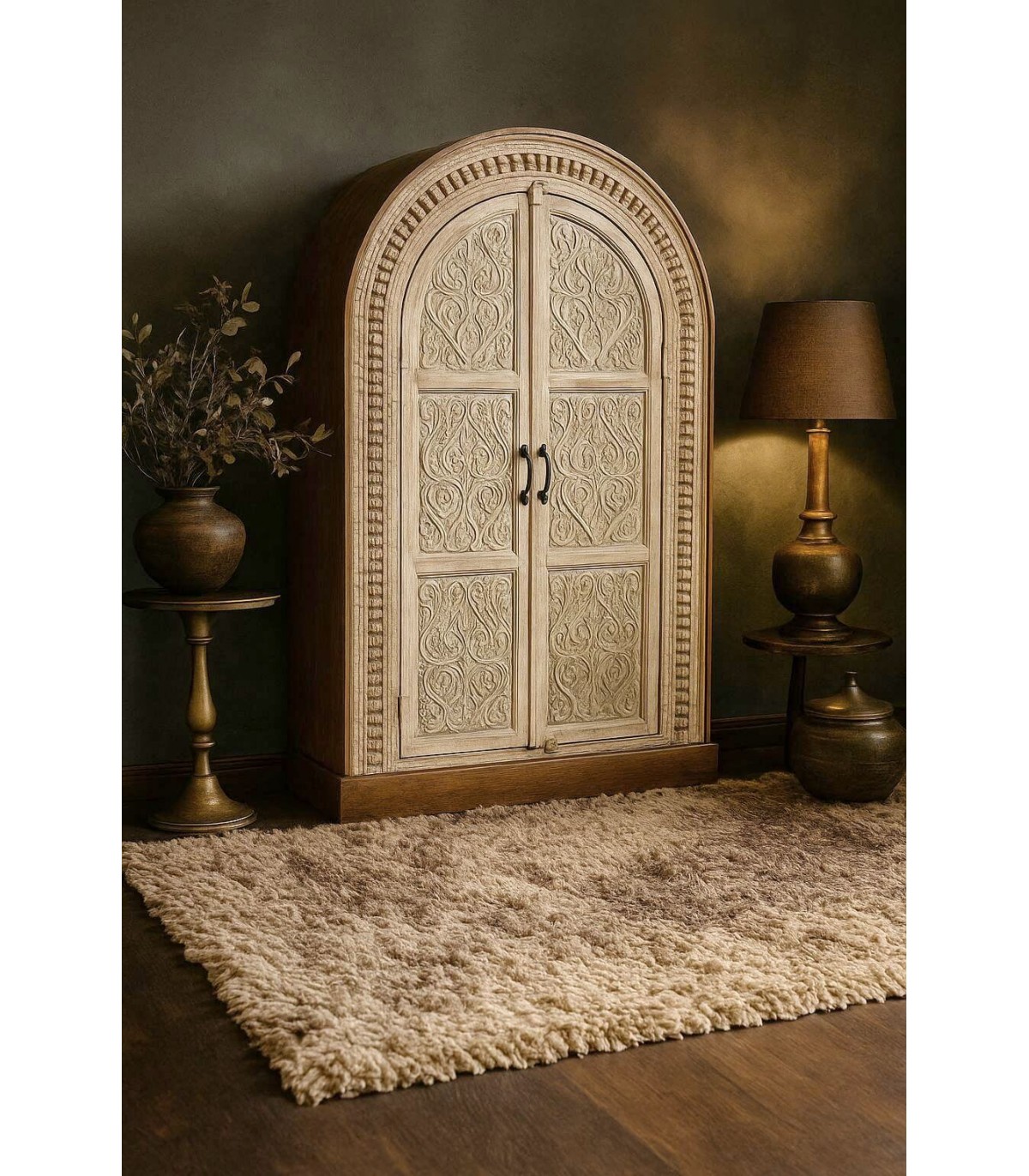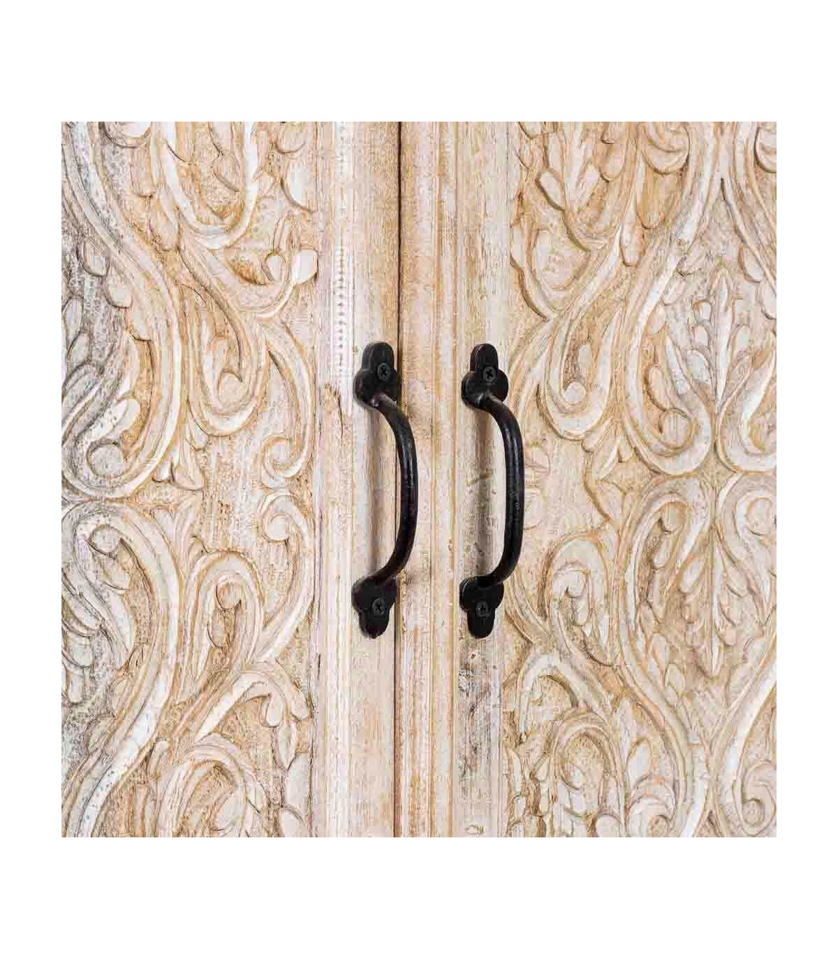 Sus puertas arqueadas con relieves minuciosos evocan la tradición de la artesanía étnica y convierten la pieza en protagonista de cualquier estancia. El interior, con tres estantes, ofrece capacidad práctica para organizar vajilla, ropa o complementos sin renunciar a la estética. Los tiradores metálicos a juego aportan un toque sobrio.