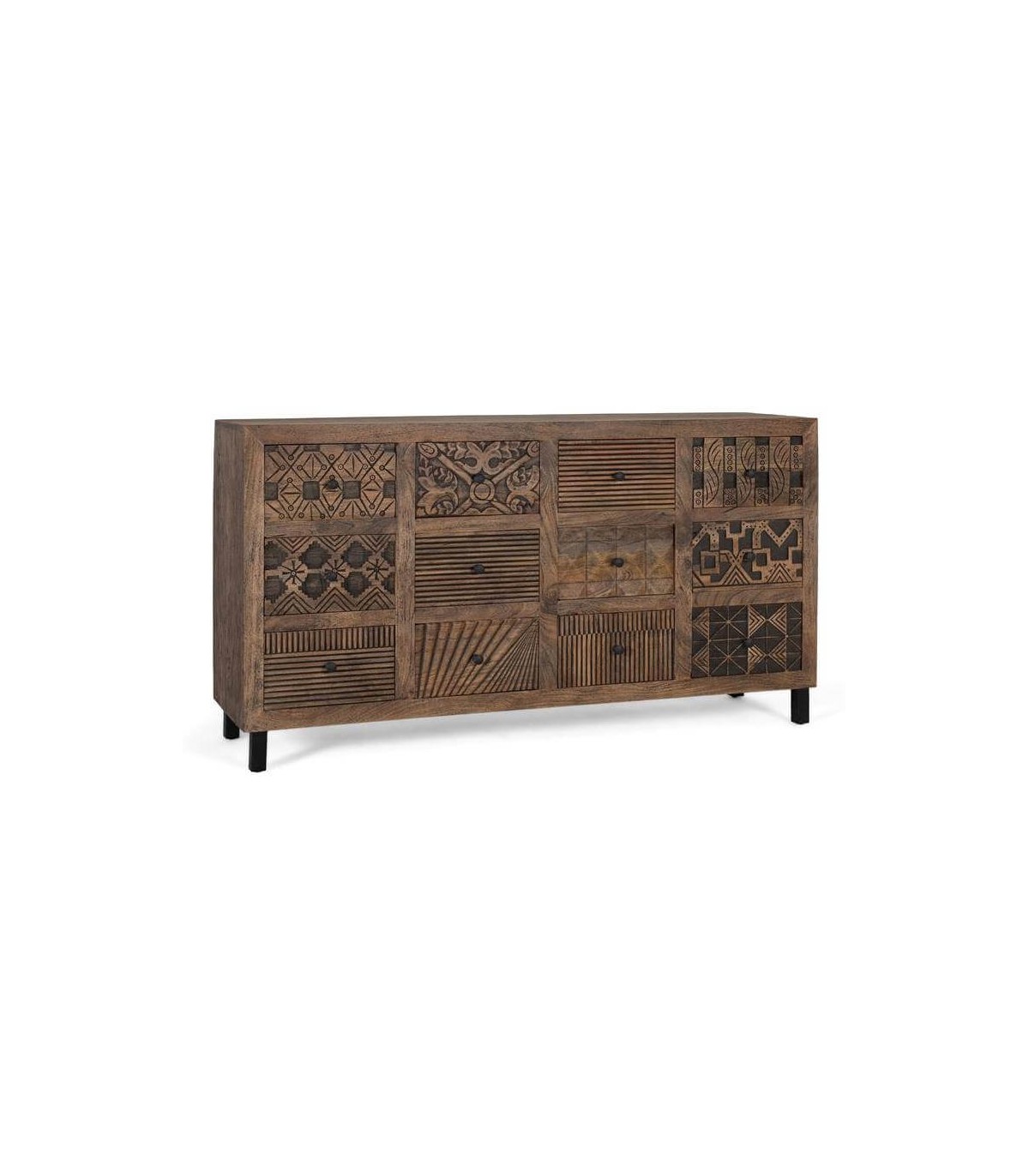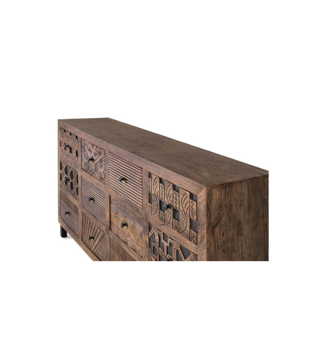 Esta cómoda XL de 12 cajones combina fuerza visual y carácter artesanal en una pieza que respira autenticidad. Su estructura de madera maciza de mango se realza con un tallado minucioso y un acabado nogal patinado en negro que aporta profundidad y textura.
