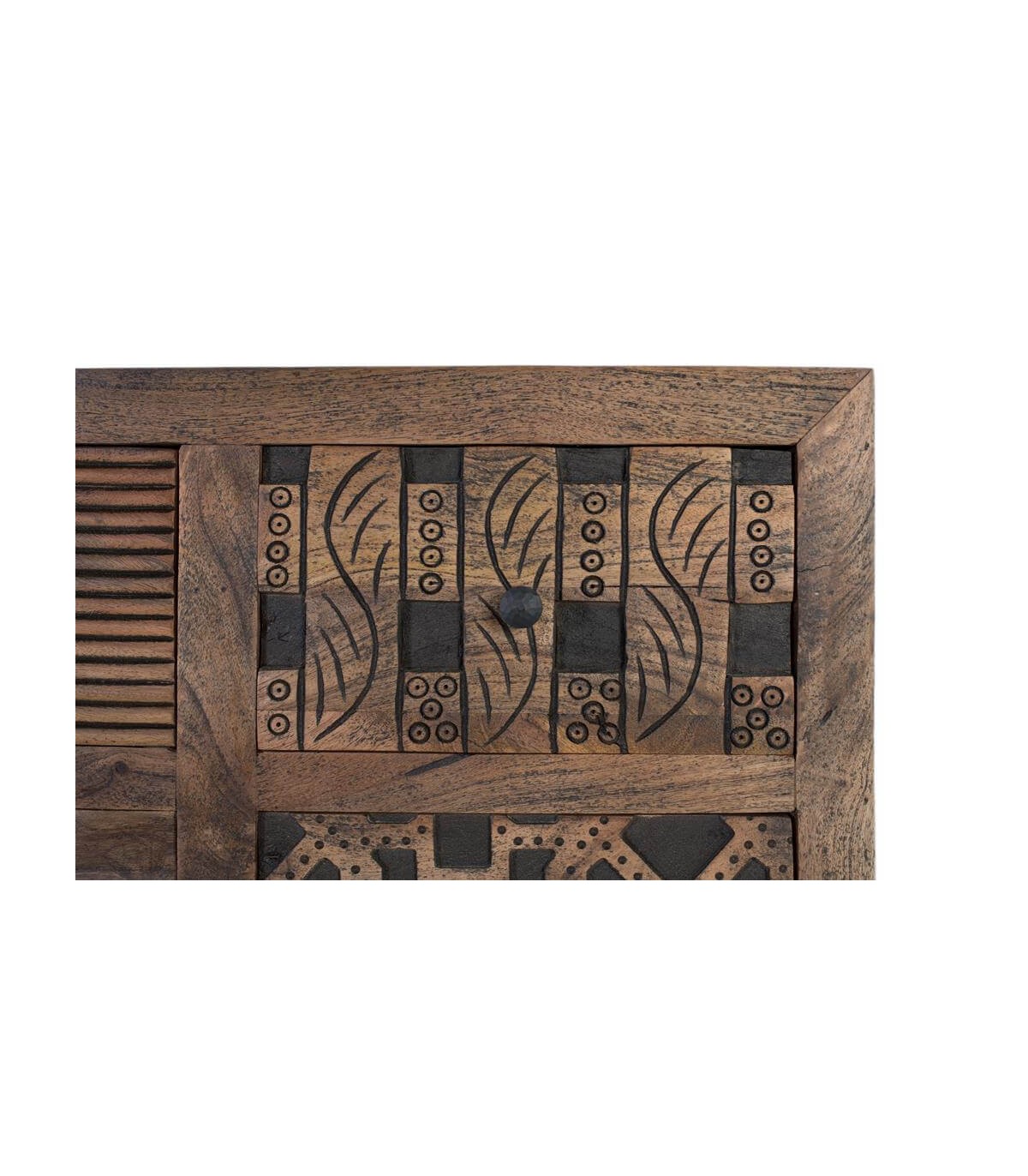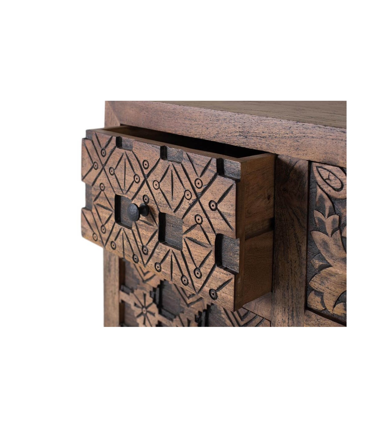 Los tiradores y patas de hierro forjado equilibran su solidez con un aire contemporáneo, creando un contraste elegante y atemporal. Cada cajón revela un detalle distinto, evocando la calidez de los interiores exóticos. Un mueble funcional y decorativo que aporta personalidad, orden y un toque viajero al hogar.
