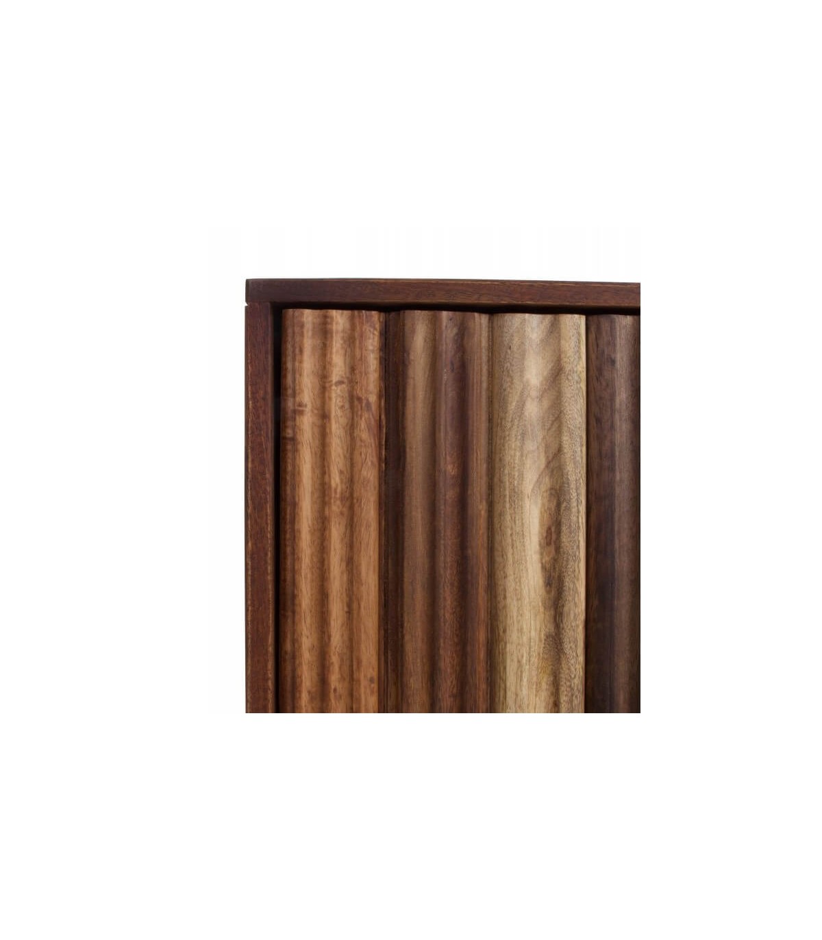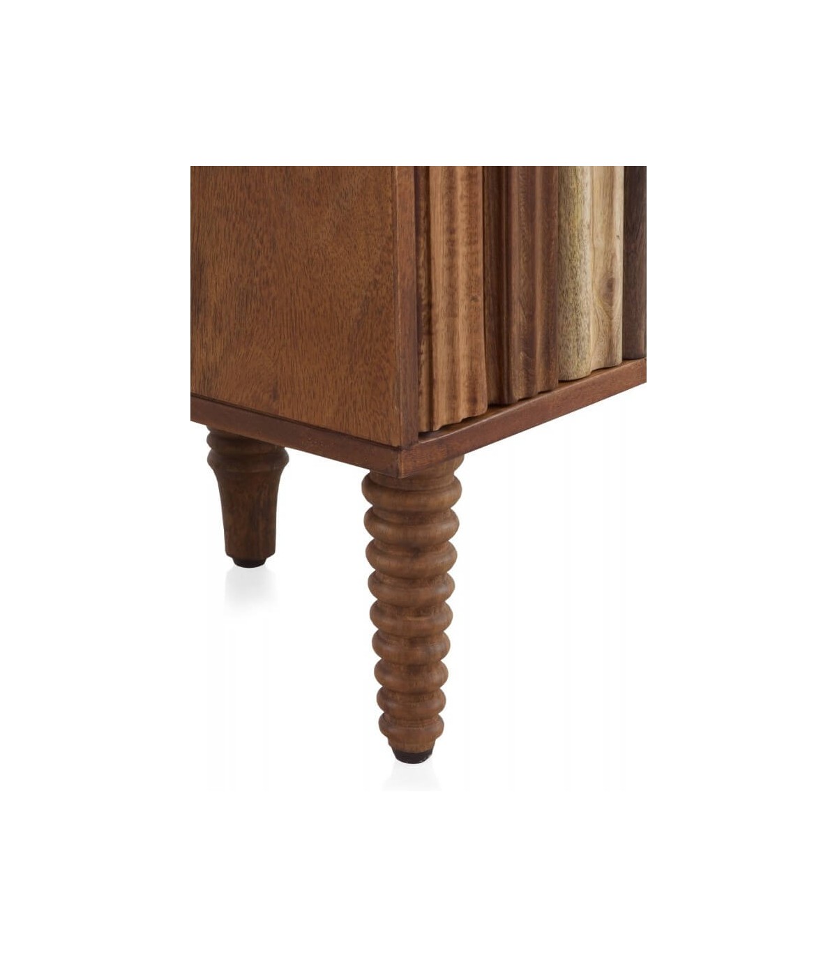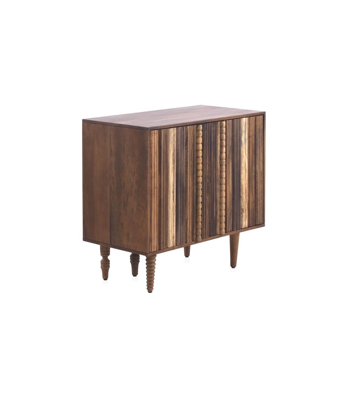 Taquillón realizado artesanalmente en madera de acacia, degradada en madera color nogal a natural, con partes torneadas y talladas a mano, lleva 5 patas de distinto acabado. Un mueble con mucho carácter.
