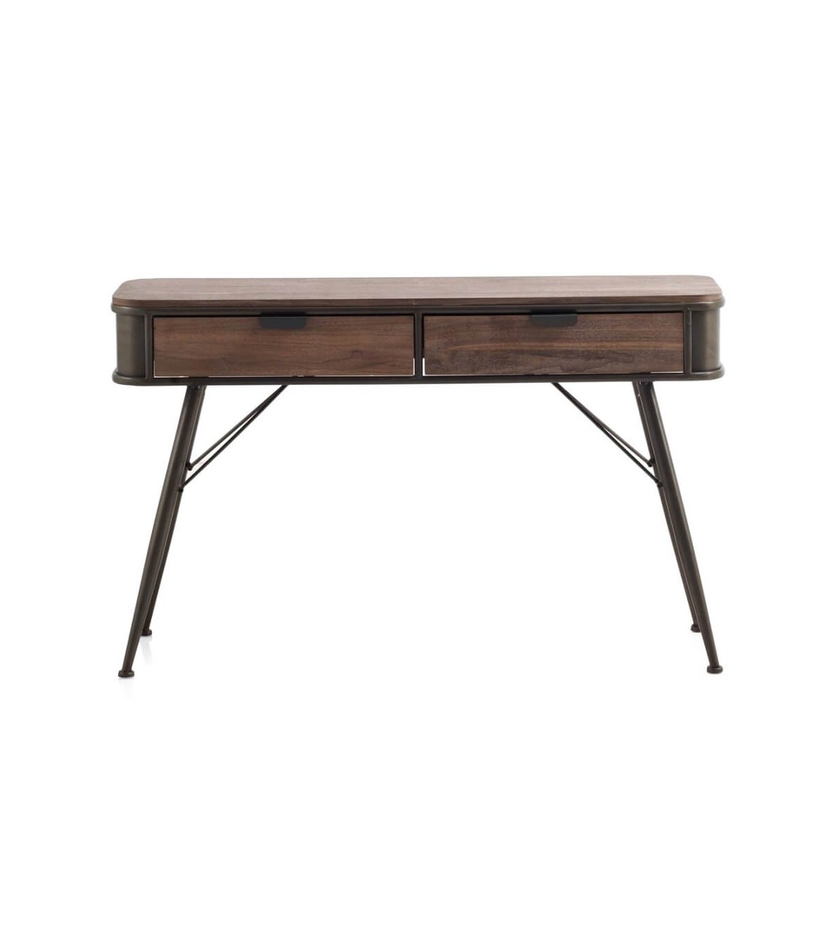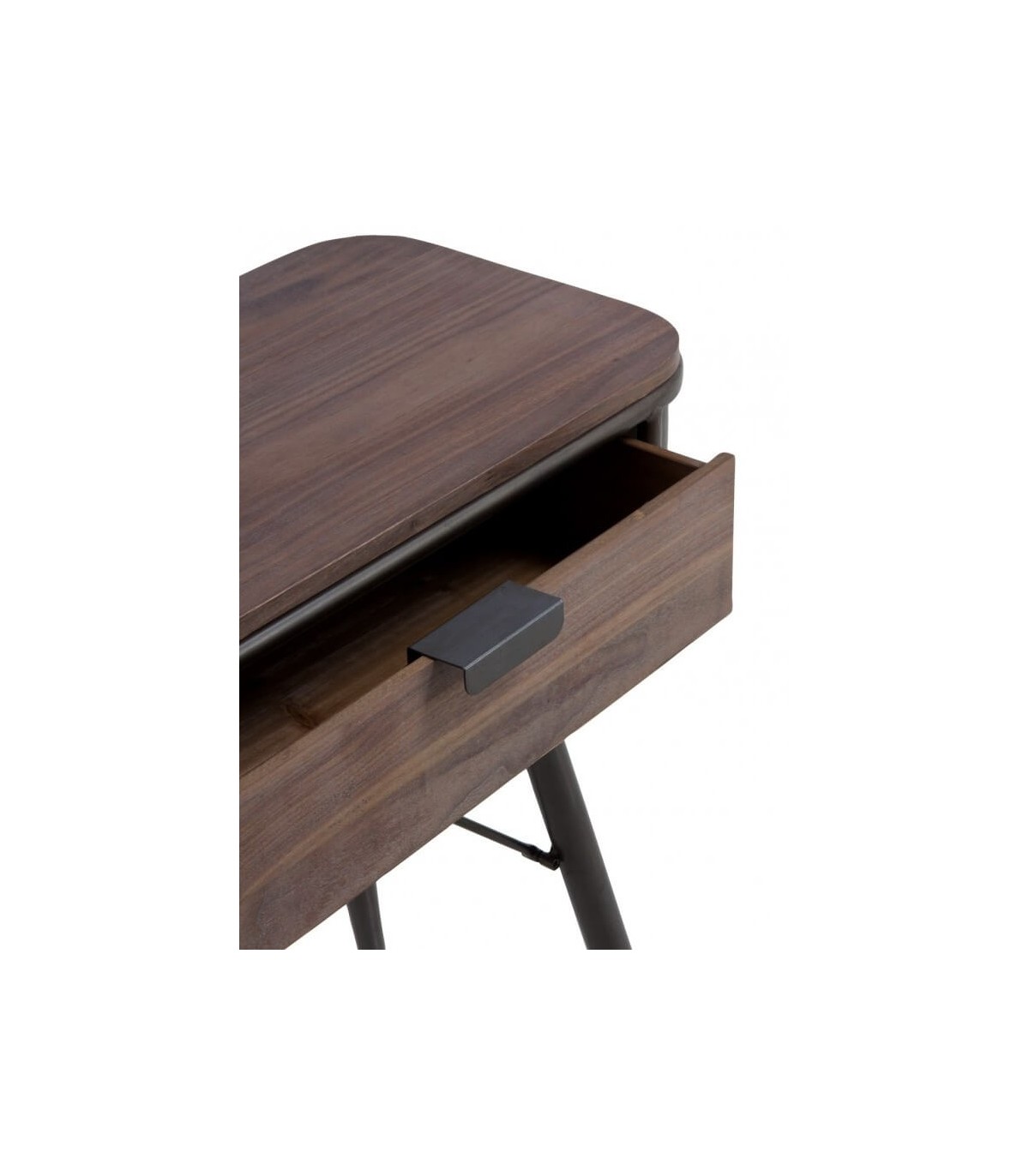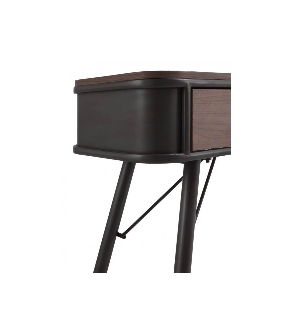 Consola de entrada con 2 cajones, la estructura, tiradores y patas en metal acabado gris rozado, madera de abeto teñida en color nogal, una consola que se podría encajar en decoraciones vintage, coloniales o industriales.