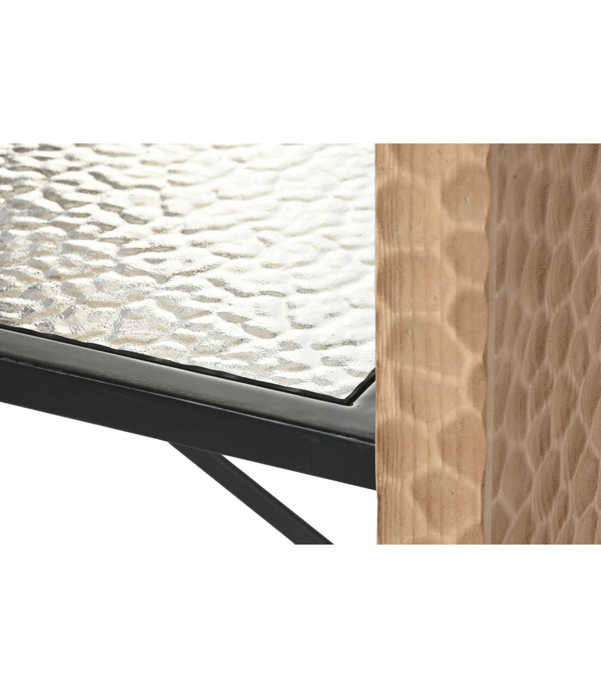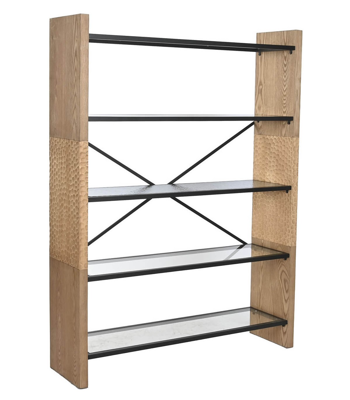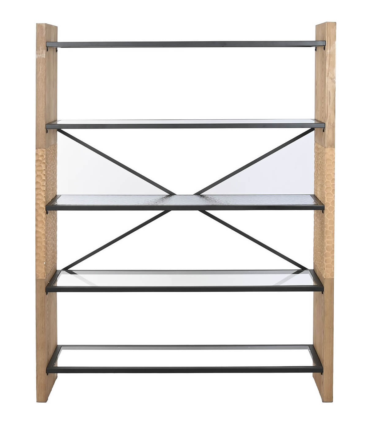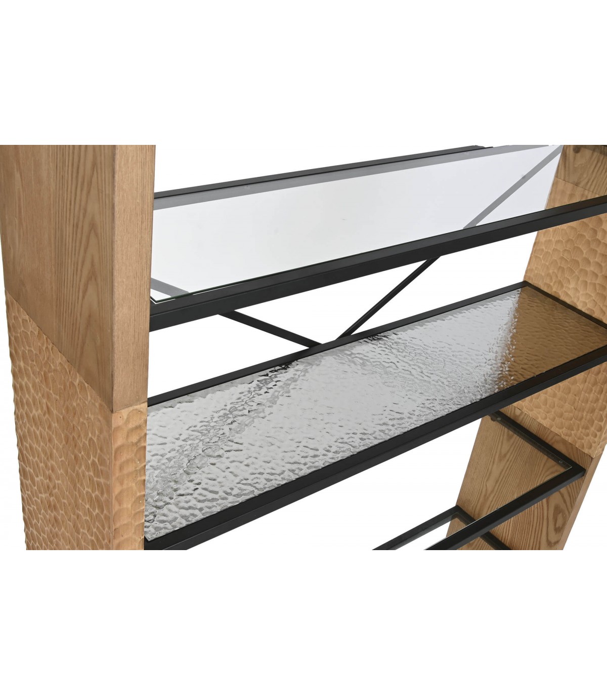 Los laterales en madera de abeto natural combinan dos acabados distintos, uno liso y otro con textura martilleada, creando un efecto visual atractivo y original. Ideal como librería, expositor decorativo o mueble auxiliar tanto en salones como despachos, aporta amplitud, luminosidad y carácter al ambiente.
