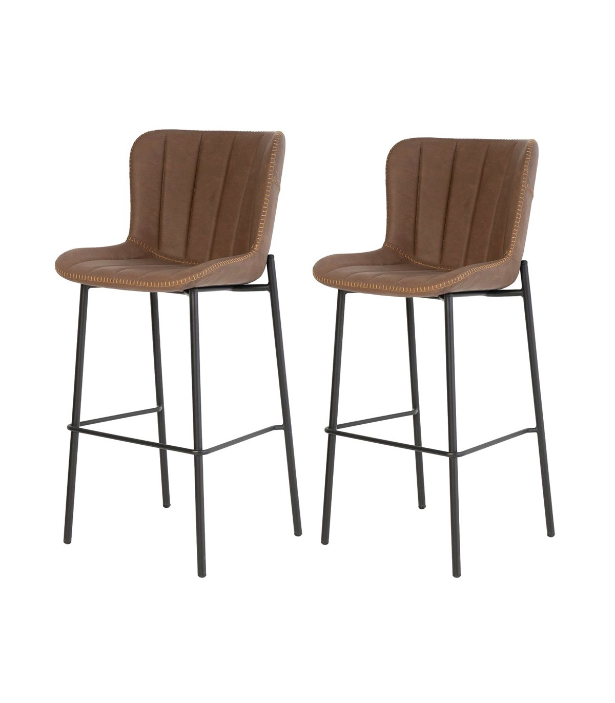 Set de dos taburetes de líneas limpias y asiento envolvente tapizado en polipiel marrón, que aporta confort y un toque cálido al ambiente. Su estructura metálica negra ofrece estabilidad y un contraste elegante con el tono del asiento.