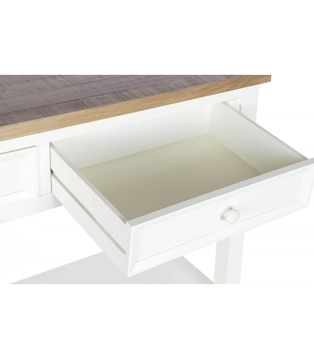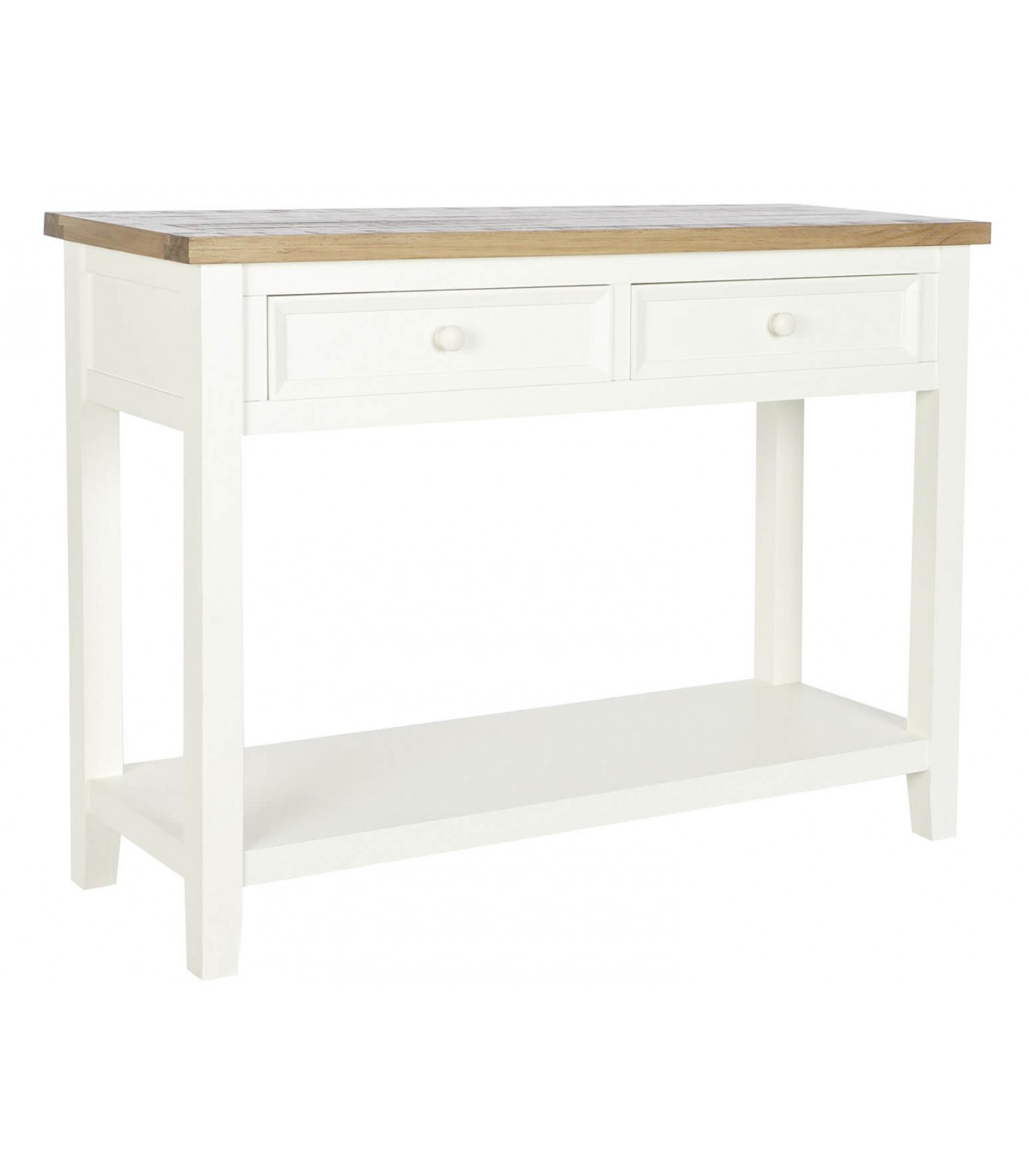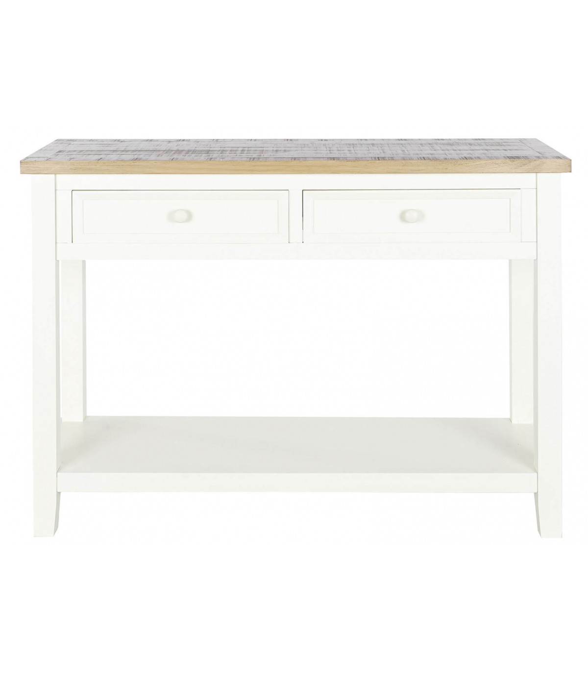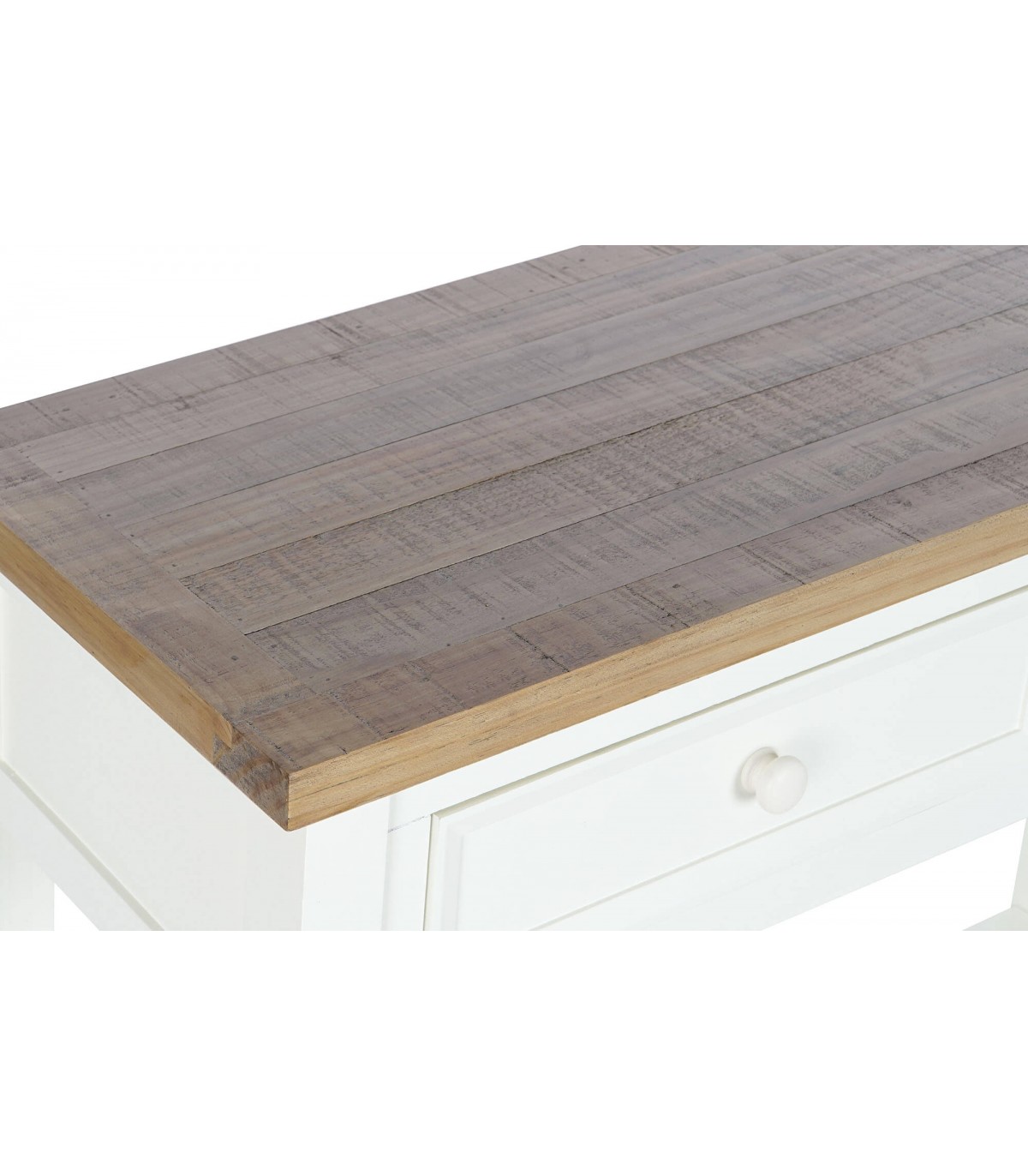 Consola de estilo rústico con 2 cajones realizado en madera de paulonia con la tapa natural y el resto lacado en blanco. Sencilla y luminosa, perfecta para decorar dando amplitud visual.