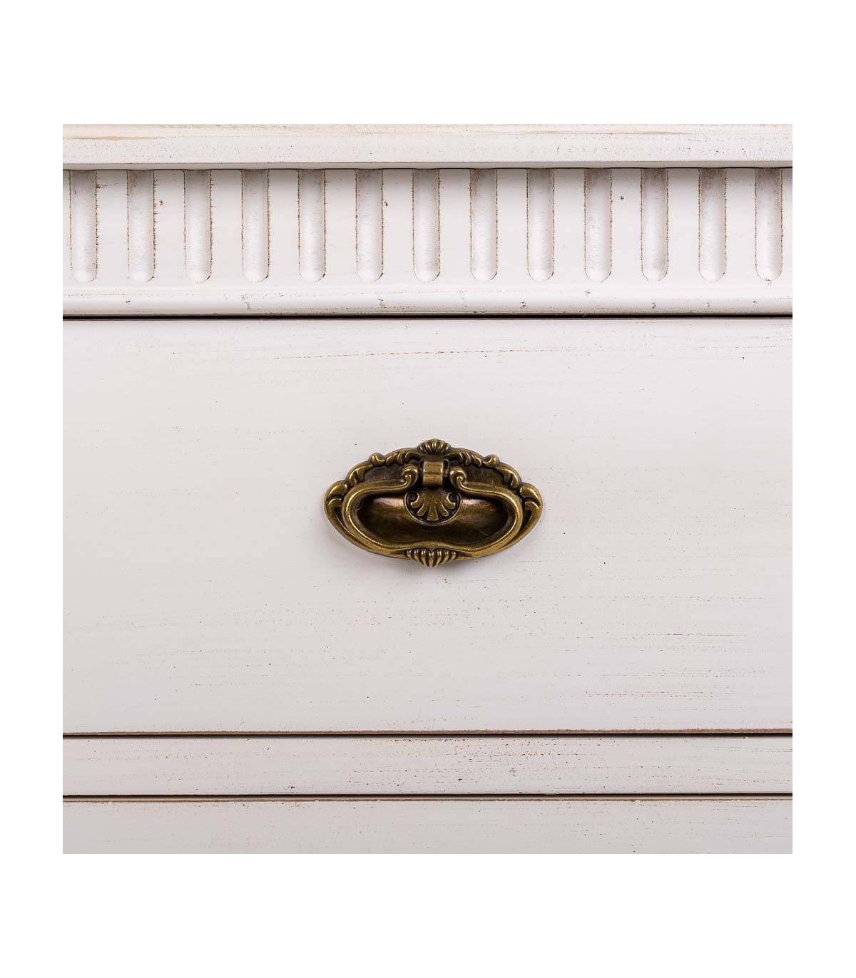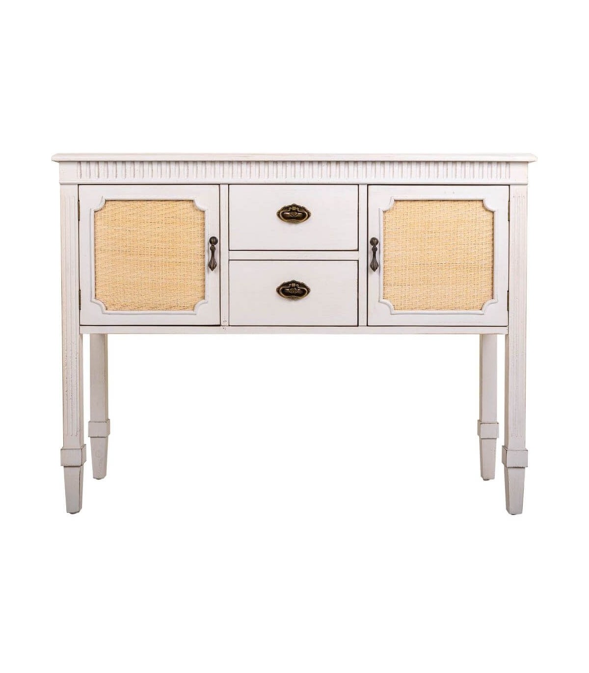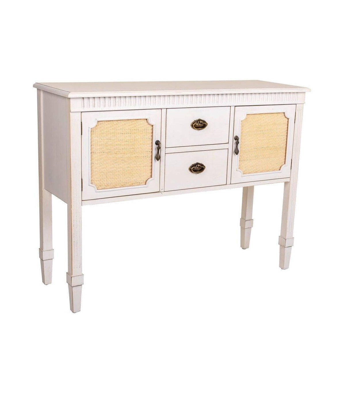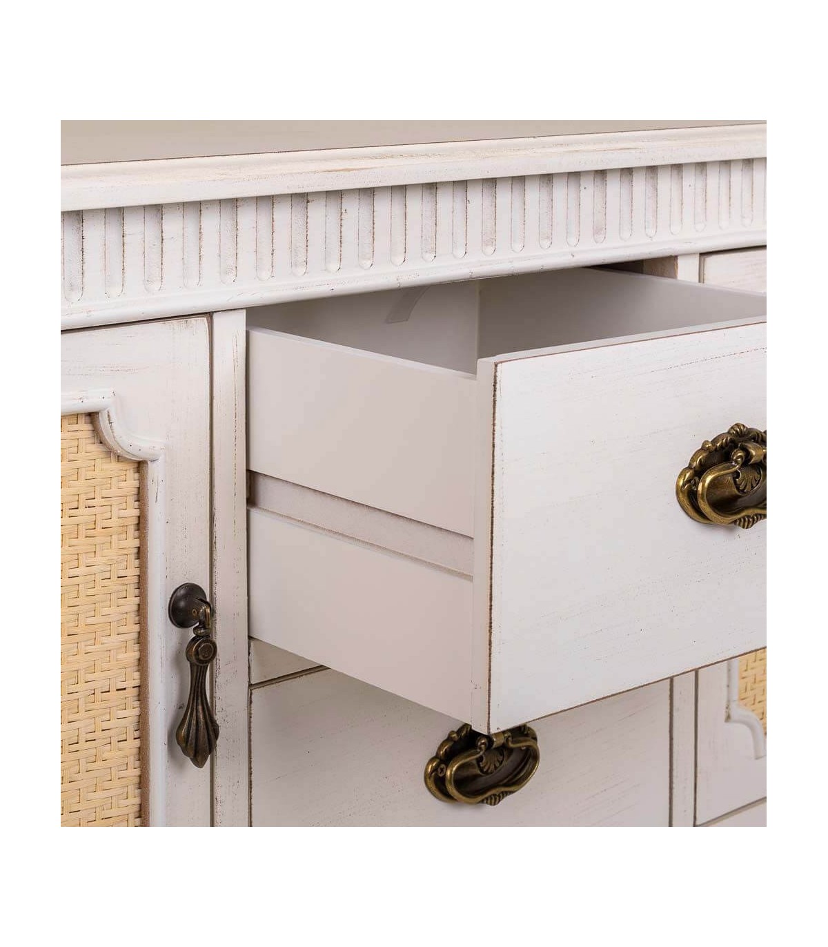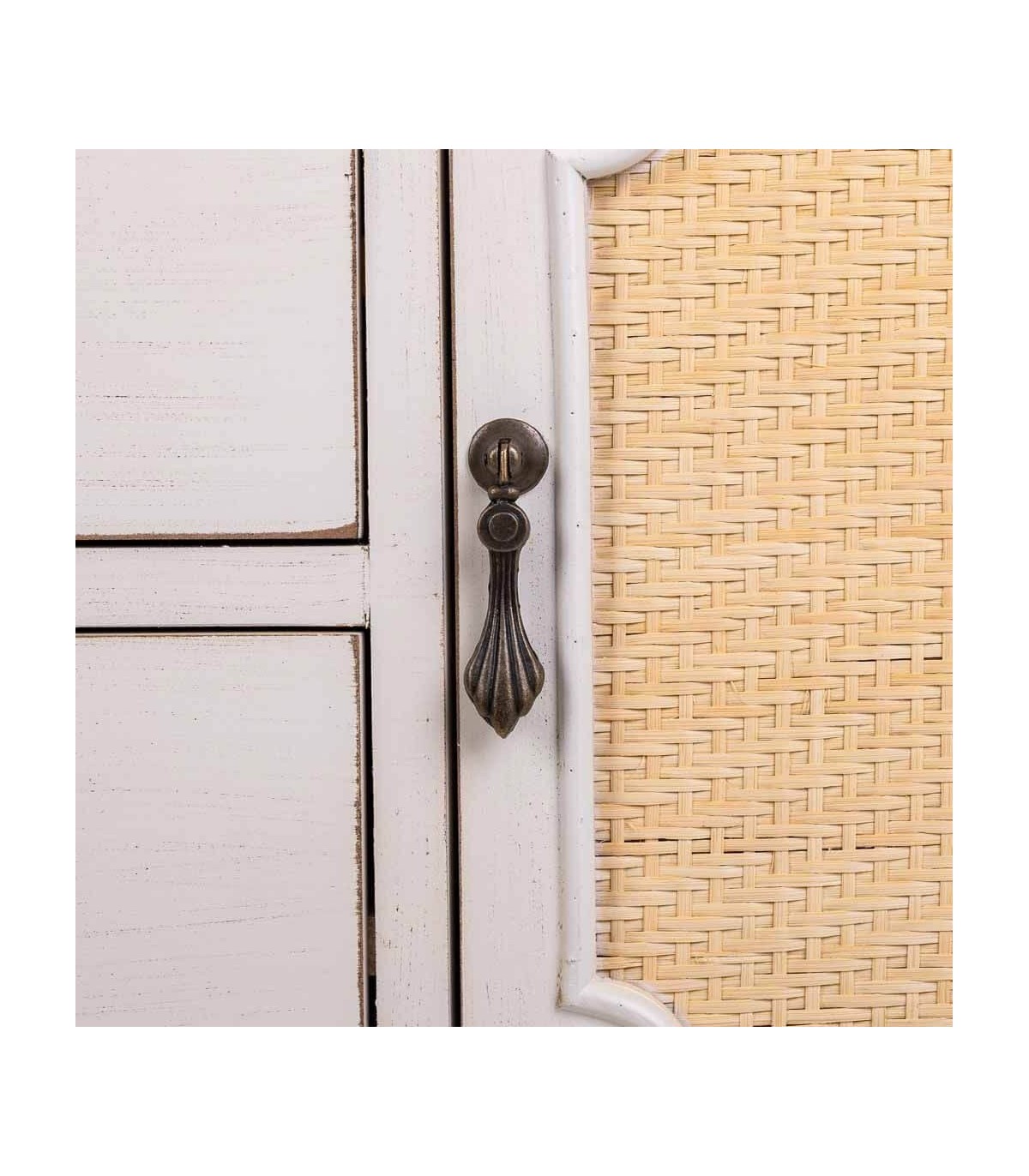Acabado, madera color blanco vintage, ratán natural, tiradores bronce.