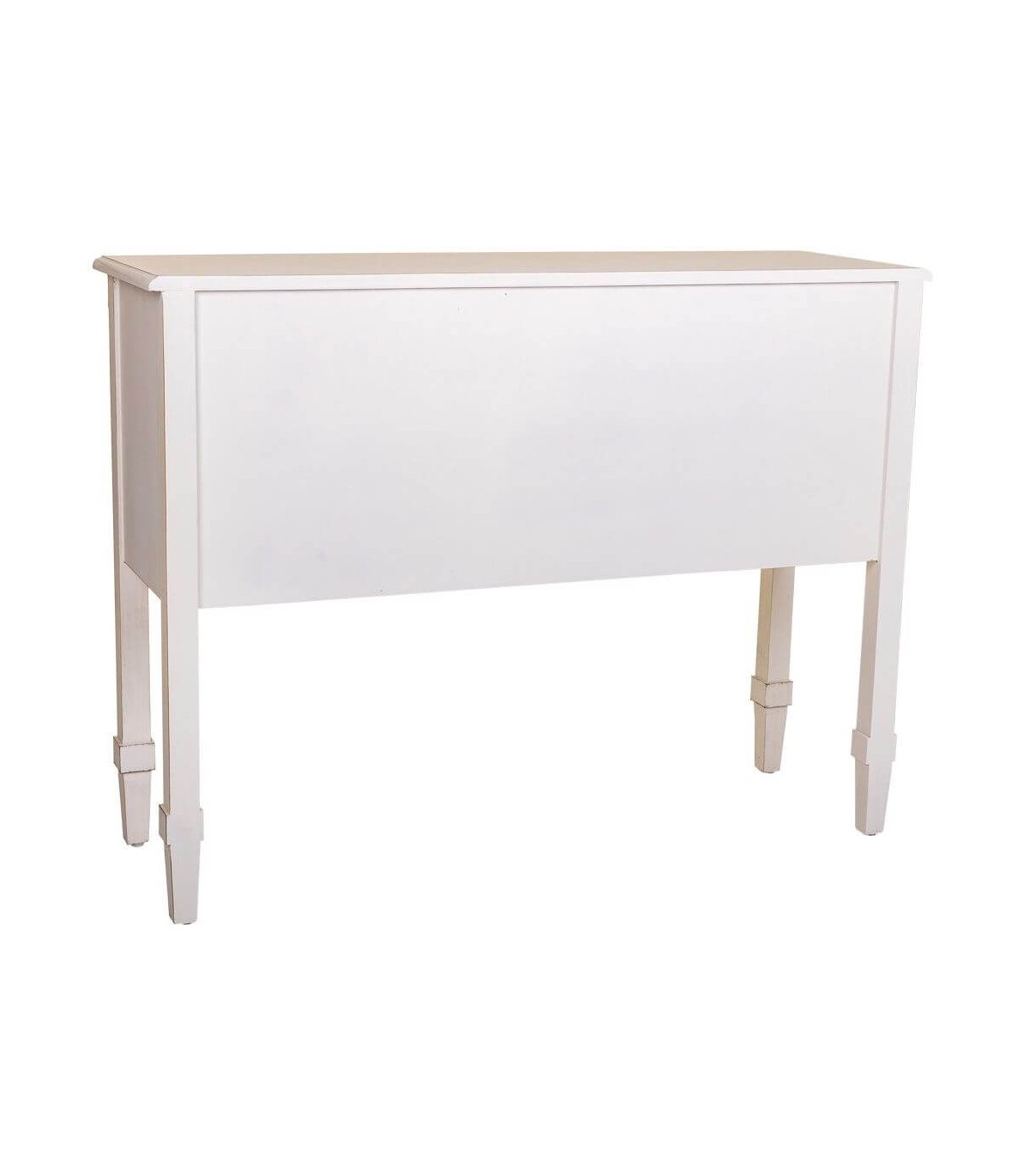 Consola de entrada realizada en madera acabado blanco envejecido y ratán natural un mueble de gran capacidad para espacios pequeños, de estilo neo romántico un mueble muy decorativo.