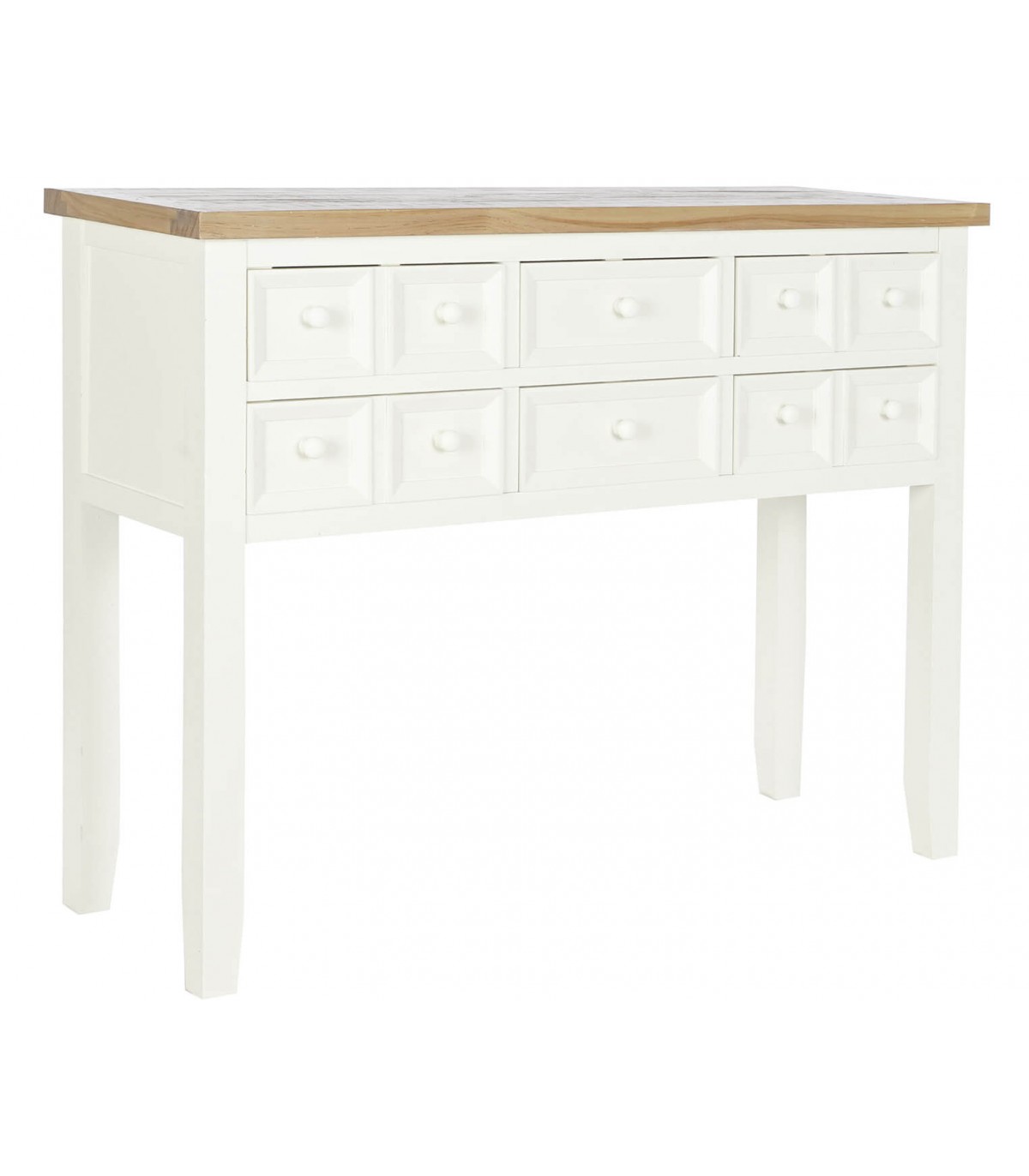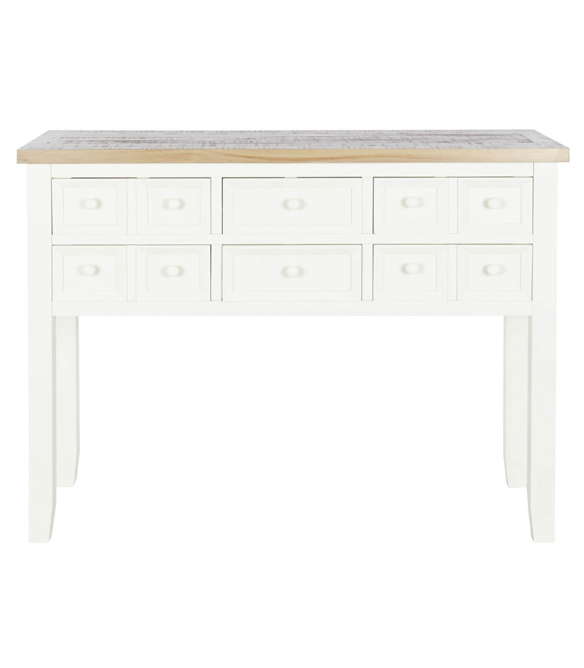 Consola de estilo rústico con 6 cajones realizado en madera de paulonia con la tapa natural y el resto lacado en blanco.