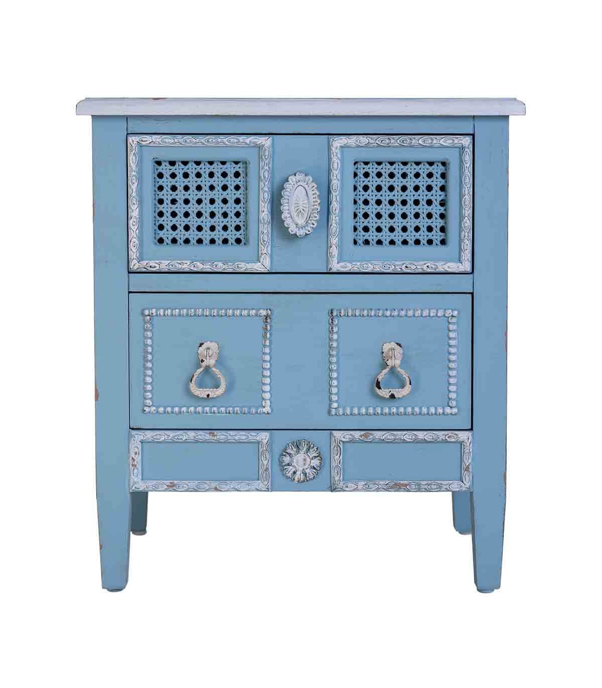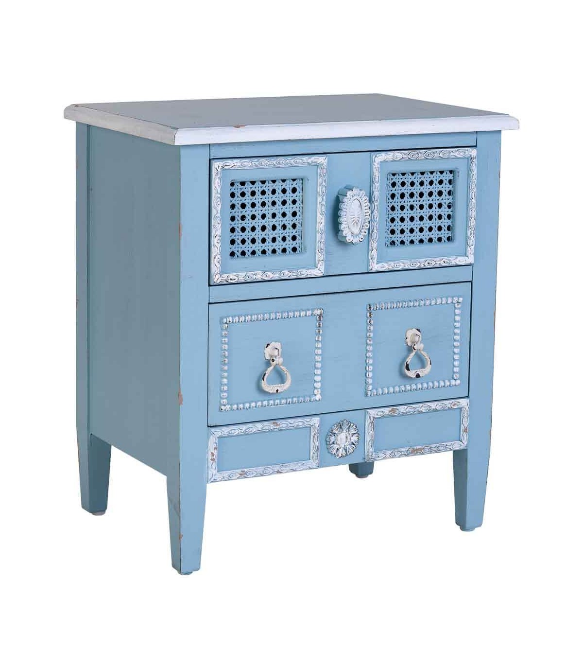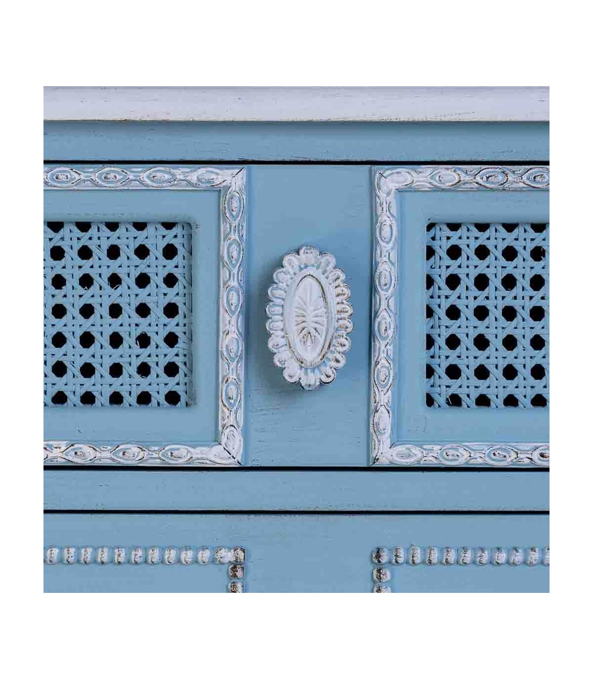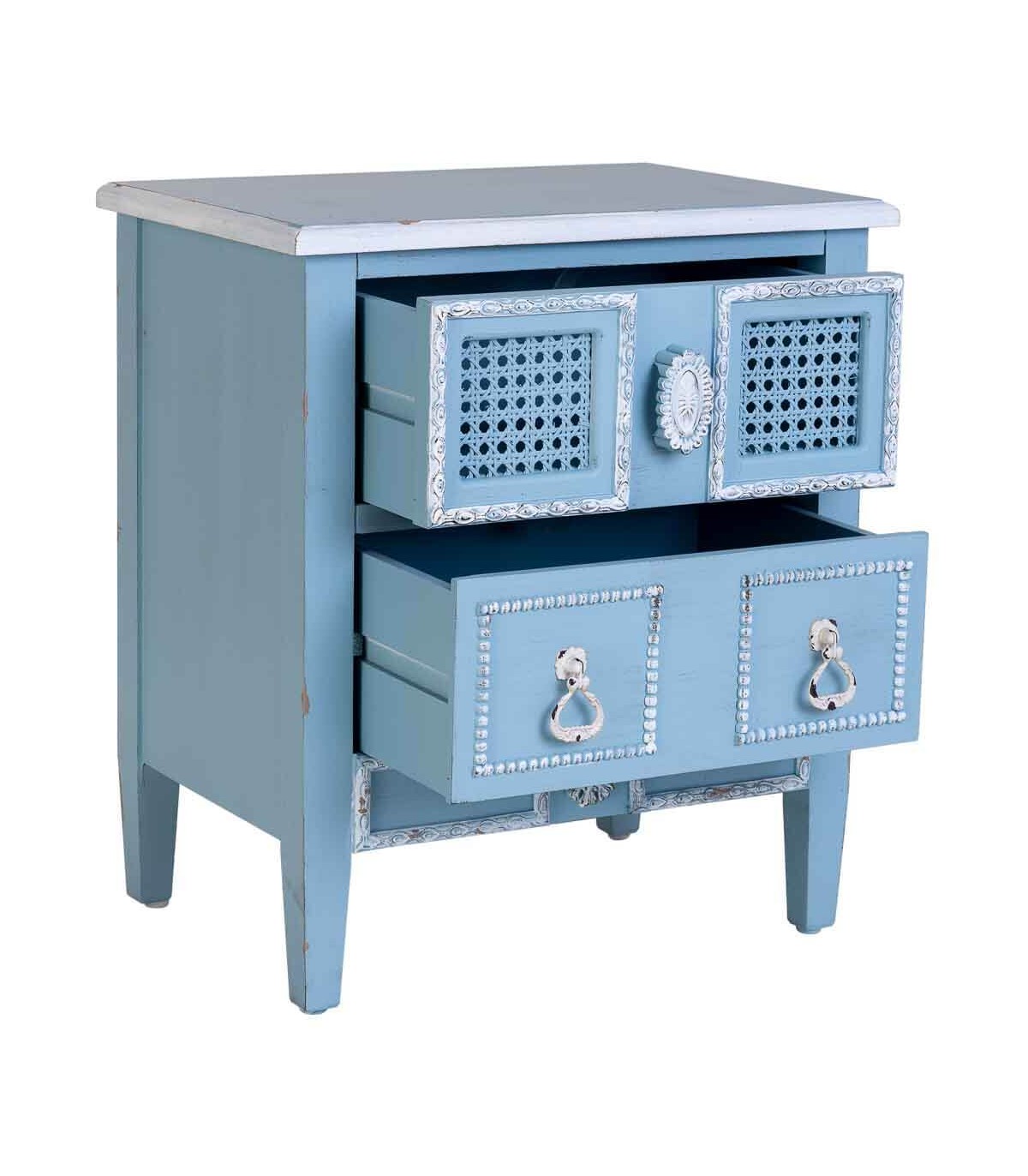Añade un toque de elegancia vintage con la Mesita de Noche Azul Patinada. Su diseño clásico con acabado artesanal combina madera maciza y detalles en ratán trenzado, aportando un aire romántico a cualquier dormitorio. Los cajones con molduras talladas y tiradores de metal realzan su encanto atemporal. Perfecta para aportar calidez y funcionalidad junto a la cama.