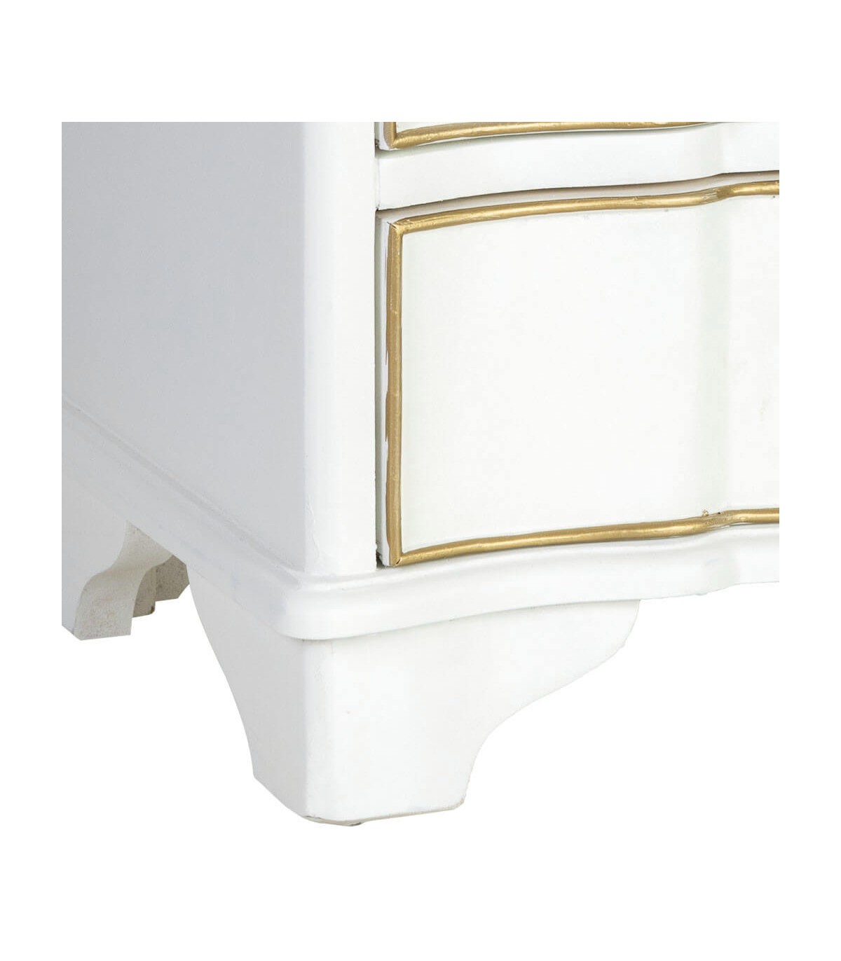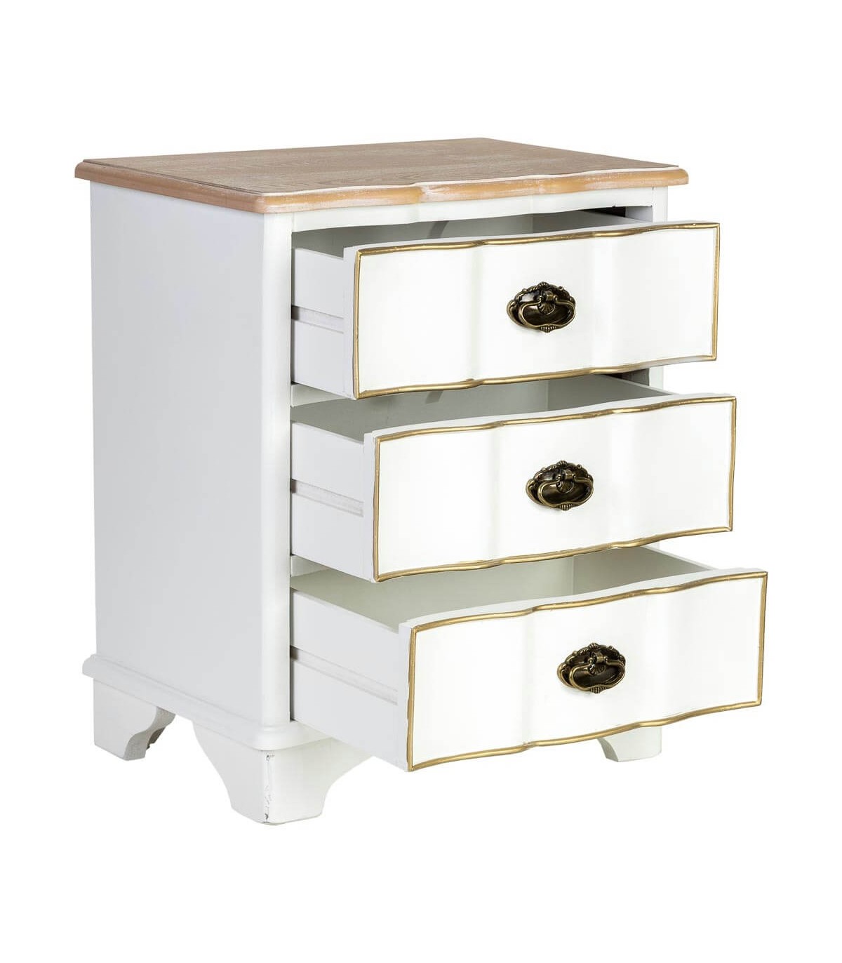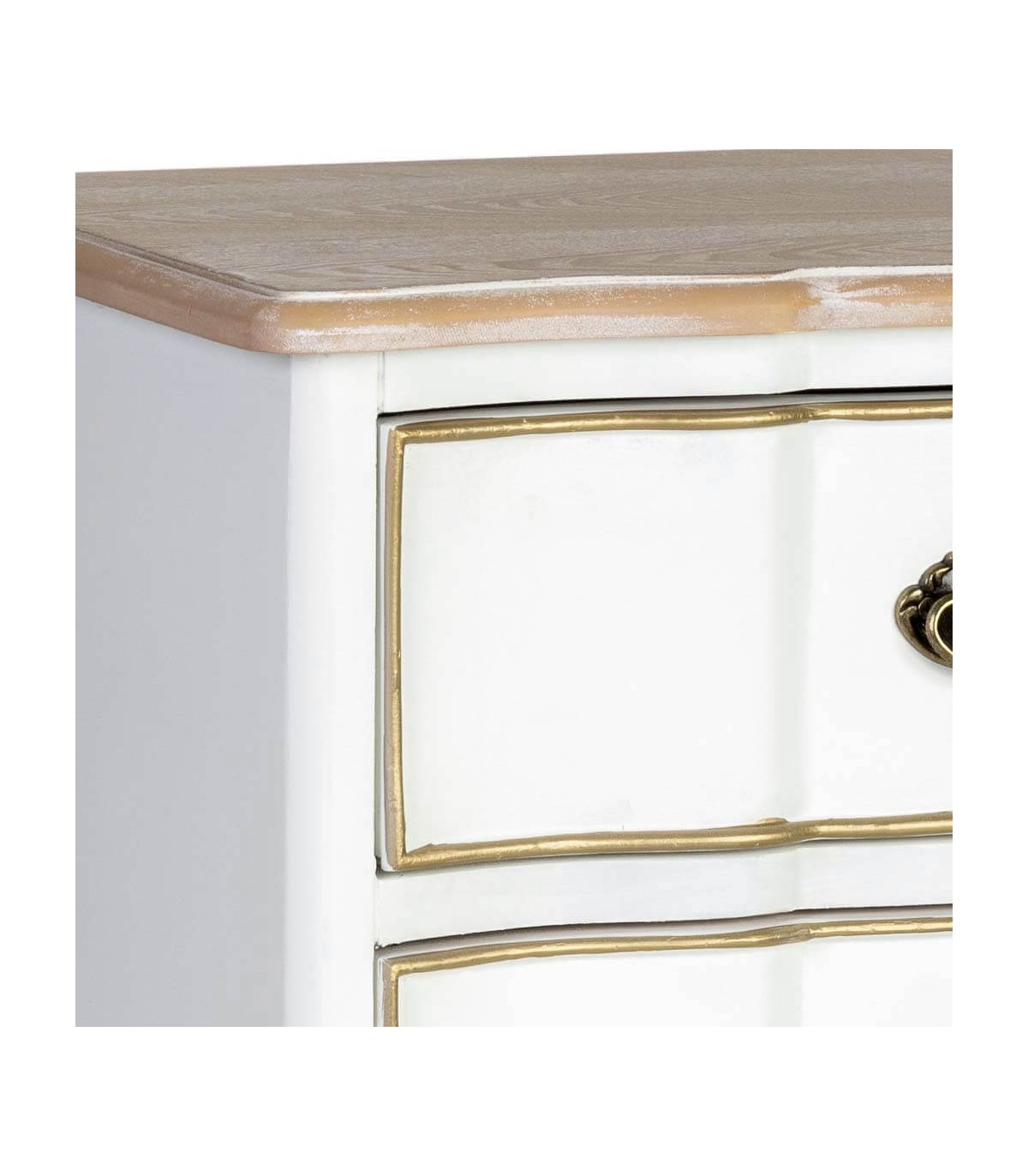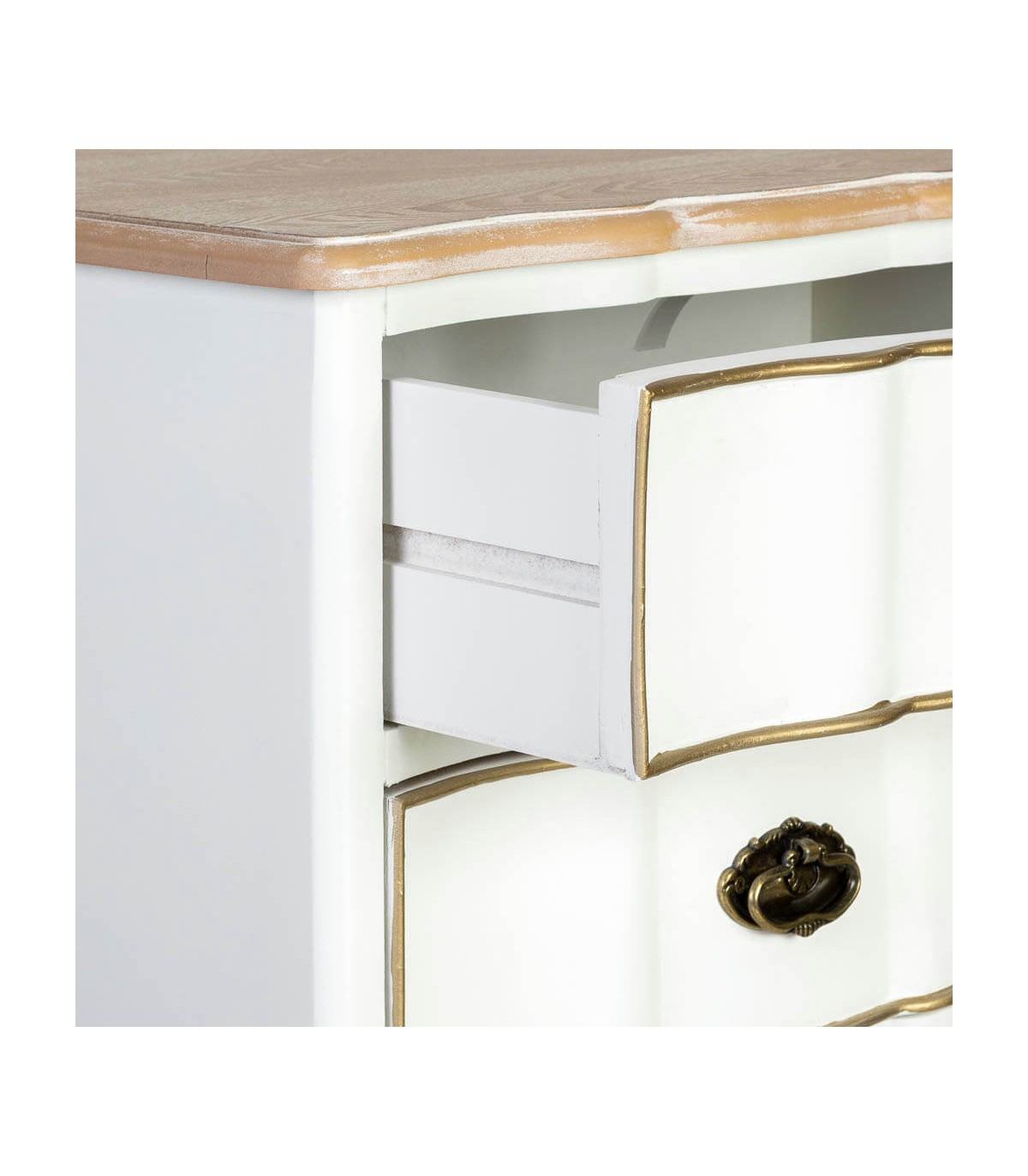 Esta mesita de noche combina elegancia clásica y funcionalidad con un diseño equilibrado. Su cuerpo lacado en blanco se realza con perfiles dorados en los cajones, aportando un toque distinguido y luminoso. La tapa de madera natural contrasta sutilmente con la base blanca, creando una estética armónica y atemporal.