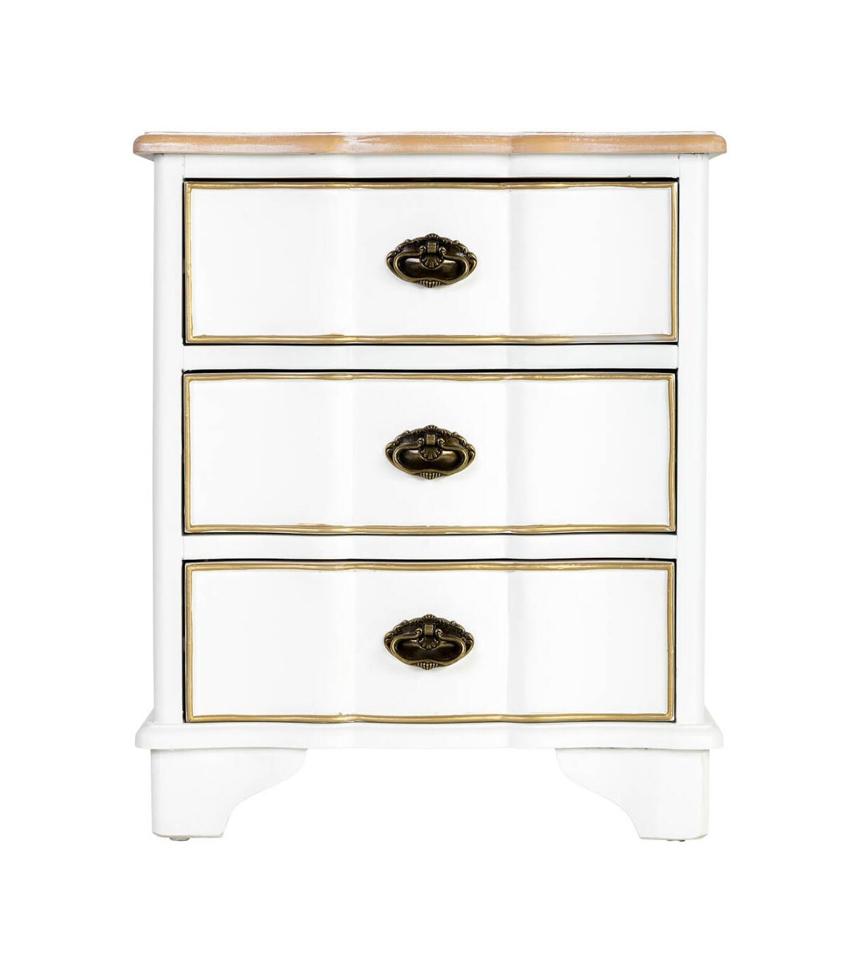 🕰️ Mesita de Noche Clásica con 3 Cajones – Blanco, Dorado y Madera Natural ✨