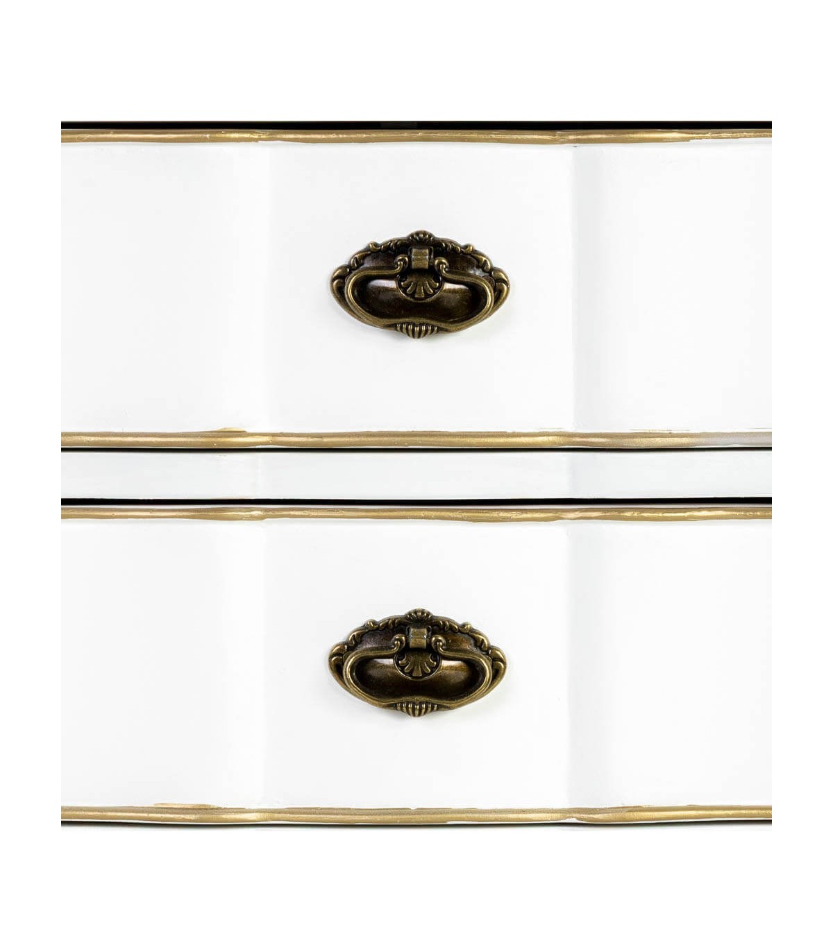 🎨 Acabado: Cuerpo lacado en blanco, tapa en madera natural, cajones perfilados en dorado y tiradores metálicos clásicos. Fabricación artesanal. entendemos las variaciones de tonalidad, tamaño y forma o ciertas imperfecciones (grietas, nudos, marcas) como un valor añadido que la convierten en pieza única.