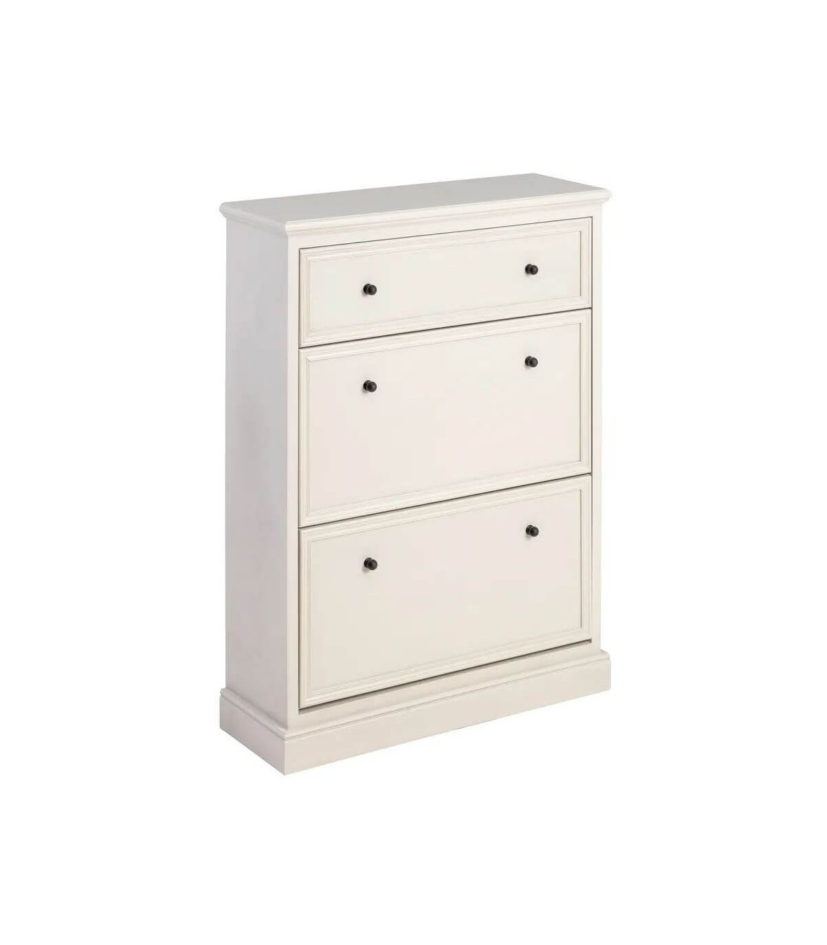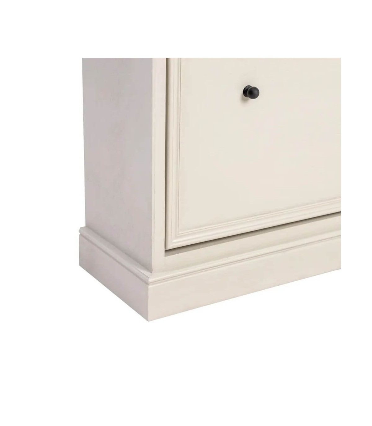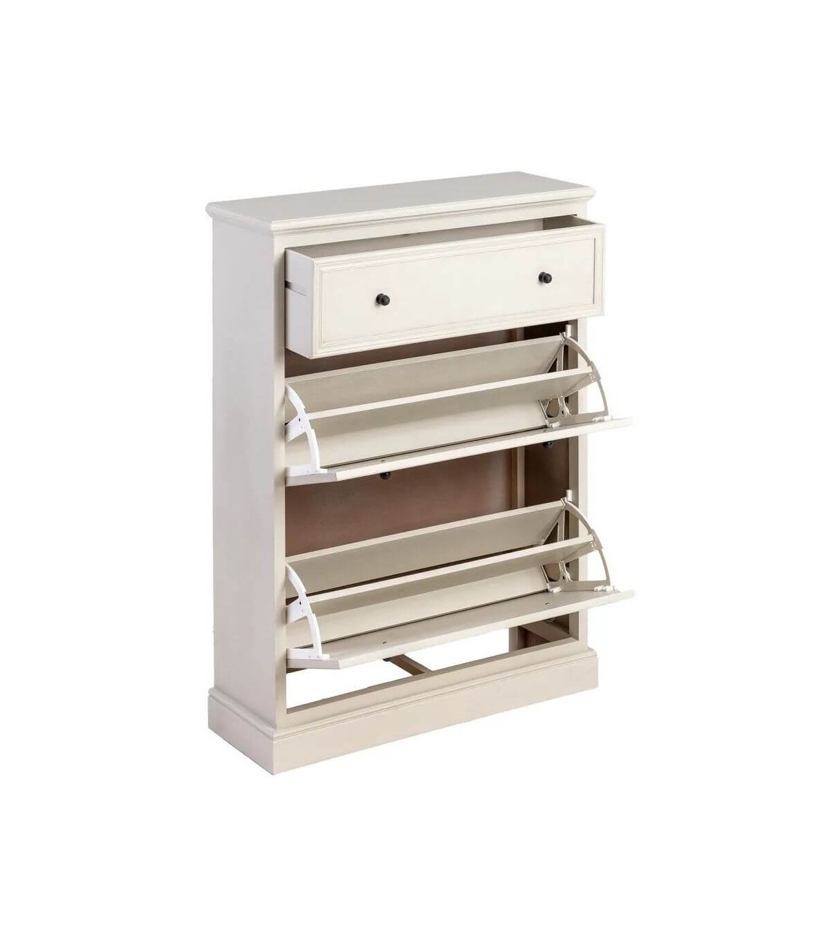 Este elegante mueble zapatero combina funcionalidad y estética en una pieza de estilo romántico con diseño limpio y sofisticado. Presenta dos puertas abatibles con gran capacidad interior y un práctico cajón superior, ideal para pequeños objetos o accesorios.