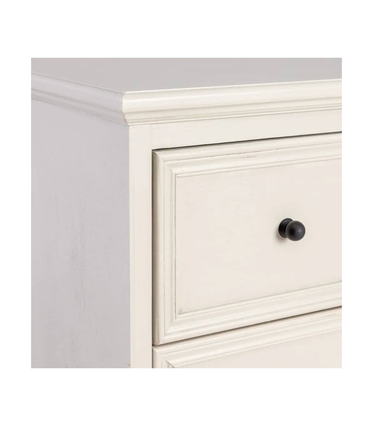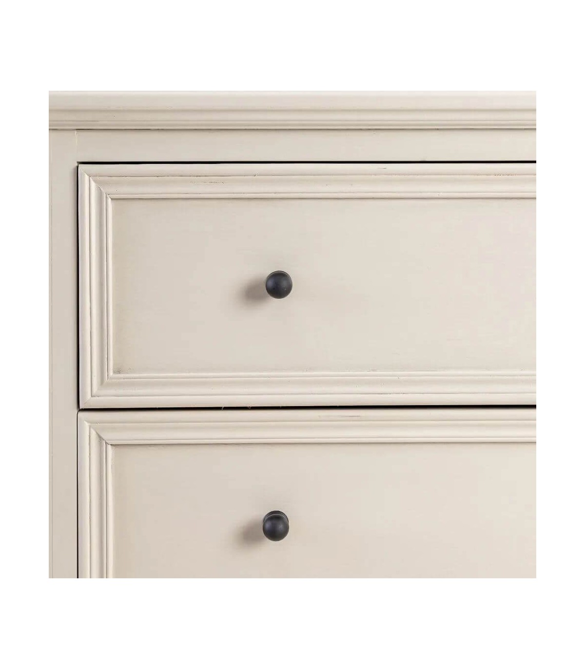Su estructura robusta en madera de pino y DM ofrece estabilidad y durabilidad, mientras que el acabado en gris muy claro aporta luminosidad y calidez. Los tiradores metálicos en negro contrastan con suavidad, realzando su aire clásico y delicado. Una solución perfecta para mantener el orden con encanto en dormitorios, vestidores o entradas.