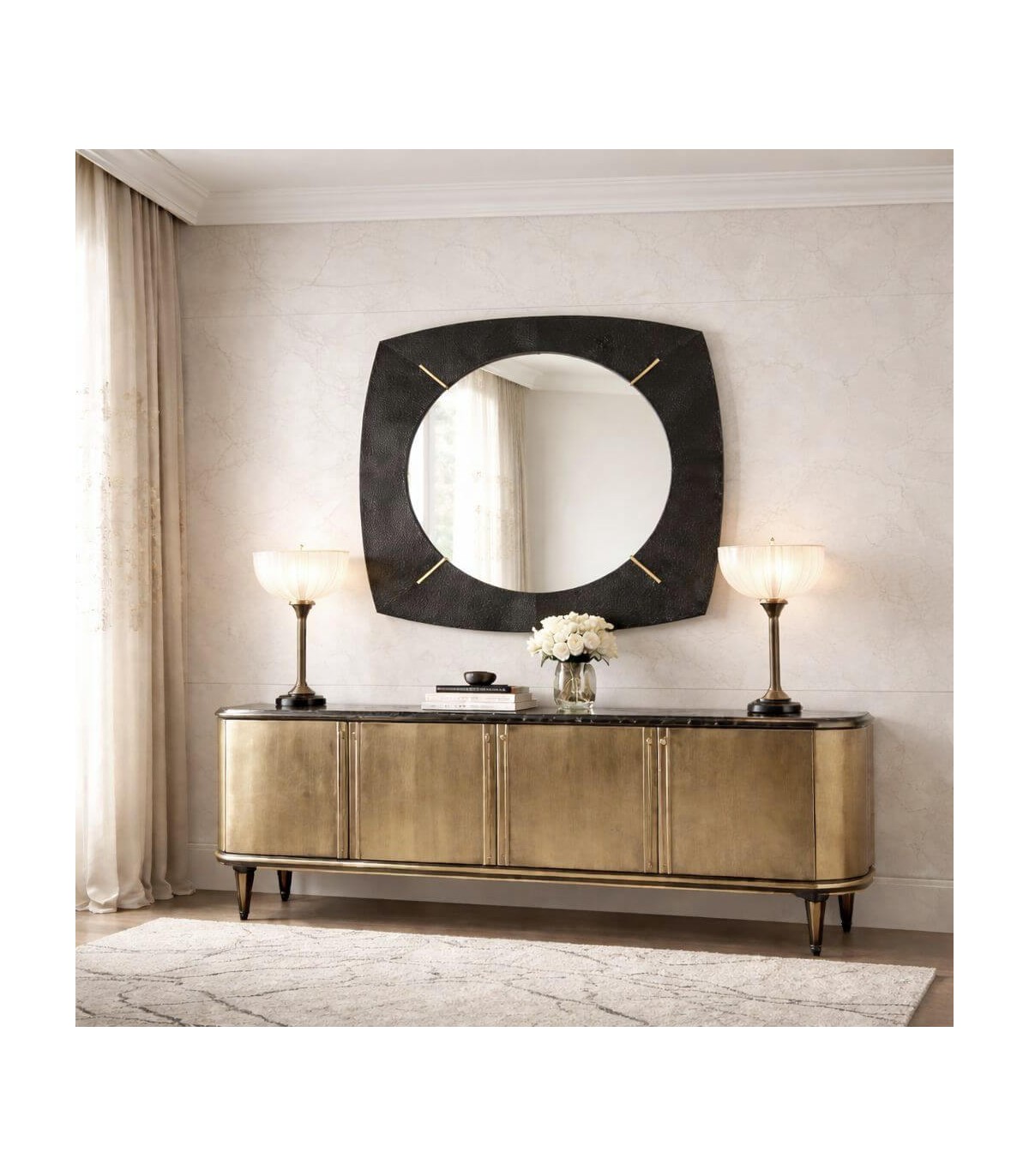El acabado metálico realza la luz natural y aporta profundidad al espacio. Es ideal para colocar en paredes principales de salones, recibidores o comedores. Funciona como punto focal en interiores contemporáneos, art déco o eclécticos.
