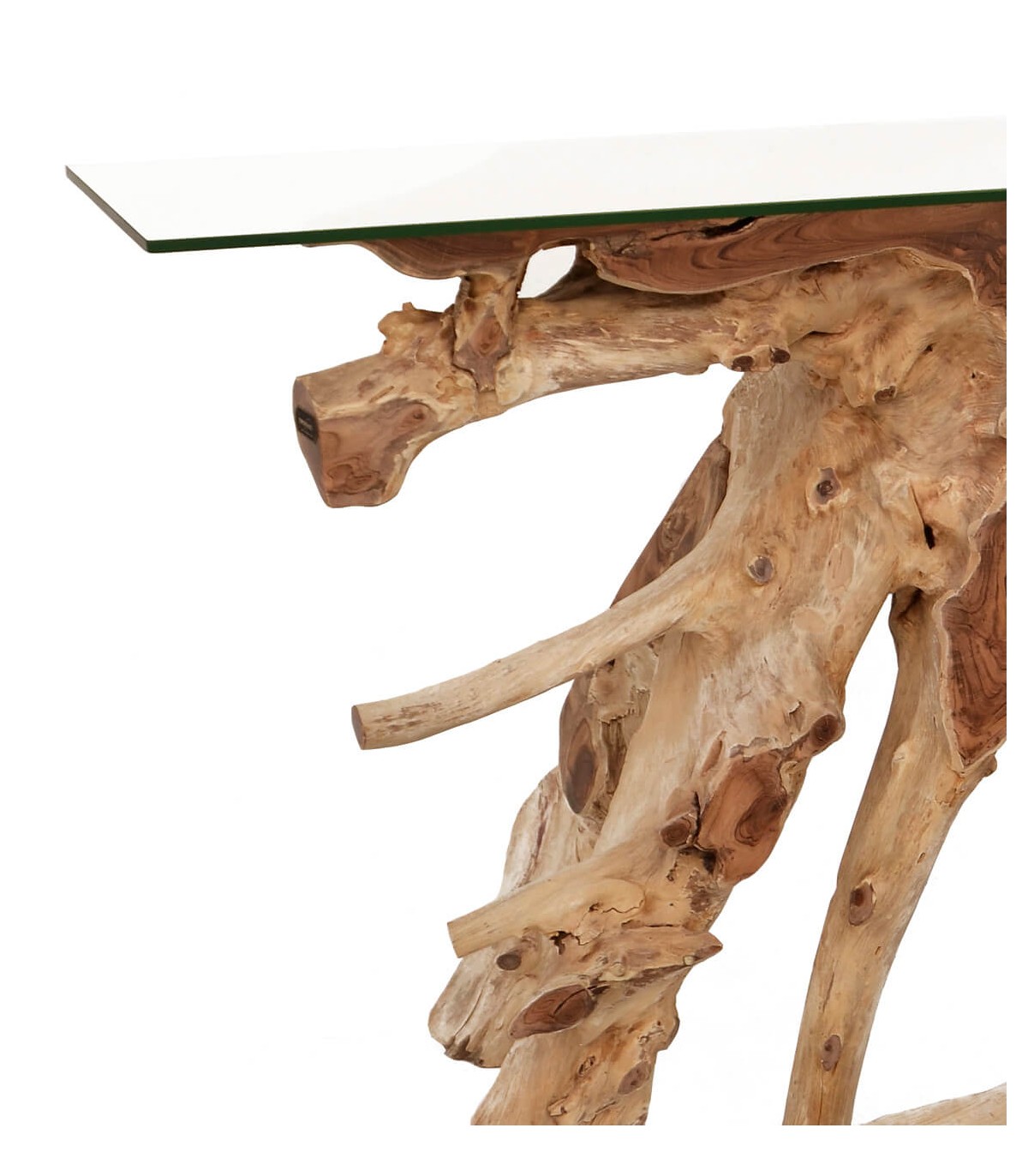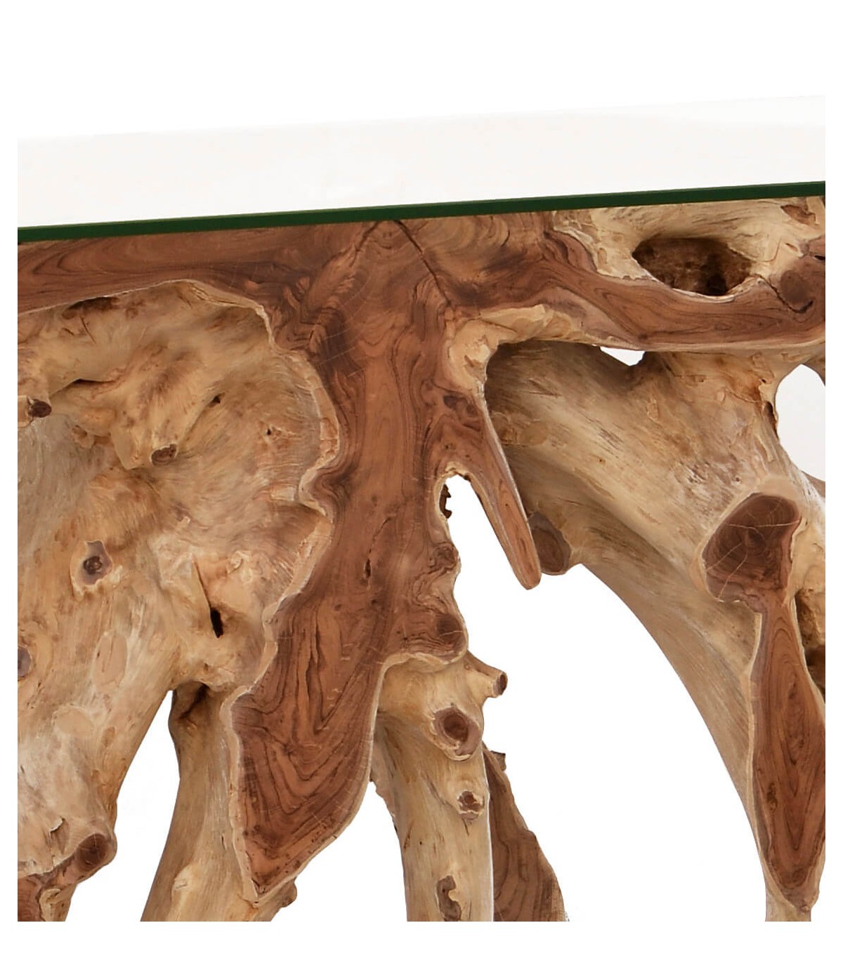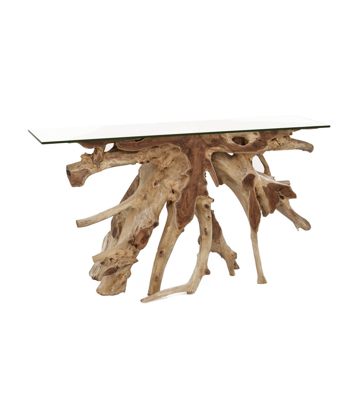 Su diseño combina la fuerza de la madera natural con la ligereza visual de la tapa de cristal. La fabricación artesanal respeta las formas originales de la raíz, realzando vetas, nudos y volúmenes irregulares. Una consola decorativa pensada para espacios amplios donde la madera cobra un papel central.