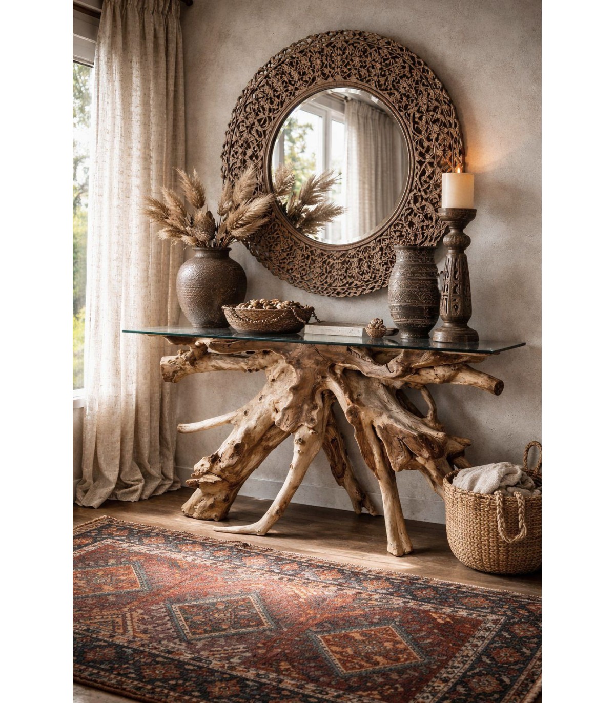 Consola de entrada de gran formato pensada para crear un impacto visual potente desde el primer momento con una estética étnica y natural. La raíz de teca se convierte en la protagonista absoluta, aportando una presencia escultórica y orgánica que hace cada pieza única.