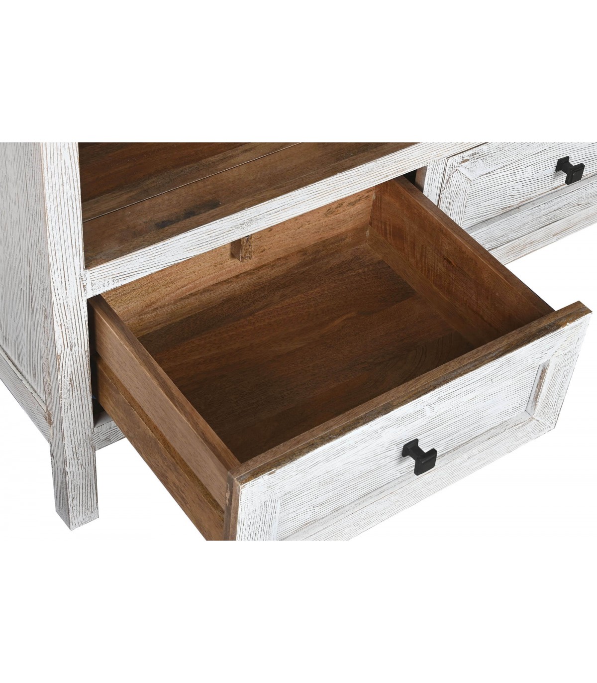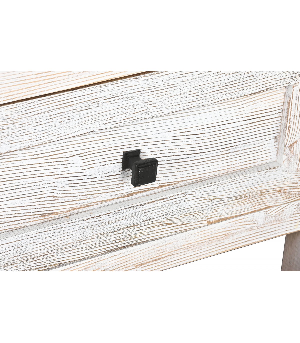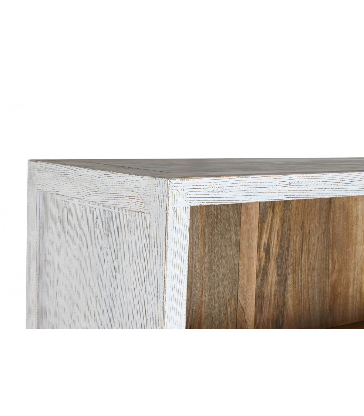 La trasera muestra el veteado natural de la madera, mientras que la estructura y los frentes lucen un precioso acabado blanco desgastado que resalta su carácter artesanal. Una pieza práctica, resistente y decorativa que encajará perfectamente en salones, despachos o dormitorios con un aire relajado y natural